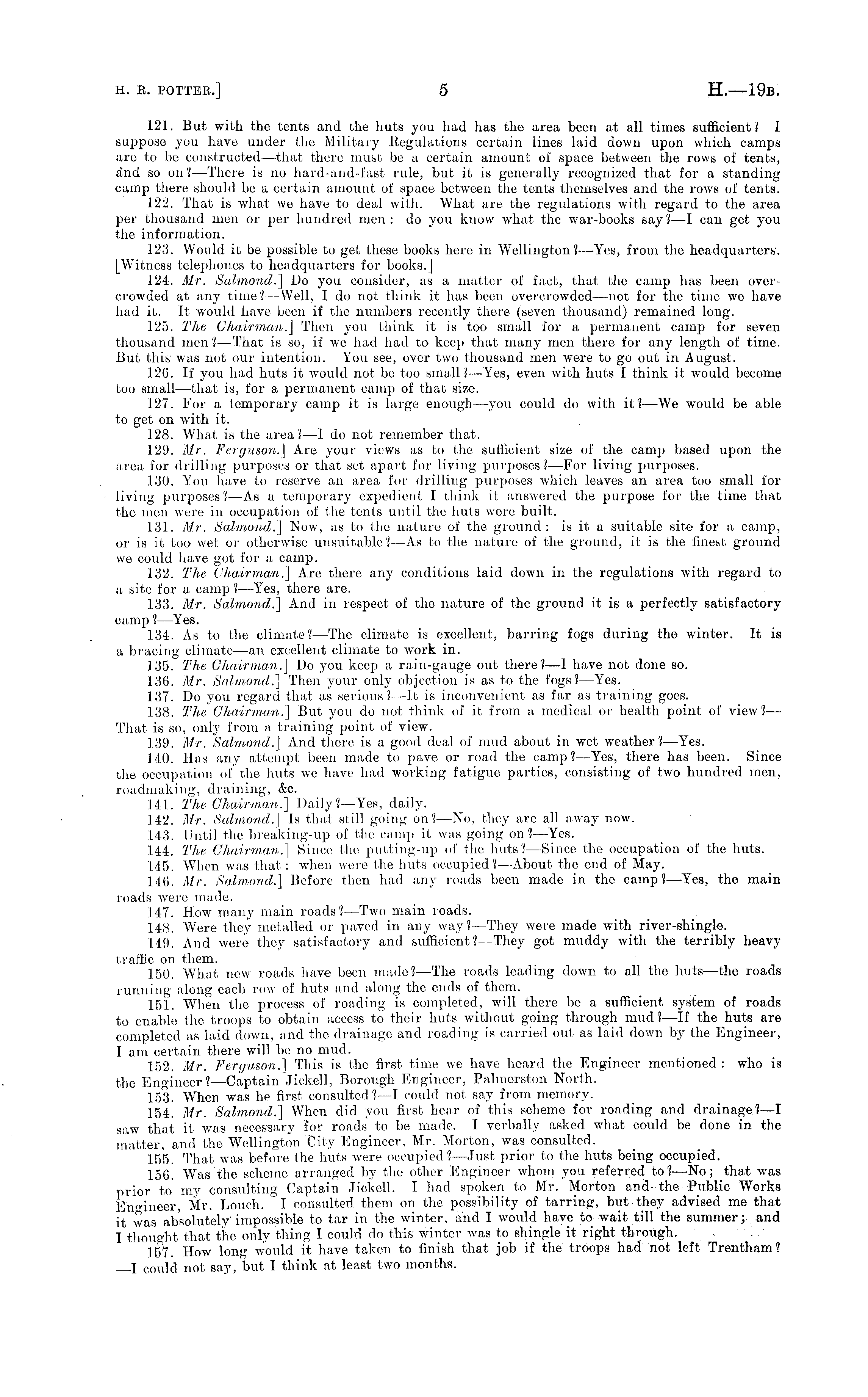 121. But with the tents and the huts you had has the area been at all times sufficient? I suppose you have under the Military Regulations certain lines laid down upon which camps are to be constructed—that there must be a certain amount of space between the rows of tents, and so on ?—There is no hard-and-fast rule, but it is generally recognized that for a standing camp there should be a certain amount of space between the tents themselves and the rows of tents. 122. That is what we have to deal with. What are the regulations with regard to the area per thousand men or per hundred men : do you know what the war-books say ?—I can get you the information. 123. Would it be possible to get these books here in Wellington?— Yes, from the headquarters. [Witness telephones to headquarters for books.] 124. Mr. Salmond.] Do you consider, as a matter of fact, that the camp has been overcrowded at any time?— Well, I do not think it has been overcrowded—not for the time we have had it. It would have been if the numbers recently there (seven thousand) remained long. 125. The Chairman.] Then you think it is too small for a permanent camp for seven thousand men?— That is so, if we had had to keep that many men there for any length of time. But this was not our intention. You see, over two thousand men were to go out in August. 126. If you had huts it would not be too small?— Yes, even with huts I think it would become too small—that is, for a permanent camp of that size. 127. For a temporary camp it is large enough—you could do with it?—We would be able to get on with it. 128. What is the area?—l do not remember that. 129. Mr. Ferguson.] Are your views as to the sufficient size of the camp based upon the area for drilling purposes or that set apart for living purposes?— For living purposes. 130. You have to reserve an area for drilling purposes which leaves an area too small for living purposes?—As a temporary expedient I think it answered the purpose for the time that the men were in occupation of the tents until the huts were built. 131. Mr. Salmond.] Now, as to the nature of the ground: is it a suitable site for a camp, or is it too wet or otherwise unsuitable? —As to the nature of the ground, it is the finest ground we could have got for a camp. 132. The Chairman.] Are there any conditions laid down in the regulations with regard to a site for a camp ?—Yes, there are. 133. Mr. Salmond.] And in respect of the nature of the ground it is a perfectly satisfactory camp ?—Yes. 134. As to the climate?— The climate is excellent, barring fogs during the winter. It is a bracing climate—an excellent climate to work in. 135. The Chairman.] Do you keep a rain-gauge out there?—l have not done so. 136. Mr. Salmond.] Then your only objection is as to the fogs? —Yes. 137. Do you regard that as serious?—lt is inconvenient as far as training goes. 138. The Chairman.] But you do not think of it from a medical or health point of view?— That is so, only from a training point of view. 139. Mr. Salmond.] And there is a good deal of mud about in wet weather?— Yes. 140. Has any attempt been made to pave or road the camp?— Yes, there has been. Since the occupation of the huts we have had working fatigue parties, consisting of two hundred men, roadmaking, draining, &c. 141. The Chairman.] Daily? —Yes, daily. 142. Mr. Salmond.] Is that still going on?—No, they are all away now. 143. Until the breaking-up of the camp it was going on? —Yes. 144. The Chairman.] Since the putting-up of the huts? —Since the occupation of the huts. 145. When was that: when were the huts occupied?— About the end of May. 146. Mr. Salmond.] Before then had any roads been made in the camp?— Yes, the main roads were made. 147. How many main roads?— Two main roads. 148. Were they metalled or paved in any way?— They were made with river-shingle. 149. And were they satisfactory and sufficient? —They got muddy with the terribly heavy traffic on them. 150. What new roads have been made? —The roads leading down to all the huts—the roads running along each row of huts and along the ends of them. 151. When the process of roading is completed, will there be a sufficient system of roads to enable the troops to obtain access to their huts without going through mud ?—lf the huts are completed as laid down, and the drainage and roading is carried out as laid down by the Engineer, I am certain there will be no mud. 152. Mr. Ferguson.] This is the first time we have heard the Engineer mentioned : who is the Engineer? —Captain Jickell, Borough Engineer, Palmerston North. 153. When was he first consulted? —I could not say from memory. 154. Mr. Salmond.] When did you first hear of this scheme for roading and drainage?—l saw that it was necessary Tor roads to be made. I verbally asked what could be done in the matter, and the Wellington City Engineer, Mr. Morton, was consulted. 155. That was before the huts were occupied?— Just prior to the huts being occupied. 156. Was the scheme arranged by the other Engineer whom you referred to?—No; that was prior to my consulting Captain Jickell. I had spoken to Mr. Morton and-the Public Works Engineer, Mr. Louch. I consulted them on the possibility of tarring, but they advised me that it was absolutely impossible to tar in the winter, and I would have to wait till the summer; and I thought that the only thing I could do this winter was to shingle it right through. 157. How long would it have taken to finish that job if the troops had not left Trentham? I could not say, but I think at least two months.