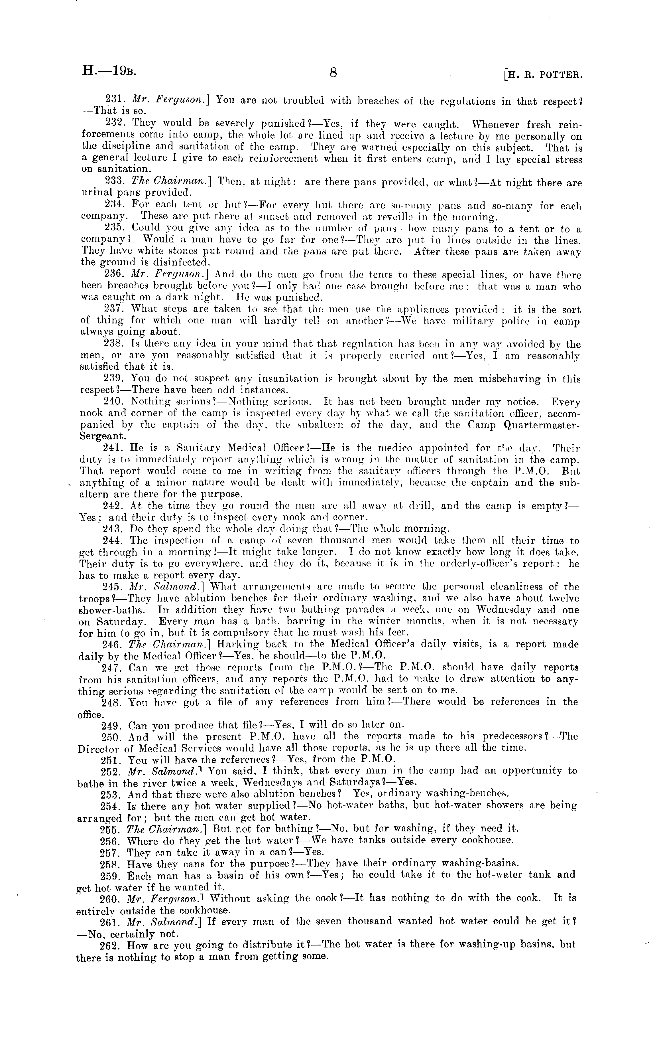 231. Mr. Ferguson.] You are not troubled with breaches of the regulations in that respect? —That is so. 232. They would be severely punished?— Yes, if they were caught. Whenever fresh reinforcements come into camp, the whole lot are lined up and receive a lecture by me personally on the discipline and sanitation of the camp. They are warned especially on this subject. That is a general lecture I give to each reinforcement when it first enters camp, and I lay special stress on sanitation. 233. The Chairman.] Then, at night: are there pans provided, or what?—At night there are urinal pans' provided. 234. For each tent or hut? —For every hut there are so-many pans and so-many for each company. These are put there at sunset and removed at reveille in the morning. 235. Could you give any idea as to the number of pans —how many pans to a tent or to a company? Would a man have to go far for one?— They are put in lines outside in the lines. They have white stones put round and the pans are put there. After these pans are taken away the ground is disinfected. 236. Mr. Ferguson.] And do the men go from the tents to these special lines, or have there been breaches brought before you ?—I only had one case brought before me : that was a man who was caught on a dark night. He was punished. 237. What steps are taken to see that the men use the appliances provided : it is the sort of thing for which one man will hardly tell on another ?—We have military police in camp always going about. 238. Is there any idea in your mind that that, regulation has been in any way avoided by the men, or are you reasonably satisfied that it is properly carried out?— Yes, I am reasonably satisfied that it is. 239. You do not suspect any insanitation is brought about by the men misbehaving in this respect?— There have been odd instances. 240. Nothing serious?— Nothing serious. It has not been brought under my notice. Every nook and corner of the camp is inspected every day by what we call the sanitation officer, accompanied by the captain of the day, the subaltern of the day, and the Camp QuartermasterSergeant. 241. He is a Sanitary Medical Officer? —He is the medico appointed for the day. Their duty is to immediately report anything which is wrong in the matter of sanitation in the camp. That report would come to me in writing from the sanitary officers through the P.M.O. But anything of a minor nature would be dealt with immediately, because the captain and the subaltern are there for the purpose. 242. At the time they go round the men are all away at, drill, and the camp is empty?— Yes; and their duty is to inspect every nook and corner. 243. Do they spend the whole day doing that?— The whole morning. 244. The inspection of a camp of seven thousand men would take them all their time to get through in a morning?—lt might take longer. Ido not know exactly how long it does take. Their duty is to go everywhere, and they do it, because it is in the orderly-officer's report: he has to make a report every day. 245. Mr. Salmond.] What arrangements are made to secure the personal cleanliness of the troops?— They have ablution benches for their ordinary washing, and we also have about twelve shower-baths. In- addition they have two bathing parades a week, one on Wednesday and one on Saturday. Every man has a bath, barring in the winter months, when it is not necessary for him to go in, but it is compulsory that he must wash his feet. 246. The Chairman.] Harking back to the Medical Officer's daily visits, is a report made daily by the Medical Officer? —Yes, he should —to the P.M.O. 247. Can we get those reports from the P.M.O. ?—The P.M.O. should have daily reports from his sanitation officers, and any reports the P.M.O. had to make to draw attention to anything serious regarding the sanitation of the camp would be sent on to me. 248. You have got a file of any references from him?— There would be references in the office. 249. Can you produce that file? —Yes, I will do so later on. 250. And will the present P.M.O. have all the reports made to his predecessors?— The Director of Medical Services would have all those reports, as he is up there all the time. 251. You will have the references?— Yes, from the P.M.O. 252. Mr. Salmond.] You said, I think, that every man in the camp had an opportunity to bathe in the river twice a week, Wednesdays and Saturdays?— Yes. 253. And that there were also ablution benches? —Yes, ordinary washing-benches. 254. Is- there any hot water supplied?—No hot-water baths, but hot-water showers are being arranged for; but the men can get hot water. 255. The Chairman.] But not for bathing?—No, but for washing, if they need it. 256. Where do they get the hot water? —We have tanks outside every cookhouse. 257. They can take it away in a can? —Yes. 258. Have they cans for the purpose?— They have their ordinary washing-basins. 259. Each man has a basin of his own? —Yes; he could take it to the hot-water tank and get hot water if he wanted it. 260. Mr. Ferguson.] Without asking the cook?—lt has nothing to do with the cook. It is entirely outside the cookhouse. 261. Mr. Salmond.] If every man of the seven thousand wanted hot water could he get it? —No, certainly not. 262. How are you going to distribute it? —The hot water is there for washing-up basins, but there is nothing to stop a man from getting some.