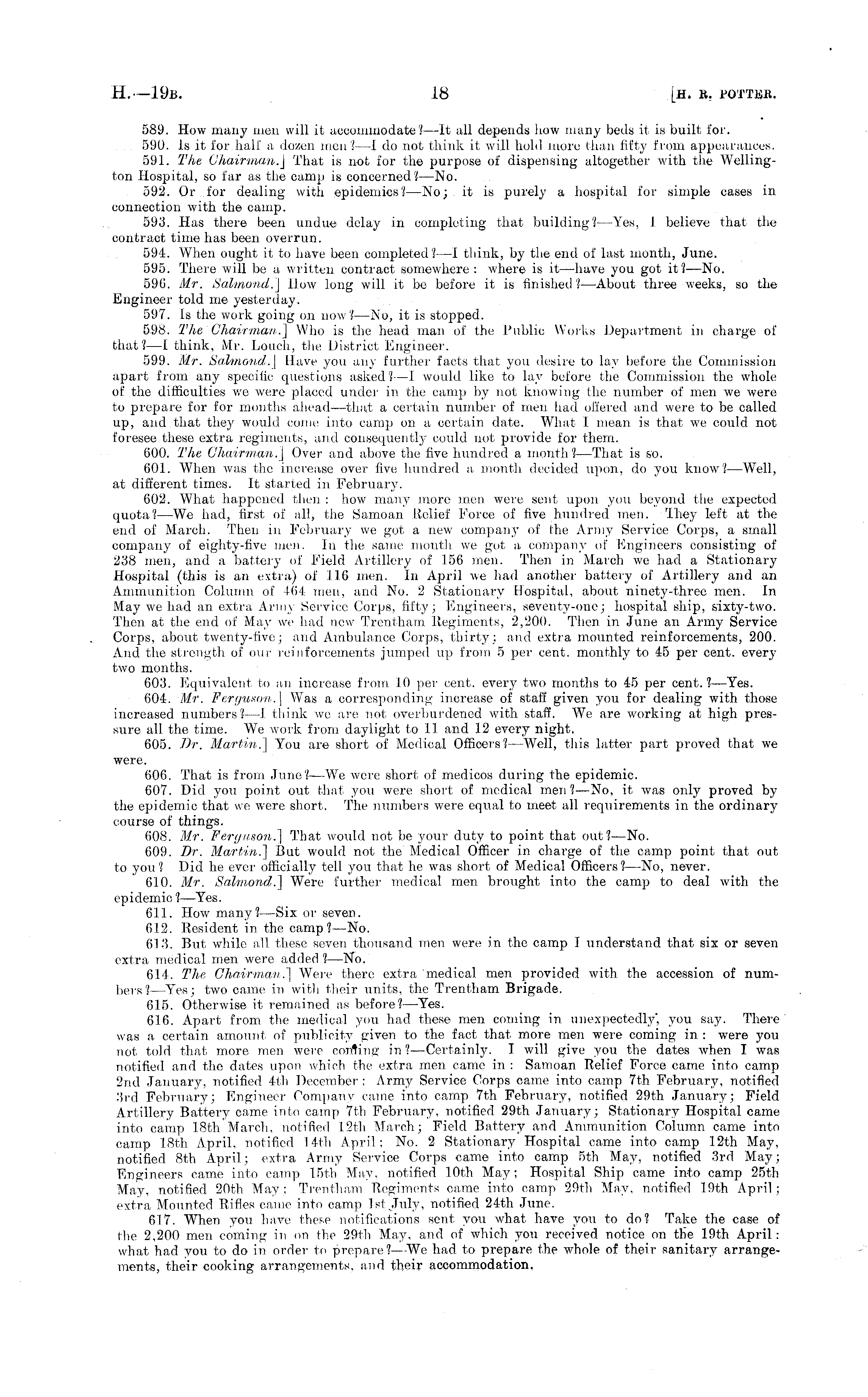 589. How many men will it accommodate? —It all depends how many beds it is built for. 590. Is it for half a dozen men ?—I do not think it, will hold more than fifty from appearances. 591. The Chairman.] That is not for the purpose of dispensing altogether with the Wellington Hospital, so far as the camp is concerned ? —No. 592. Or for dealing with epidemics? —No; it is purely a hospital for simple cases in connection with the camp. 593. Has there been undue delay in completing that building? —Yes, 1 believe that the contract time has been overrun. 594. When ought it to have been completed ?—I think, by the end of last month, June. 595. There will be a written contract somewhere : where is it—have you got it?— No. 596. Mr. Salmond.] How long will it be before it is finished? —About three weeks, so the Engineer told me yesterday. 597. Is the work going on now?—No, it is stopped. 598. The Chairman.] Who is the head man of the Public Works Department in charge of that? —I think, Mr. Louch, the District Engineer. 599. Mr. Salmond.] Have you any further facts that you desire to lay before the Commission apart from any specific questions asked?—l would like to lay before the Commission the whole of the difficulties we were placed under in the camp by not knowing the number of men we were to prepare for for months ahead—that, a certain number of men had offered and were to be called up, and that they would come into camp on a certain date. What I mean is that we could not foresee these extra regiments, and consequently could not provide for- them. 600. The Chairman.] Over and above the five hundred a month?— That is so. 601. When was the increase over five hundred a month decided upon, do you know?— Well, at different times. It started in February. 602. What happened then : how many more men were sent upon you beyond the expected quota?—We had, first of all, the Samoan Relief Force of five hundred men. Ihey left at the end of March. Then in February we got a new company of the Army Service Corps, a small company of eighty-five men. In the same month, we got a company of I.ngineers consisting of 238 men, and a battery of Field Artillery of 156 men. Then in March we had a Stationary Hospital (this is an extra) of 116 men. In April we had another battery of Artillery and an Ammunition Column of 464 men, and No. 2 Stationary Hospital, about ninety-three men. In May we had an extra Army Service Corps, fifty; Engineers, seventy-one; hospital ship, sixty-two. Then at the end of May we had new Trentham Regiments, 2,200. Then in June an Army Service Corps, about twenty-five; and Ambulance Corps, thirty; and extra mounted reinforcements, 200. And the strength of our reinforcements jumped up from 5 per cent, monthly to 45 per cent, every two months. 603. Equivalent to an increase from 10 per cent, every two mouths to 45 per cent.? —Yes. 604. Mr. Ferguson. \ Was a corresponding increase of staff given you for dealing with those increased numbers? —I think we are not overburdened with staff. We are working at high pressure all the time. We work from daylight to II and 12 every night. 605. Dr. Martin.] You are short of Medical Officers? —Well, this latter part proved that we were. 606. That is from June?—We were short of medicos during the epidemic. 607. Did you point out that you were short of medical men?—No, it was only proved by the epidemic that we were short. The numbers were equal to meet all requirements in the ordinary course of things. 608. Mr. Ferguson.] That would not be your duty to point that out? —No. 609. Dr. Martin.] But would not the Medical Officer in charge of the camp point that out to you? Did he ever officially tell you that he was short of Medical Officers?—No, never. 610. Mr. Salmond.] Were further medical men brought into the camp to deal with the epidemic I —Yes. 611. How many?— Six or seven. 612. Resident in the camp?— No. 613. But while all these seven thousand men were in the camp I understand that six or seven extra medical men were added ? —No. 614. The Chairman.] Were there extra medical men provided with the accession of numbers ?—Yes; two came in with their units, the Trentham Brigade. 615. Otherwise it remained as before? —Yes. 616. Apart from the medical you had these men coming in unexpectedly" you say. There was a certain amount of publicity given to the fact that more men were coming in : were you not told that more men were corrling in ?—Certainly. I will give you the dates when I was notified and the dates upon which the extra men came in : Samoan Relief Force came into camp 2nd January, notified 4th December : Army Service Corps came into camp 7th February, notified 3rd February; Engineer Company came into camp 7th February, notified 29th January; Field Artillery Battery came into camp 7th February, notified 29th January; Stationary Hospital came into camp 18th March, notified 12th March; Field Battery and Ammunition Column came into camp 18th April, notified 14th April; No. 2 Stationary Hospital came into camp 12th May, notified Bth April; extra Army Service Corps came into camp sth May, notified 3rd May; Engineers came into camp 15th May, notified 10th May; Hospital Ship came into camp 25th May, notified 20th May; Trentham Regiments came into camp 29th May, notified 19th April; extra Mounted Rifles came into camp Ist July, notified 24th June. 617. When you have these notifications sent you what have you to do? Take the case of the 2,200 men coming in on the 29th May, and of which you received notice on the 19th April : what had you to do in order to prepare ?—-We had to prepare the whole of their sanitary arrangements, their cooking arrangements, and their accommodation.