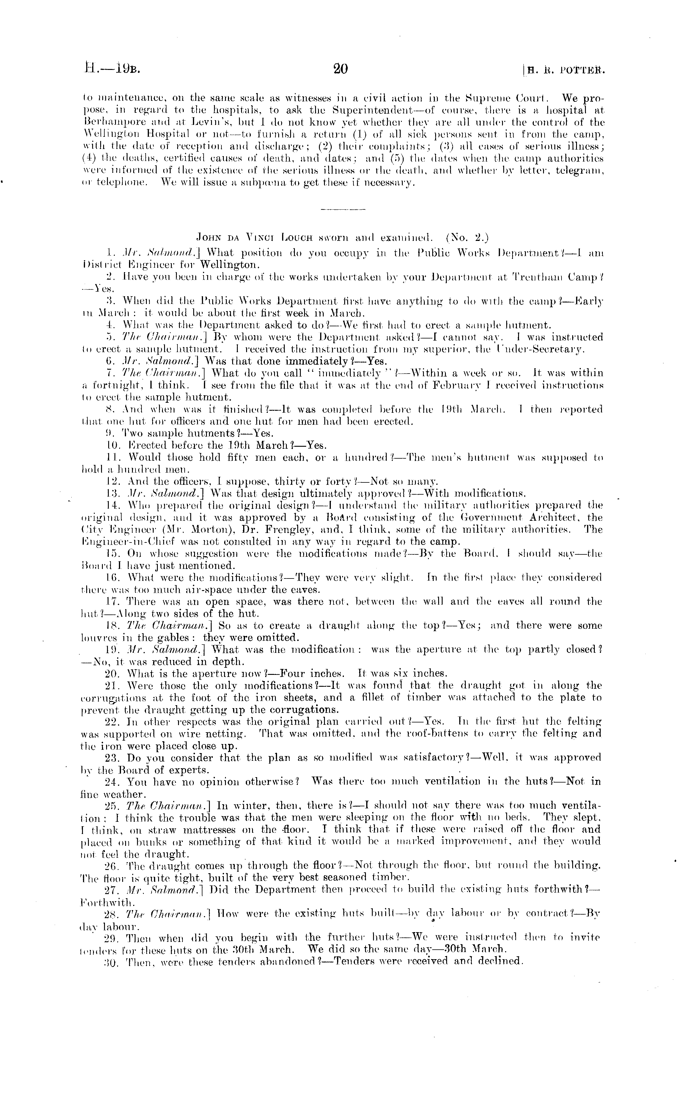 to maintenance, on the same scale as witnesses in a civil action in the Supreme Court. We propose, in regard to the hospitals, to ask the Superintendent —of course, there is a hospital at Berhampore and at Levin's, but 1 do not know yet whether they are all under the control of the Wellington Hospital or not—to furnish a return (1) of all sick persons sent in from the camp, with the date of reception and discharge; (2) their complaints; (3) all cases of serious illness; (4) the deaths, certified causes of death, and dates; and (5) the dates when the camp authorities were informed of the existence of the serious illness or the death, and whether by letter, telegram, or telephone. We will issue a subpoena to get these if necessary. John da VINOI Louch sworn and examined. (No. 2.) 1. Mr. Salmond.] What position do you occupy in the Public Works Department?—! am District Engineer for Wellington. 2. Have you been in charge of the works undertaken by your Department at Trentham Camp? —Yes. 3. When did the Public Works Department first have anything to do with the camp?— Early in March : it would be about the first week in March. 4. What was the Department asked to do?—We first had to erect a sample hutment. 5. The Chairman.] By whom were the Department asked?—l cannol say. I was instructed to erect a sample hutment. 1 received the instruction from my superior, the Under-Secretary. 6. Mr. Salmond.] Was that done immediately?— Yes. 7. The Chairman.] What do you call " immediately "?—Within a week or so. ll was within a fortnight, 1 think. I see from the file that il was al the end of February 1 received instructions to erect the sample hutment. 8. And when was it finished?—lt was completed before the L9th March. I then reported that one hut for officers and one hut for men had been erected. 9. Two sample hutments? —Y T es. 10. Krected before the 19th March?— Yes. 11. Would those hold fifty men each, or a hundred ? -The men's hutment was supposed to hold a hundred men. 12. And the officers, 1. suppose, thirty or forty?— Not so many. 13. Mr. Salmond.] Was that design ultimately approved?— With modifications. 14. Who prepared the original design? —I understand the military authorities prepared the original design, and it, was approved by a Board consisting of the Government Architect, the City Engineer (Mr. Morton), Dr. Frengley, and, I think, some of the military authorities. The Engineer-in-Chief was not consulted in any way in regard to the camp. 15. On whose suggestion were the modifications made? —By the Board. I should say —the Board I have just mentioned. 16. What were the modifications?— They were very slight. In the first [dace they considered there was too much air-space under the eaves. 17. There was an open space, was there not, between the wall and the caves all round the hut? —Along two sides of the hut. 18. Tlie Chairman.] So as to create a draught along the top?— Yes; and there were some louvres in the gables : they were omitted. 19. Mr. Salmond.] What was the modification: was the aperture at the top partly closed? —No, it was reduced in depth. 20. What is the aperture now? —Four inches. It was six inches. 21. Were those the only modifications? —It was found that the draught got in along the corrugations at the foot of the iron sheets, and a fillet of timber was attached to tlie plate to prevent the draught getting up the corrugations. 22. In other respects was the original plan carried out?— Yes. In the first hut the felting was supported on wire netting. That was omitted, and the roof-battens to carry the felting and the iron were placed close up. 23. Do you consider that the plan as so modified was satisfactory?— Well, it was approved by the Board of experts. 24. You have no opinion otherwise? Was there too much ventilation in the huts?— Not in fine weather. 25. The Chairman.] In winter, then, there is?—l should not say there was too much ventilation ; I think the trouble was that the men were sleeping on the floor with no beds. They slept, I think, on straw mattresses on the -floor. T think that if these were raised oil the floor and placed on bunks or something of that kind it would be a marked improvement, and they would not, feel the draught. 26. The draught comes up through the floor? —Not through the floor, but round the building. The floor is quite tight, built of the very best seasoned timber. 27. Mr. Salmond.] Did the Department then proceed to build the existing huts forthwith?— Forthwith. 28. The Chairman.] How were the existing huts btiill—by day labour or by contract ?—By day labour. 29. Then when did you begin with the further huts?—AVe were instructed then to invite lenders for these huts on the 30th March. We did so the same day—3oth March. 30. Then, were these tenders abandoned? —Tenders were received and declined.