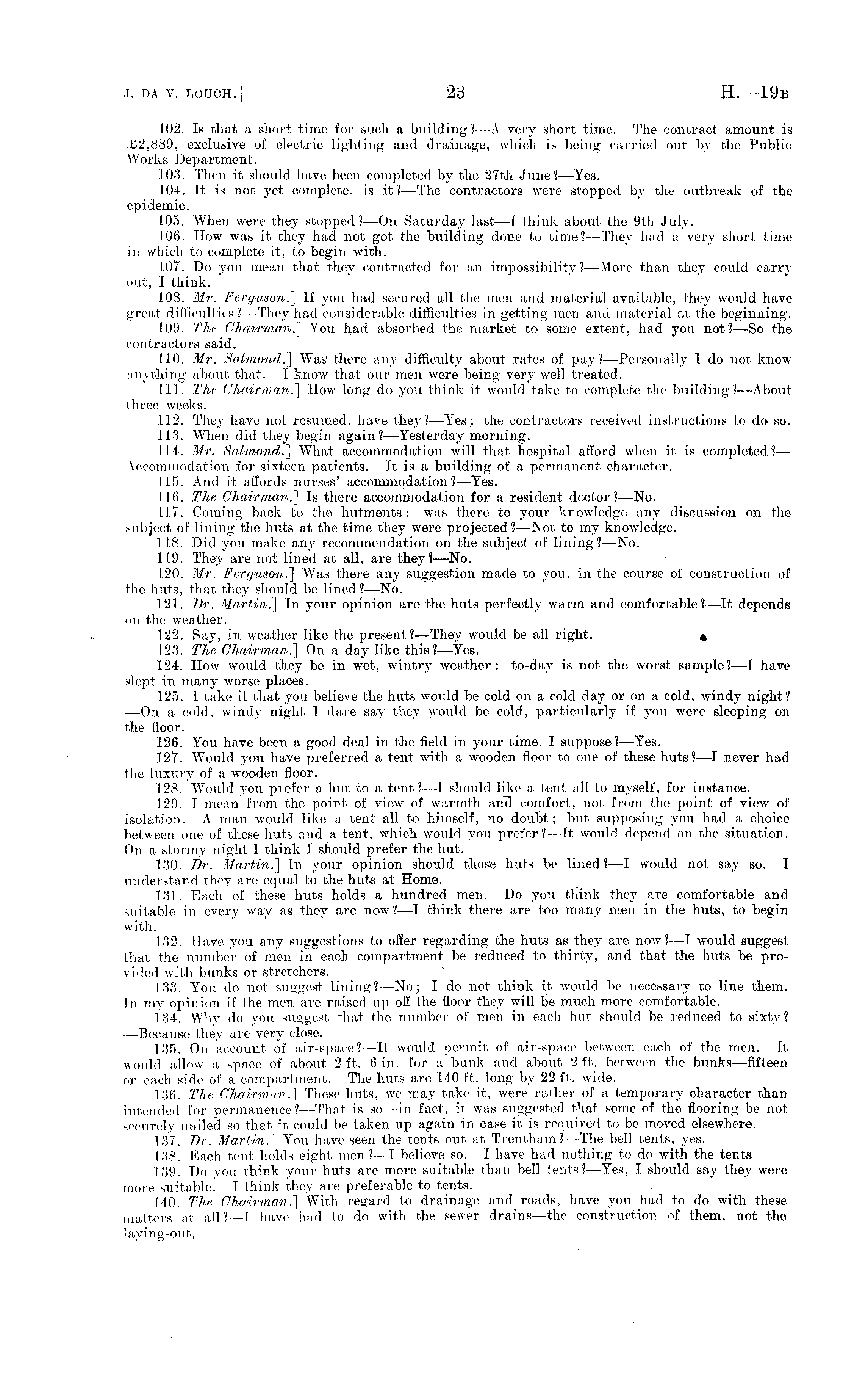 1.02. Is that a short time for such a building ?—A very short time. The contract amount is ■£2,889, exclusive of electric lighting and drainage, which is being carried out by the Public Works Department. 103. Then it should have been completed by the 27th. June?— Yes. 104. It is not yet complete, is it?— The contractors w r ere stopped by the outbreak of the epidemic. 105. When were they stopped?—On Saturday last —I think about the 9th July. 106. How was it they had not got the building done to time?— They had a very short time in which to complete it, to begin with. 107. Do you mean that .they contracted for an impossibility?— More than they could carry out, I think. 108. Mr. Ferguson.] If you had secured all the men and material available, they would have great difficulties?— They had considerable difficulties in getting men and material at the beginning. 109. The Chairman.] You had absorbed the market to some extent, had you not?—So the contractors said. 110. Mr. Salmond.] Was' there any difficulty about rates of pay?— Personally I do not know anything about that. I know that our men were being very well treated. 111. The Chairman.] How long do you think it would take to complete the building?— About three weeks. 112. They have not resumed, have they?— Yes; the contractors received instructions to do so. 113. When did they begin again? —Yesterday morning. 114. Mr. Salmond.] What accommodation will that hospital afford when it is completed?— Accommodation for sixteen patients. It is a building of a permanent character, 115. And it affords nurses' accommodation?— Yes. 116. The Chairman.] Is there accommodation for a resident doctor?— No. 117. Coming back to the hutments : was there to your knowledge any discussion on the subject of lining the huts at the time they were projected? —Not to my knowledge. 118. Did you make any recommendation on the subject of lining?— No. 119. They are not lined at all, are they?— No. 120. Mr. Ferguson.] AVas there any suggestion made to you, in the course of construction, of the huts, that they should be lined?— No. 121. Dr. Martin.] In your opinion are the huts perfectly warm and comfortable ?—lt depends on the weather. 122. Say, in weather like the present?— They would be all right. * 123. The Chairman.] On a day like this?— Yes. 124. How would they be in wet, wintry weather: to-day is not the worst sample?—l have slept in many worse places. 125. I take it that you believe the huts would be cold on a cold day or on a cold, windy night? —On a cold, windy night I. dare say they would be cold, particularly if you, were sleeping on the floor. 126. You have been a good deal in the field in your time, I suppose?— Yes. 127. AA T ould you have preferred a tent with a wooden floor to one of these huts?—l never had the luxury of a wooden floor. 128. Would you prefer a hut to a tent?—l should like a tent all to myself, for instance. 129. I mean from the point of view of warmth and comfort, not from the point of view of isolation. A man would like a tent all to himself, no doubt; but supposing you had a choice between one of these huts and a tent, which would you prefer?—lt would depend on the situation. On a stormy night I think T should prefer the hut. 130. Dr. Martin!] In your opinion should those huts be lined? —I would not say so. I understand they are equal to the huts at Home. 131. Each of these huts holds a hundred men. Do you think they are comfortable and suitable in. every way as they are now?—l think there are too many men in the huts, to begin, with. 132. Have you any suggestions to offer regarding the huts as they are now?—l would suggest that the number of men in each compartment be reduced to thirty, and that the huts be provided with bunks or stretchers. 133. You do not suggest lining?—No; I do not think it would be necessary to line them. In my opinion if the men are raised up off the floor they will be much more comfortable. i 34. Why do you suggest that the number of men in each hut should be reduced to sixty? —Because they are very close. 135. On account of air-space?—lt would permit of air-space between each of the men. It would allow a space of about 2 ft. 6 in. for a bunk and about 2 ft. between the bunks—fifteen on each side of a compartment. The huts are 1.40 ft. long by 22 ft, wide. 136. The Chairman!] These huts, we may take it, were rather of a temporary character than intended for permanence?— That is so —in fact, it was suggested that some of the flooring be not securely nailed so that it could be taken up again in case it is required to be moved elsewhere. 137. Dr. Martin!] You have seen the tents out at Trentham? —The bell tents, yes. 138. Each tent holds eight men?—l believe so. I have had nothing to do with the tents 1,39. Do you think your huts are more suitable than bell tents? —Yes, T should say they were more suitable. T think they are preferable to tents. 140. The Chairman!] With regard to drainage and roads, have you had to do with these matters at all? —T have had to do with the sewer drains —the construction of them, not the laying-out,