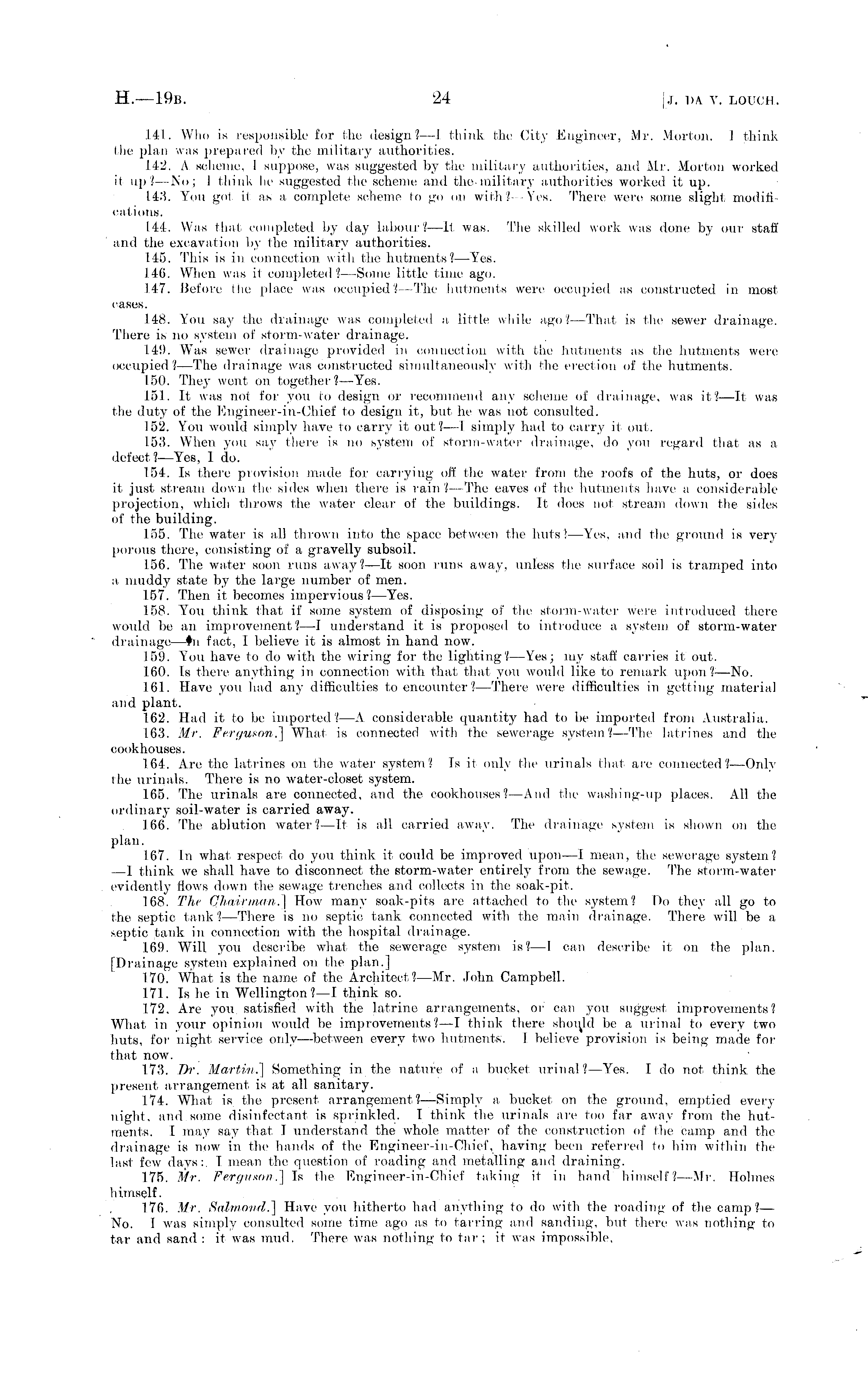 141. Who is responsible for the design? —1 think the City Engineer, Mr. Morton. I think the plan was prepared by the military authorities. 142. A scheme, 1 suppose, was suggested by tlie military authorities, and Mr. Morton worked il up?—No; 1 think he suggested the scheme and the-military authorities worked it up. 143. You got it as a complete scheme to go on with?-—Yes. There were some slight modifications. 1.44. Was that, completed by day labour?—lf was. The skilled work was done by our staff and the excavation by the military authorities. 145. This is in connection with the hutments?— Yes. 146. When was it completed?— Some little time ago. 147. Before the place was occupied?— The hutments were occupied as constructed in most cases. 148. You say the drainage was completed a little while ago?— That is the sewer drainage. There is no system of storm-water drainage, 149. Was sewer drainage provided in connection with the hutments as the hutments were occupied?— The drainage was constructed simultaneously with the erection of the hutments. 150. They went on together? —Yes. 151. It was not for you to design or recommend any scheme of drainage, was it?—lt was the duty of the Engineer-in-Chief to design it, but he was not consulted. 152. You would simply have to carry it out?—l simply had to carry it out, 153. When you say there is no system of storm-water drainage, do you regard that as a defect?— Yes, 1 do. 154. Is there provision made for carrying off the water from the roofs of the huts, or does it just stream down (lie sides when there is rain ?—The eaves of the hutments have a considerable projection, which throws the water clear of the buildings. It does not stream down the sides of the building. 155. The water is all thrown into the space between the huts!— Yes, and the ground is very porous there, consisting of a gravelly subsoil. 156. The water soon runs away?—lt soon runs away, unless the surface soil is tramped into a muddy state by the large number of men. 157. Then it, becomes impervious? —Yes. 158. You think that if some system of disposing of the storm-water were Introduced there would be an improvement ?—I understand it is proposed to introduce a system of storm-water drainage —#n fact, I believe it is almost in hand now. 159. You have to do with the wiring for the lighting?— Yes; my staff carries it out. 160. Is there anything in connection with that that you would like to remark upon ?—No. 161. Have you had any difficulties to encounter ?—There were difficulties in getting material and plant. 162. Had it to be imported?—A considerable quantity had to be imported from Australia. 163. Mr. Ferguson.] What is connected with the sewerage system?— The latrines and the cookhouses. 164. Are the latrines on the water system? Is it only the urinals that are connected?— Only the urinals. There is no water-closet system. 165. The urinals are connected, and the cookhouses? —And the washing-up places. All the ordinary soil-water is carried away. 166. The ablution water?—Tt is all carried away. The drainage system is shown on the plan. 167. In what respect do you think it could be improved upon —I mean, the sewerage system? —I think we shall have to disconnect the storm-water entirely from the sewage. The storm-water evidently flows down the sewage trenches and collects in the soak-pit, 168. The Chairman.] How many soak-pits are attached to the system? Do they all go to the septic tank? —There is no septic tank connected with the main drainage. There will be a septic tank in connection with the hospital drainage. 169. Will you describe what the sewerage system is?—l can describe it on the plan. [Drainage system explained on the plan.] 170. What is the name of the Architect?— Mr. John Campbell. 171. Is he in Wellington?—l think so. 172. Are you satisfied with the latrine arrangements, or can you suggest improvements? What, in your opinion would be improvements? —I think there should be a urinal to every two huts, for night service only—between every two hutments. I believe provision is being made for that now. 173. Dr. Martin.] Something in the nature of a bucket urinal?— Yes. I do not, think, the present arrangement is at all sanitary. 174. What is. the present arrangement?— Simply a, bucket on the ground, emptied every night, and some disinfectant is sprinkled. I think the urinals are too far away from the hutments. I may 7 say that, I understand the whole matter of the construction of the camp and the drainage is now in the hands of the Engineer-in-Chief, having been referred to him within the last few days:. I mean the question of reading and metalling and draining. 175. Mr. Ferguson.] Is the Engineer-in-Chief taking it in hand himself?— Mr. Holmes himself. 176. Mr. Salmond.] Have you hitherto had anything to do with the roading of the camp?— No. 1 was simply consulted some time ago as to tarring and sanding, but there was nothing to tar and sand :it was mud. There was nothing to tar ;it was impossible.