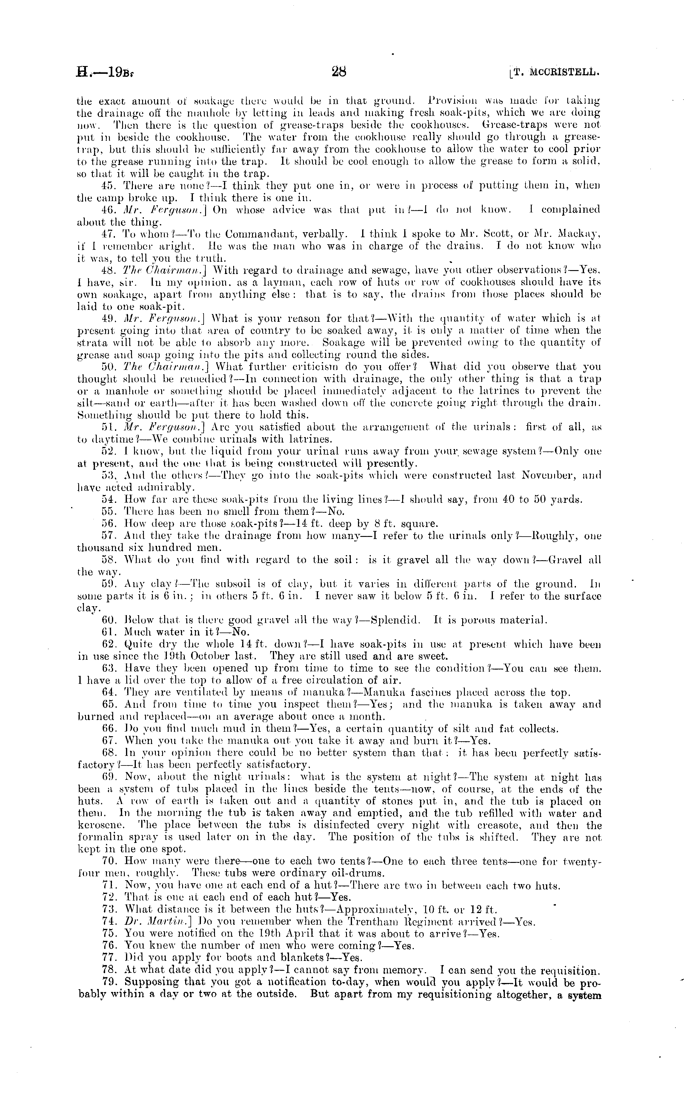 the exact amount of soakage there would be in that ground. Provision was made for taking the drainage off the manhole by letting in leads and making fresh soak-pits, which we are doing now. Then there is the question of grease-traps beside the cookhouses. Grease-traps were not put in beside the cookhouse. The water from the cookhouse really should go through a greasetrap, but this should be sufficiently far away from the cookhouse to allow the water to cool prior to the grease running into the trap. It should be cool enough to allow the grease to form a solid, so that it will be caught in the trap. 45. There are none?—l think, they put one in, or were in process of putting them in, when the camp broke up. I think there is one in. 46. Mr. Ferguson.] On whose advice was that put in.'—l do not know. I complained about the thing. 47. To whom?—To the Commandant, verbally. I think I spoke to Mr. Scott, or Mr. Maekay, if 1 remember aright. He was the man who was in charge of the drains. Ido not know who it was, to tell you the truth. 48. The Chairman.] With regard to drainage and sewage, have you other observations?— Yes. I have, sir. In my opinion, as a layman, each row of huts or row of cookhouses should have its own soakage, apart, from anything else : that is to say, the drains from those places should be laid to one soak-pit. 49. Mr. Ferguson.] What is your reason for that?—AA'ith the quantity of water which is at present going into that area of country to be soaked away, it is only a matter of time when the strata will not be able to absorb any more. Soakage will be prevented owing to the quantity of grease and soap going into the pits and collecting round the sides. 50. The Chairman.] What further criticism do you offer? What did you observe that you thought should be remedied ?—ln connection with drainage, the only other thing is that, a trap or a manhole or something should be placed immediately adjacent to the latrines to prevent the silt —sand or carth —after it has been washed down off the concrete going right through the drain. Something should be put there to hold this. 51. Mr. Ferguson.] Are you satisfied about the arrangement of the urinals: first of all, as to daytime? —AA T e combine urinals with latrines. 52. I know, but the liquid from your urinal runs away from your sewage system?— Only one at present, and the one that is being constructed will presently. 53. And the others? —They go into the soak-pits which were constructed last November, and have acted admirably. 54. How far arc these soak-pits from the living lines?—l should say, from 40 to 50 yards. 55. There has been no smell from them?— No. 56. How deep are those soak-pits?—l.4 ft, deep by 8 ft. square. 57. And they take the drainage from how many —I refer to the urinals only?— Roughly, one thousand six hundred men. 58. AVhat do you find with regard to the soil: is it gravel all the way down?— Gravel all the way. 59. Any clay?— The subsoil is of clay, but it varies in different parts of the ground. In some parts it is 6 in. ;in others 5 ft, 6 in. I never saw it below 5 ft. 6 in. I refer to the surface clay. 60. Below that is there good gravel all the way?— Splendid. It is porous material. 61. Much water in it?— No. 62. Quite dry the whole 14ft. down?—l have soak-pits in use at present which have been in use since the 19th October last. They are still used and are sweet. 63. Have they been opened up from time to time to see the condition ?—You can see them. 1 have a lid over the top to allow of a free circulation of air. 64. They are ventilated by means of manuka?— Manuka fascines placed across the top. 65. And from time to time you inspect them?— Yes; and the manuka is taken away and burned and replaced—on an average about once a month. 66. Do you find much mud in them?— Yes, a certain quantity of silt and fat collects. 67. When you take the manuka out you take it away and burn it?— Yes. 68. In your opinion there could be no better system than that; it has been perfectly satisfactory?—lt has been perfectly satisfactory. 69. Now, about, the night urinals: what is the system at night?— The system at night has been a system of tubs placed in the lines beside the tents —now, of course, at, the ends of the huts. A row of earth is taken out and a quantity of stones put in, and the tub is placed on them. In the morning the tub is taken away and emptied, and the tub refilled with water and kerosene. The place between the tubs is disinfected every night with creasote, and then the formalin spray is used later on in the day. The position of the tubs is shifted. They are not kept in the one spot. 70. How many were there—one to each two tents?— One to each three tents —one for twentyfour men, roughly. These tubs were ordinary oil-drums. 71. Now, you have one at each end of a hut?— There are two in between each two huts. 72. That is one at each end of each hut?— Yes. 73. What distance is it between the huts? —Approximately, TO ft. or 12 ft. 74. Dr. Martin.] Do you remember when the Trentham Regiment arrived?— Yes. 75. You were notified on the 19th April that it was about to arrive?— Yes. 76. You knew the number of men who were coming?— Yes. 77. Did you apply for boots and blankets?— Yes. 78. At what date did you apply?—l cannot say from memory. I can send you the requisition. 79. Supposing that you got a notification to-day, when would you apply?—lt would be probably within a day or two at the outside. But apart from my requisitioning altogether, a system