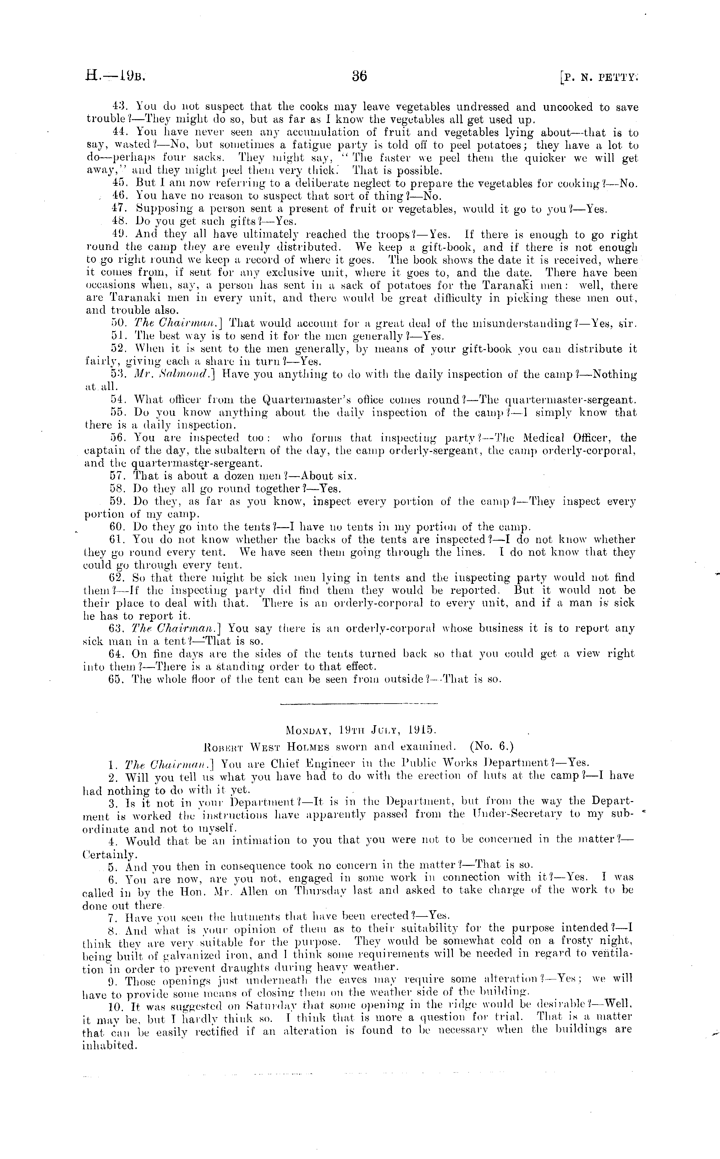 Monday, 19th Jli.y, 1915. Robert AVest Holmes sworn and examined. (No. 6.) 1. The Chairman.] You are Chief Engineer in the Public Works Department ?—Yes. 2. AVill you tell us what you have had to do with the erection of huts at the camp?—l have had nothing to do with it ) 7 et. 3. Is it not in your Department? —It is in the Department, but from the way the Department is worked the instructions have apparently passed from the Under-Secretary to my subordinate and not to myself. 4. Would that be an intimation to you that you were not to be concerned in tlie matter?— Certainly. 5. And you then in consequence took no concern in the matter?— That is so. 6. You are now, are you not, engaged in some work in connection with it?— Yes. I was called in by the Hon. Mr. Allen on Thursday last and asked to take charge of (he work to be done out there 7. Have you seen the hutments that have been erected? —Yes. 8.. And what is your opinion of them as to their suitability for the purpose intended?—l think they are very suitable for the purpose, They would be somewhat cold on a frosty night, being built of galvanized iron, and I think some requirements will be needed in regard to ventilation "in. order to prevent draughts during heavy weather. 9. Those openings just underneath the eaves may require some alteration ?—Yes; we will have to provide some means of closing them on the weather side of the building. 10. It was suggested on Saturday that some opening in the ridge would be desirable? —Well, it may be, but I hardly think so. I think that is more a question for trial. That is a matter that can be easily rectified if an alteration is found to be necessary when (lie buildings are inhabited.