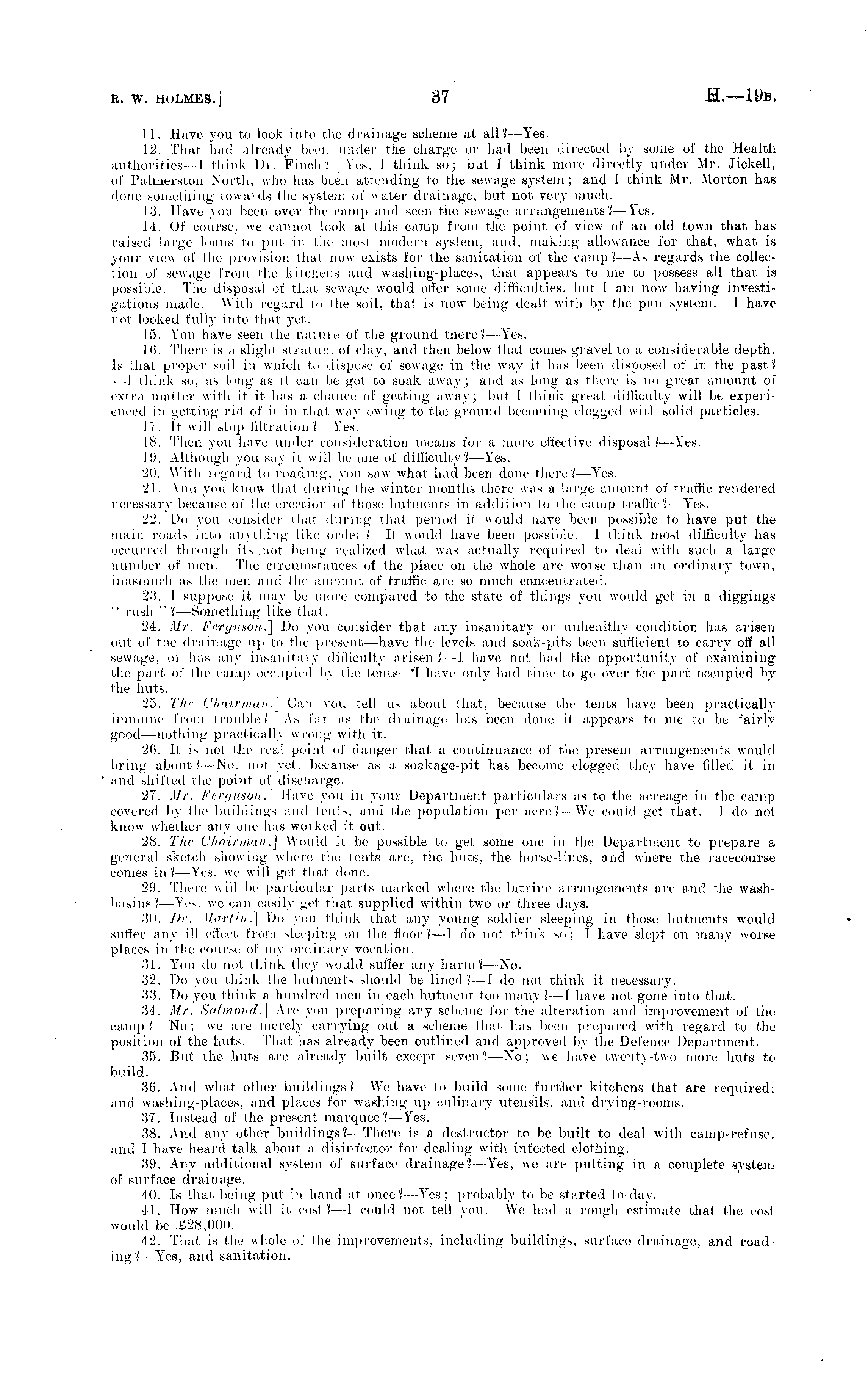 11. Have you to look into the drainage scheme at all?—Y T es. 12. That, had already been under the charge or had been directed by some of the Health authorities—l think \)r. Finch? —Yes. 1 think so; but 1 think more directly under Mr. Jickell, of Palmerston North, who has been attending to tlie sewage system; and 1 think Mr. Morton has done something towards the system of water drainage, but not very much. 13. Have you been over the camp and seen the sewage arrangements?—Y'es. 14. Of course, we cannot look at this camp from the point of view of an old town that has raised large loans to put in the most modern system, and, making allowance for that, what is your view of the provision that now exists for the sanitation of the camp?—As regards the collection of sewage from the kitchens and washing-places, that appears to me to possess all that is possible. The disposal of that sewage would offer some difficulties, but 1 am now having investigations made. With regard to (he soil, that is now being dealt with by the pan system. I have not looked fully into that yet. 15. You have seen the nature of the ground there?— Yes. 16. There is a slight stratum of clay, and then below that conies gravel to a considerable depth. Is that proper soil in which to dispose of sewage in the way it lias been disposed of in the past? —J think so, as long as it can be got to soak away; and as long as there is no great amount of extra matter with it it has a chance of getting away; but i think great, difficulty will be experienced in getting rid of it in that way owing to the ground becoming clogged with solid particles. 17. It will stop filtration?— Yen. 18. Then you have under consideration means for a more effective disposal?— Yes. 19. Although you say it will be one of difficulty?— Yes. 20. With regard to roading, you saw what had been done there?— Yes. 21. And you know- that during Ihe winter months there was a large amount of traffic rendered necessary because of the erection of those hutments in addition to (he camp traffic?— Yes. 22. Do you consider thai during that period it would have been possible to have put the main roads into anything like order? —It would have been possible. I think most, difficulty has occurred through its not being realized what was actually required to deal with such a large number of men. The circumstances of the place on the whole are worse than an ordinary town, inasmuch as the men and the amount of traffic are so much concentrated. 23. 1 suppose it may- be more compared to the state of things you would get in a diggings " rush "?—Something like that. 24. Mr. Ferguson.] Do you consider that any insanitary or unhealthy condition lias arisen out of the drainage up to the present—have the levels and soak-pits been sufficient to carry off all sewage, or has any insanitary difficulty arisen? —I have not had the opportunity of examining the part of tlie camp occupied by the tents- —'I have only had time to go over the part occupied by 7 the huts. 25. The Chairman.] Can you tell us about that, because the tents have been practicallyimmune from trouble?—As far as the drainage has been done il appears to me to be fairlygood—nothing practically wrong with it. 26. It is not the real point of danger that a continuance of the present arrangements would bring about?— No. not yet, because as a soakage-pit has become clogged they have filled it in and shifted the point of discharge. 27. Mr. Ferguson ,j Have you in your Department particulars as to the acreage in the camp covered by the buildings and tents, and the population per acre?—We could get that. I do not, know whether any 7 one has worked it out. 28. The Chairman.] Would it be possible to get some one in the Department to prepare a general sketch showing where the tents are, the huts', the horse-lines, and where the racecourse comes in? —Yes, we will get that done. 29. There will be particular parts marked where the latrine arrangements are and the washbasins?— Yes, we can easily 7 get that supplied within two or three days. 30. Dr. Martin.] Do you think that any young soldier sleeping in those hutments would suffer any ill effect, from sleeping on the floor?—I do not think so; I have slept on many worse places in the course of my ordinary 7 vocation. 31. You do not think they would suffer any harm? —No. 32. Do you think the hutments should be lined?—l do not think it necessary. 33. Do you think a hundred men in each hutment too many?—l have not, gone into that. 34. Mr. Salmond.] Are you preparing any scheme for the alteration and improvement of the camp?—No; we are merely carrying out a scheme that, has been prepared with regard to the position of the huts. That has already been outlined and approved by the Defence Department, 35. But the huts are already built except seven?—No; we have twenty-two more huts to build. 36. And what other buildings?—We have to build some further kitchens that are required, and washing-places, and places for washing up culinary utensils', and drying-rooms. 37. Instead of the present marquee?— Yes. 38. And any other buildings?— There is a destructor to be built to deal with camp-refuse, and I have heard talk about a disinfector for dealing with infected clothing. 39. Any additional system of surface drainage?— Yes, we are putting in a complete system of surface drainage. 40. Is that being put in hand at, once?— Yes ; probably to be started to-day. 41. How much will it cost?—l could no! tell you. We hail a rough estimate that the cost would be ,£28,000. 42. That is the whole of the improvements, including buildings, surface drainage, and roading?—Yes, and sanitation.