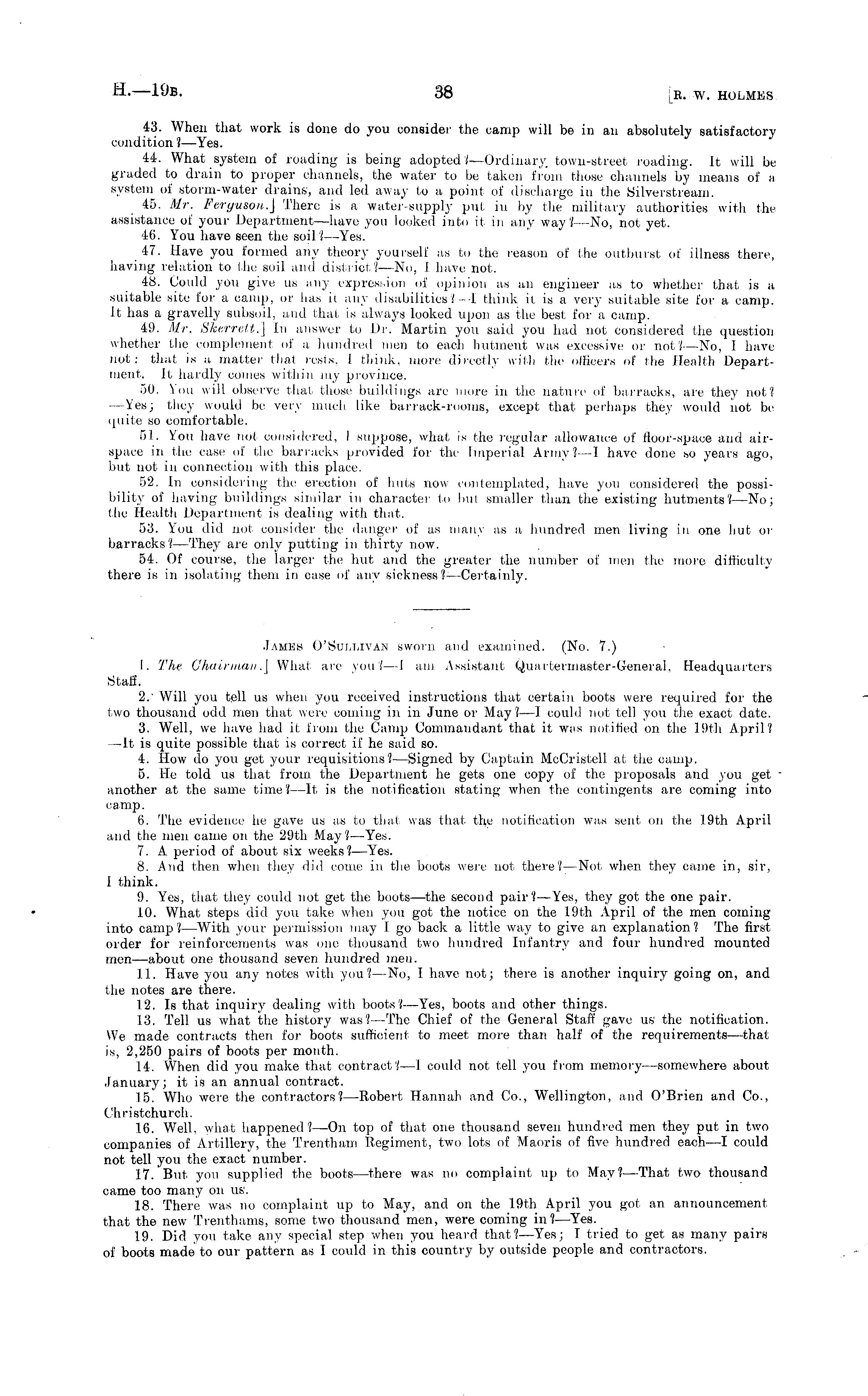 James o'Sullivan sworn and examined. (No. 7.) 1. The, Chairman .] What are you?—l am Assistant Quartermaster-General, Headquarters Staff. 2.' Will you tell us when you received instructions that certain boots were required for the two thousand odd men that were coming in in June or May? —I could not fell you the exact date. 3. Well, we have had it from the Camp Commandant that it was notified on the 19th April? —It is quite possible that is correct if he said so. 4. How do you get your requisitions?— Signed by Captain McCristell. at the camp. 5. He told us that from the Department he gets one copy of the proposals and you get another at the same time? —It is the notification stating when the contingents are coming into camp. 6. The evidence he gave us as to that was that the notification was sent on the 19th April and the men came on the 29th May?— Yes. 7. A period of about six weeks? —Yes. 8. And then when they did come in the boots were not there?— Not when they came in, sir, I think. 9. Yes, that they could not get the boots —the second pair?— Yes, they got the one pair. 10. What steps did you take when you got the notice on the 19th April of the men coming into camp?— With your permission may Igo back a little way to give an explanation? The first order for reinforcements was one thousand two hundred Infantry and four hundred mounted men—about one thousand seven hundred men. IT. Have you any notes with you?—No, I have not; there is another inquiry going on, and the notes are there. 12. Is that inquiry dealing w 7 ith boots? —Yes, boots and other things. 13. Tell us what the history was? —The Chief of the General Staff gave us the notification. We made contracts then for boots sufficient, to meet more than half of the requirements—that is, 2,250 pairs of boots per month. 14. When did you make that contract?—l could not tell you from memory —somewhere about, January; it is an annual contract. 15. Who were the contractors? —Robert, Hannah and Co., Wellington, and O'Brien and Co., Christchurch. 16. Well, what happened?—On top of that one thousand seven hundred men they put in two companies of Artillery, the Trentham Regiment, two lots of Maoris of five hundred each—l could not tell you the exact number. 17. But you supplied the boots —there was no complaint up to May?— That two thousand came too many on us. 18. There was no complaint up to May, and on the 19th April you got, an announcement that the new Trenthams, some two thousand men, were coming in.—Yes. 19. Did you take any special step when you heard that? —Yes; I tried to get as many pairs of boots made to our pattern as I could in this country by outside people and contractors.
