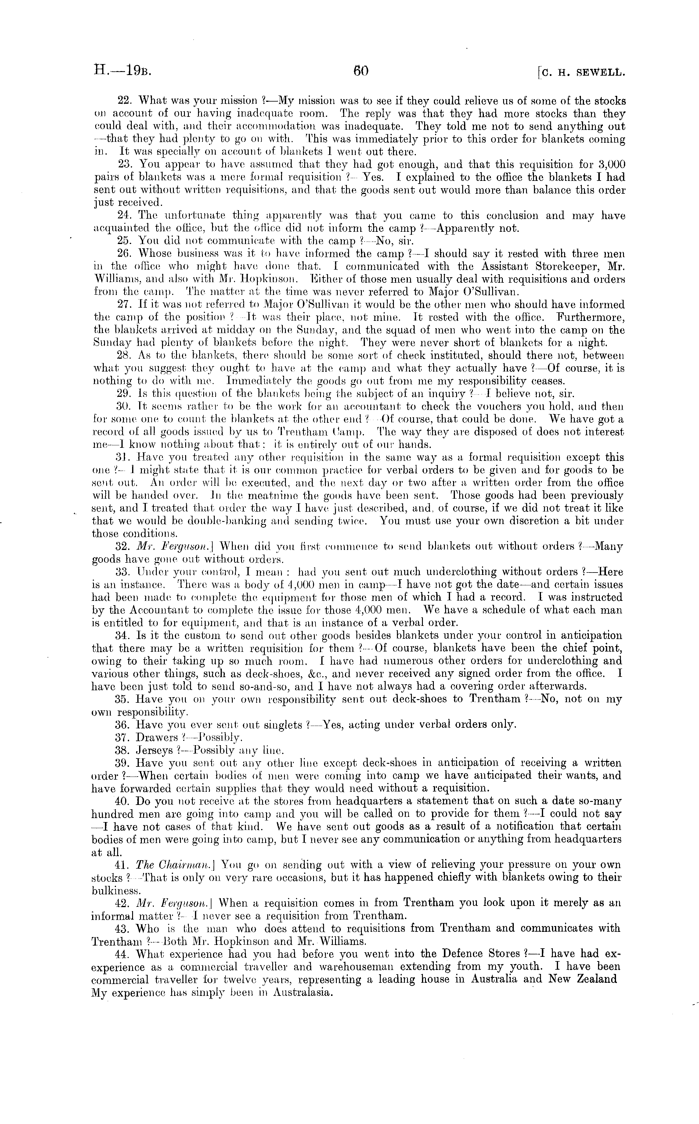22. What was your mission ?-—My mission was to see if they could relieve us of some of the stocks on account of our having inadequate room. The reply was that they had more stocks than they could deal with, and their accommodation was inadequate. They told me not to send anything out —that they had plenty to go on with. This was immediately prior to this order for blankets coming in. It was specially on account of blankets I went out there. 23. You appear to have assumed that they had got enough, and that this requisition for 3,000 pairs of blankets was a mere formal requisition ?— Yes. I explained to the office the blankets I had sent out without written requisitions, and that the goods sent out would more than balance this order just received. 24. The unfortunate thing apparently was that you came to this conclusion and may have acquainted the office, but the office did not inform the camp ? —Apparently not. 25. You did not communicate with the camp ? —No, sir. 26. Whose business was it to have informed the camp ? —I should say it rested with three men in the office who might have done that. I communicated with the Assistant Storekeeper, Mr. Williams, and also with Mr. Hopkinson. Either of those men usually deal with requisitions and orders from the camp. The matter at the time was never referred to Major O'Sullivan. 27. If it was not referred to Major O'Sullivan it would be the other men who should have informed the camp of the position ?•—lt was their place, not mine. It rested with the office. Furthermore, the blankets arrived at midday on the Sunday, and the squad of men who went into the camp on the Sunday had plenty of blankets before the night. They were never short of blankets for a night. 28. As to the blankets, there should be some sort of cheek instituted, should there not, between what you suggest they ought to have at the camp and what they actually have ? —Of course, it is nothing to do with me. Immediately 7 the goods go out from me my responsibility ceases. 29. Is this question of the blankets being the subject of an inquiry ?- I believe not, sir. 30. It seems rather to be tho work for an accountant to check the vouchers you hold, and then for some one to count the blankets at the other end .- Of course, that could be done. We have got a record of all goods issued by us to Trentham Camp. The way they are disposed of does not interest me —I know nothing about that; it is entirely out of our hands. 31. Have you treated any other requisition in the same way as a formal requisition except this one ?— I might state that it is our common practice for verbal orders to be given and for goods to be sent out. An order will be executed, and the next day or two after a, written order from the office will be handed over. In the meatnime the goods have been sent. Those goods had been previously sent, and I treated that order the way I have just described, and, of course, if we did not treat it like that we would be double-banking and sending twice. You must use your own discretion a bit under those conditions. 32. Mr. Ferguson.] When did you first commence to send blankets out without orders ? -Many goods have gone out without orders. 33. Under your control, I mean : had you sent out much underclothing without orders ?—Here is an instance. There was a body of 4,000 men in camp —I have not got the date —and certain issues had been made to complete the equipment for those men of which I had a record. I was instructed by the Accountant to complete the issue for those 4,000 men. We have a schedule of what each man is entitled to for equipment, and that is an instance of a verbal order. 34. Is it the custom to send out other goods besides blankets under your control in anticipation that there may be a written requisition for them ?—Of course, blankets have been the chief point, owing to their taking up so much room. I have had numerous other orders for underclothing and various other things, such as deck-shoes, &c, and never received any signed order from the office. I have been just told to send so-and-so, and I have not always had a covering order afterwards. 35. Have you on your own responsibility sent out deck-shoes to Trentham ?—No, not on my own responsibility. 36. Have you ever sent out singlets ?—Yes, acting under verbal orders only. 37. Drawers ? —Possibly. 38. Jerseys ? —Possibly any line. 39. Have you sent out any other line except deck-shoes in anticipation of receiving a written order ? —When certain bodies of men were coming into camp we have anticipated their wants, and have forwarded certain supplies that they would need without a requisition. 40. Do you not receive at the stores from headquarters a statement that on such a date so-many hundred men are going into camp and you will be called on to provide for them ?—I could not say —I have not cases of that kind. We have sent out goods as a result of a notification that certain bodies of men were going into camp, but I never see any communication or anything from headquarters at all. 41. The Chairman!] You go on sending out with a view of relieving your pressure on your own stocks ?—That is only on very rare occasions, but it has happened chiefly with blankets owing to their bulkiness. 42. Mr. Ferguson.] When a requisition comes in from Trentham you look upon it merely as an informal matter ?—I never see a requisition from Trentham. 43. Who is the man who does attend to requisitions from Trentham and communicates with Trentham ?—Both Mr. Hopkinson and Mr.-Williams. 44. What experience had you had before you went into the Defence Stores ?—I have had exexperience as a commercial traveller and warehouseman extending from my youth. I have been commercial traveller for twelve, years, representing a leading house in Australia and New Zealand My experience has simply been in Australasia.