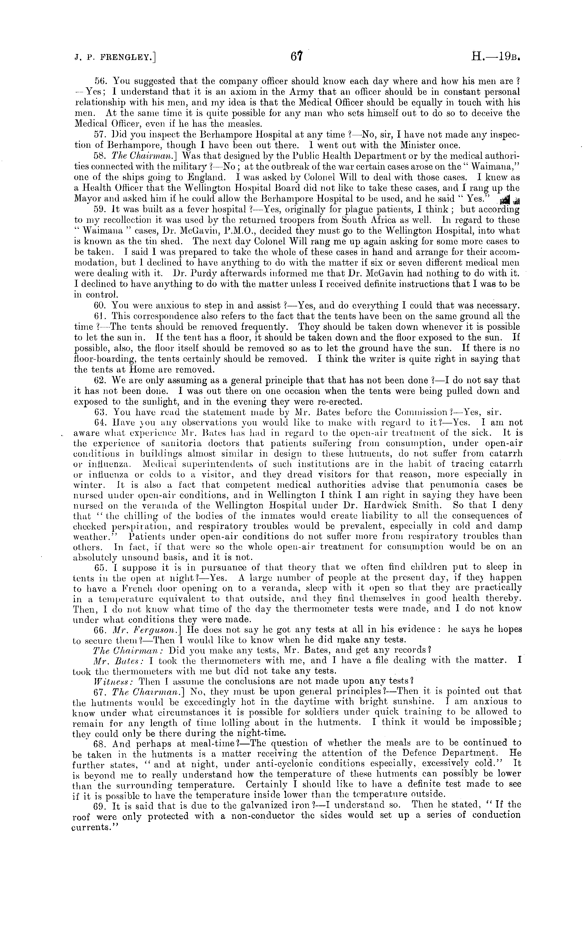 56. You suggested that the company officer should know each day where and how his men are ? —Yes; I understand that it is an axiom in the Army that an officer should be in constant personal relationship with his men, and my idea is that the Medical Officer should be equally in touch with his men. At the same time it is quite possible for any man who sets himself out to do so to deceive the Medical Officer, even if he has the measles. 57. Did you inspect the Berhampore Hospital at any time ?—No, sir, I have not made any inspection of Berhampore, though I have been out there. 1 went out with the Minister once. 58. Tlie Chairman.] Was that designed by the Public Health Department or by the medical authorities connected with the military ? —No ; at the outbreak of the war certain cases arose on the " Waimana," one of the ships going to England. I was asked by Colonel Will to deal with those cases. I knew as a Health Officer that the Wellington Hospital Board did not like to take these cases, and I rang up the Mayor and asked him if he could allow the Berhampore Hospital to be used, and he said " Yes." 59. It was built as a fever hospital ?—Yes, originally for plague patients, I think ; but according to my recollection it was used by the returned troopers from South Africa as well. In regard to these " Waimana " cases, Dr. McGavin, P.M.0., decided they must go to the Wellington Hospital, into what is known as the tin shed. The next day Colonel Will rang me up again asking for some more cases to be taken. I said I was prepared to take the whole of these cases in hand and arrange for their accommodation, but 1 declined to have anything to do with the matter if six or seven different medical men were dealing with it. Dr. Purdy afterwards informed me that Dr. McGavin had nothing to do with it. I declined to have anything to do with the matter unless I received definite instructions that I was to be in control. 60. You were anxious to step in and assist ? —Yes, and do everything I could that was necessary. 61. This correspondence also refers to the fact that the tents have been on. the same ground all the time ? —The tents should bo removed frequently. They should be taken down whenever it is possible to let the sun in. If the tent has a floor, it should be taken down and the floor exposed to the sun. If possible, also, the floor itself should be removed so as to let the ground have the sun. If there is no floor-boarding, the tents certainly should be removed. I think the writer is quite right in saying that the tents at Home are removed. 62. We are only assuming as a general principle that that has not been done ? —I do not say that it has not been done. I was out there on one occasion when the tents were being pulled down and exposed to the sunlight, and in the evening they were re-erected. 63. You have read the statement made by Mr. Bates before the Commission? —Yes, sir. 64. Have you any observations you would like to make with regard to it?— Yes. I am not aware what experience Mr. Bates has had in regard to the open-air treatment of the sick. It is the experience of sanitoria doctors that patients suffering from consumption, under open-air conditions in buildings almost similar in design to these hutments, do not suffer from catarrh or influenza. Medical superintendents of such institutions are in the habit of tracing catarrh or influenza or colds to a visitor, and they dread visitors for that reason, more especially in winter. It is also a fact that competent medical authorities advise that penumonia cases be nursed under open-air conditions, and in AVellington I think I am right in saying they have been nursed on the veranda of the Wellington Hospital under Dr. Hardwick Smith. So that I deny that "the chilling of the bodies of the inmates would create liability to all the consequences of checked perspiration, and respiratory troubles would be prevalent, especially in cold and damp weather." Patients under open-air conditions do not suffer more from respiratory troubles than others. In fact, if that were so the whole open-air treatment for consumption would be on an absolutely unsound basis, and it is not. 65. I suppose it is in pursuance of that theory that we often find children put to sleep in tents in the open at night? —Yes. A large number of people at the present day, if they happen to have a French door opening on to a veranda, sleep with it open so that they are practically in a temperature equivalent to that outside, and they find themselves in good health thereby. Then, I do not know what time of the day the thermometer tests were made, and I do not know under what conditions they were made. 66. Mr. Ferguson.] He does not say he got any tests at all in his evidence : he says he hopes to secure them?— Then I would like to know when he did make any tests. The Chairman: Did you make any tests, Mr. Bates, and get any records? Mr. Bates: I took the thermometers with me, and I have a file dealing with the matter. I took the thermometers with me but did not take any tests. Witness: Then I assume the conclusions are not made upon any tests? 67. The Chairman.] No, they must be upon general principles?— Then it, is pointed out that the hutments would be exceedingly hot, in tlie daytime with bright sunshine. lam anxious to know under what circumstances it is possible for soldiers under quick training to be allowed to remain for any length of time lolling about in the hutments. I think it would bo impossible, they could only be there during the night-time. 68. And perhaps at meal-time? —The question of whether the meals are to be continued to be taken in the hutments is a matter receiving the attention of the Defence Department. He further states, " and at night, under anti-cyclonic conditions especially, excessively cold." It is beyond me to really understand how the temperature of these hutments can possibly be lower than the surrounding temperature. Certainly I sho