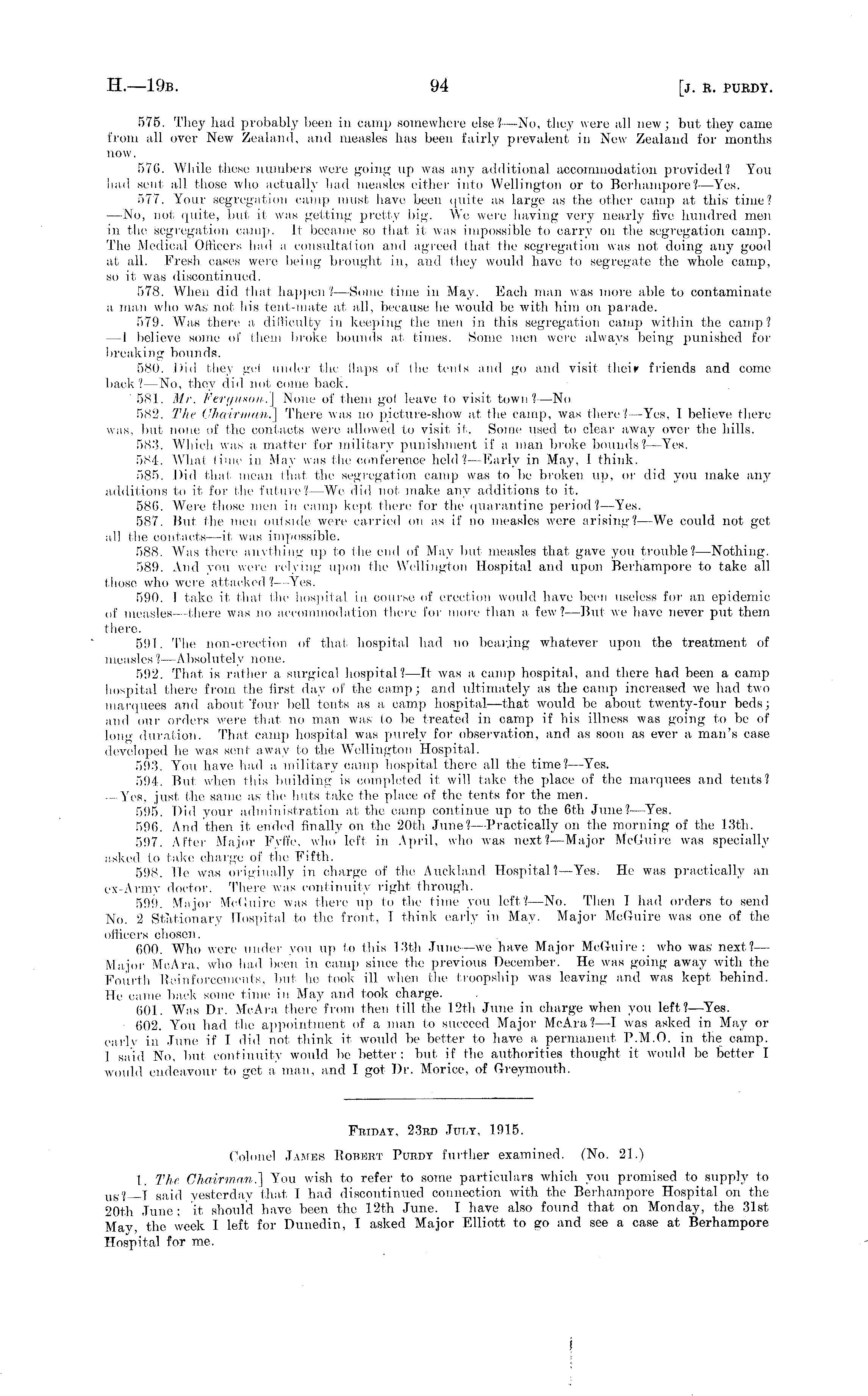 Friday, 23rd July, T915. Colonel James Robkrt Purdy further examined. (No. 21.) 1, The Chairman.] You wish to refer to some particulars which you promised to supply to us 'j__l gaid yesterday that I had discontinued connection with the Berhampore Hospital on the 20th June; it should have been the 12th June. I have also found that on Monday, the 31st May, the week I left for Dunedin, I asked Major Elliott, to go and see a case at Berhampore Hospital for me.
