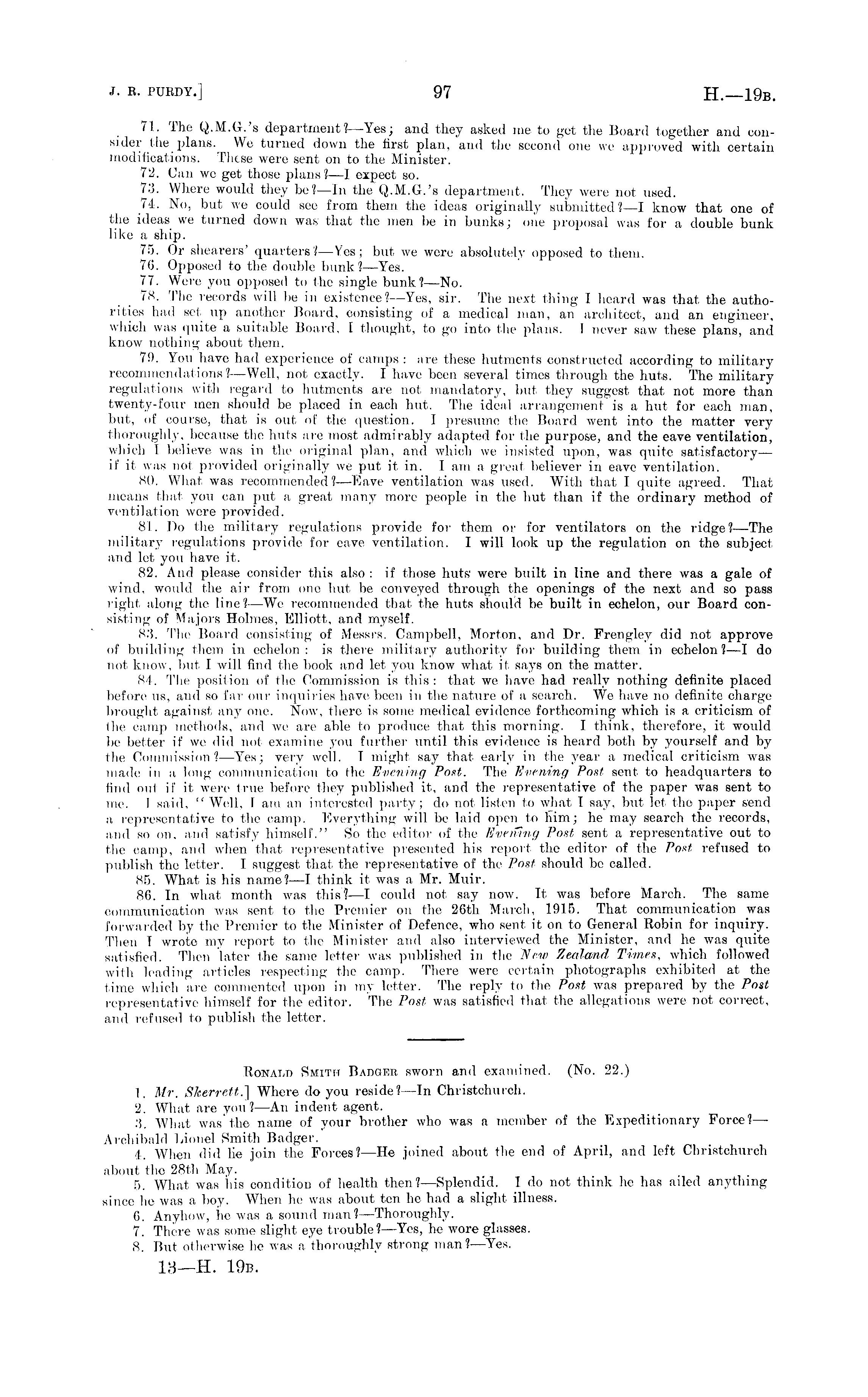 71. The Q.M.G.'s department?— Yes; and they asked me to get the Board together and consider the plans. We turned down the first plan, and the second one we approved with certain modifications. These were sent on to the Minister. 72. Can wo get those plans?—l expect so. 73. Where would they be?—ln the Q.M.G.'s department. They were not used. 74. No, but we could see from them, the ideas originally submitted ?—I know that one of the ideas we turned down was that the men be in bunks; one proposal was for a double bunk like a ship. 75. Or shearers' quarters?— Yes; but we were absolutely opposed to them. 76. Opposed to the double bunk?— Yes. 77. Were you opposed to the single bunk? —No. 78. The records will be in existence?— Yes, sir. The next thing I heard was that the authorities had set up another Board, consisting of a medical man, an architect, and an engineer, which was quite a suitable Board, I thought, to go into the plans. I never saw these plans, and know nothing about them. 79. You have had experience of camps : are these hutments constructed according to military recommendations?—AVell, not exactly. I have been several times through the huts. The military regulations with regard to hutments are not mandatory, but they suggest that not more than twenty-four men should be placed in each hut. The ideal arrangement is a hut for each man, but, of course, that is out of the question. I presume the Board went into the matter very thoroughly, because the huts are most admirably 7 adapted for the purpose, and the cave ventilation, which I believe was in the original plan, and which we insisted upon, was quite satisfactory— if it was not provided originally we put it in. lam a great believer in cave ventilation. 80. What was recommended?-—Eave ventilation was used. With that I quite agreed. That means that you can put a great many more people in the hut than if the ordinary method of ventilation were provided. 81. Do the military regulations provide for them or for ventilators on the ridge?— The military regulations provide for cave ventilation. I will look up the regulation on the subject, and let you have it. 82. And please consider this also : if those huts' were built in line and there was a gale of wind, would the air from one hut be conveyed through the openings of the next and so pass right, along the line?—We recommended that the huts should be built in echelon, our Board consisting of Majors Holmes, Elliott, and myself. 83. The Board consisting of Messrs. Campbell, Morton, and Dr. Frengley did not approve of building them in echelon : is there military 7 authority for building them in echelon?—l do not know, but I will find the book and let you know what it, says on the matter. 84. The position of the Commission is this : that we have had really nothing definite placed before us, and so far our inquiries have been in the nature of a search. We have no definite charge brought against any one. Now, there is some medical evidence forthcoming which is a criticism of Ihe camp methods, and we are able to produce that this morning. I think, therefore, it would be better if we did not examine you further until this evidence is heard both by yourself and by the Commission?— Yes; very well, T might say that early in the j 7 ear a medical criticism was made in a long communication to the Evening Post. The Evening Post sent, to headquarters to find out if it were true before they published it, and the representative of the paper was sent to me. I said, " Well, lam an interested party; do not, listen to what I say, but let, the paper send a representative to the camp. Everything will be laid open to him; he may search the records, and so on, and satisfy- himself." So the editor of the Everting Post sent a representative out to the camp, and when that representative presented his report, tho editor of the Post refused to publish the letter. I suggest that, the representative of the Post should bo called. 85. What is his name? —I think it was a, Mr. Muir. 86. In what month was this?—l could not say now. It, was before March. The same communication was sent to the Premier on the 26th March, 1915. That communication was forwarded by the Premier to the Minister of Defence, who sent it on to General Robin for inquiry. Then I wrote my report to the Minister and also interviewed the Minister, and he was quite satisfied. Then later the same letter was published in the New Zealand, Times, which followed with leading articles respecting the camp. There were certain photographs exhibited at the time which are commented upon in my letter. The reply to the Post was prepared by the Post representative himself for the editor. The Post was satisfied that the allegations were not correct, and refused to publish the letter. Ronald Smith Badger sworn and examined. (No. 22.) 1. Mr. Skerrett.] Where do you reside?—ln Christchurch. 2. What are you?—An indent agent. 3. AVhat was the name of your brother who was a member of the Expeditionary Force? — Archibald Lionel Smith Badger. 4. When did fie join the Forces?—He joined about the end of April, and left Christchurch about the 28th May. 5. AVhat was his condition of health then? —Splendid. I do not think he has ailed anything since he was a boy. AVhen he was about ten he had a slight illness. 6. Anyhow, he was a sound man? —Thoroughly. 7. There was some slight eye trouble? —Yes, he wore glasses. 8. But otherwise he was a'thoroughly strong man? —Yes.