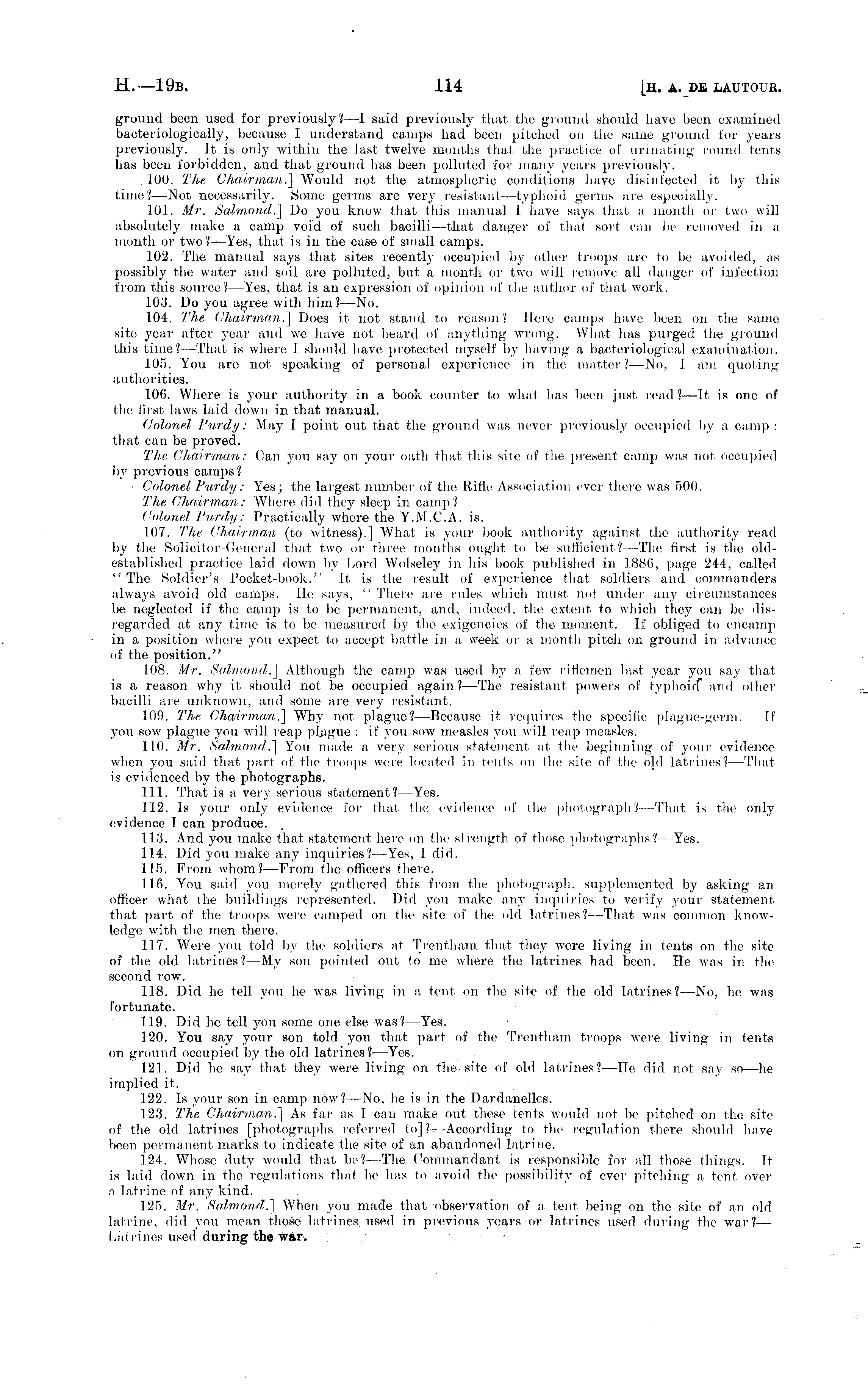 ground been used for previously?—l said previously that the ground should have been examined bacteriologically, because I understand camps had been pitched on the same ground for years previously. It is only within the last twelve months that, the practice of urinating round tents has been forbidden, and that ground has been polluted for many years previously. . 1.00. The Chairman.] Would not the atmospheric conditions have disinfected it, by this time?— Not necessarily. Some germs are very resistant—typhoid germs are especially. 101. Mr, Salmond!] Do you know that this manual 1 have says that a month or two will absolutely make a camp void of such bacilli —that danger of that sort can be removed in a month or two ? —Yes, that is in the case of small camps. 102. The manual says that sites recently occupied by other troops are to be avoided, as possibly the water and soil are polluted, but a month or two will remove all danger of infection from this source? —Yes, that is an expression of opinion of the author of that work. 103. Do you agree with him? —No. 1.04. The Chairman.] Does it not stand to reason? Here camps have been on the same site year after year and we have not heard of anything wrong. What has purged the ground this time?— That is where I should have protected myself by having a bacteriological examination. 105. You are not speaking of personal experience in the matter?—No, 1 am quoting authorities. 106. AVhere is your authority in a book counter to what has been just read?—Tt, is one of the first laws laid down in that manual. Colonel Purdy: May I point out that, the ground was never previously occupied by a camp : that can be proved. The Chairman: Can. you say on your oath that this site of the present camp was not occupied by previous camps? • Colonel Purdy: Yes; the largest number of the Rifle Association ever there was 500. The Chairman : Where did they sleep in camp ? Colonel Purdy: Practically where the V.M.C.A. is. 107. The Chairman (to witness).] What is your book, authority against the authority read by the Solicitor-General that two or three months ought to be sufficient?— The first is the oldestablished practice laid down by Lord AVolseley in his book, published in 1886, page 244, called " The Soldier's Pocket-book." It is the result of experience that soldiers and commanders always avoid old camps. He says, " There are rules which must, not under any circumstances be neglected if the camp is to be permanent, and, indeed, the extent, to which they can be disregarded at any time is to be measured by the exigencies of the moment. If obliged to encamp in a position where you expect to accept battle in a week or a month pitch on ground in advance of the position." 108. Mr. Salmond.] Although the camp was used by a few riflemen last, year you say that is a reason why it should not be occupied again ?—The resistant powers of typhoid* and other bacilli are unknown, and some are very resistant. 109. The Chairman.] Why not plague?— Because it requires the specific plague-germ. If you sow plague you will reap plague : if you sow measles you will reap measles. 110. Mr. Salmond.] You made a very serious statement at the beginning of your evidence when you said that part, of the troops were located in tents on Ihe site of the old latrines? —That is evidenced by the photographs. 111. That is a very serious statement? —Yes. 112. Is your only evidence for that the evidence of Ihe photograph?— That is the only evidence 1 can produce. 113. And you make that statement here on the strength of those photographs? —Yes. 114. Did you make any inquiries? —Yes, I did. 115. From whom? —From the officers there. 116. You said you merely gathered this from the photograph, supplemented by asking an officer what the buildings represented. Did you make any inquiries to verify your statement, that part of the troops were camped on the site of the old latrines?— That was common knowledge with the men there. 117. Were you told by the soldiers at Trentham that they were living in tents on the site of the old latrines? —My 7 son pointed out to me where the latrines had been. He was in the second row. 118. Did he tell you he was living in a tent on the site of the old latrines?—No, he was fortunate. 119. Did he tell you some one else was? —Yes. 120. You say your son told you that part of the Trentham troops were living in tents on ground occupied by the old latrines?— Yes. 121. Did he say that they 7 were living on the site of old latrines?—He did not, say 7 so —-he implied it. 122. Is your son in camp nOw? —No, he is in the Dardanelles. 123. The Chairman.] As far as I can make out, these tents would not be pitched on the site of the old latrines [photographs referred to the regulation there should have been permanent marks to indicate the site of an abandoned latrine. 124. Whose duty would that be? —The Commandant is responsible for all those things. Tt is laid down in the regulations that he has to avoid the possibility of ever pitching a tent over a latrine of any kind. 125. Mr. Salmond.] When you made that observation of a tent being on the site of an old latrine, did you mean those latrines used in previous years or latrines used during the war? — Latrines used during the war.