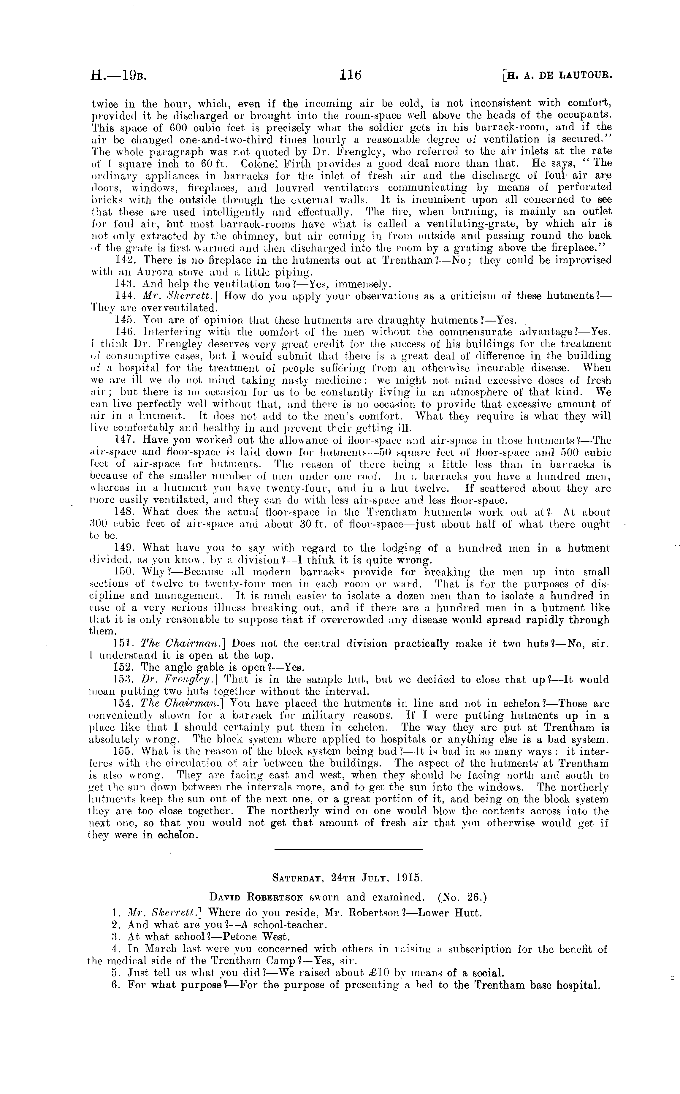Saturday, 24th July, 1915. David Robertson sworn and examined. (No. 26.) 1. Mr. Skerrett.] Where do you reside, Mr. Robertson?—Lower Hutt. 2. And what are you?—A school-teacher. 3. At what school?—Petone West. 4. In March last, were you concerned with others in raising a subscription for the benefit of the medical side of the Trentham Camp? —Yes, sir. 5. Just tell us what you did?—We raised about -£10 by means of a social. 6. For what purpose?— For the purpose of presenting a bed to the Trentham base hospital.