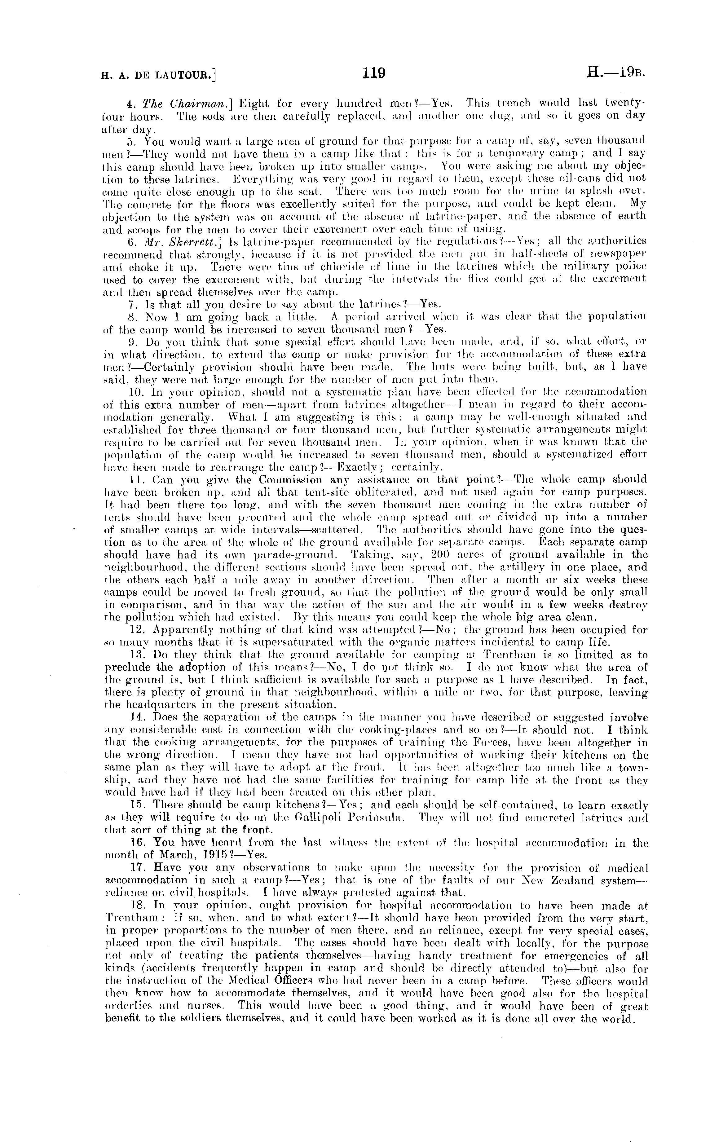4. The Chairman!] Eight for every hundred men?— Yes. This trench would last twentyfour hours. The sods are then carefully replaced, and another one dug, and so it goes on day after day. 5. You would want a large area of ground for that purpose for a camp of, say, seven thousand mell '* —They would not, have them in a camp like that : this is for a temporary camp; and I say Ihis camp should have been broken up into smaller camps. You were asking me about my objection to these latrines. Everything was very- good in regard to them, except those oil-cans did not come quite close enough up to the seat. There was too much room for the urine to splash over. The concrete for the floors was excellently suited for the purpose, and could be kept clean. My objection to the system was on account, of the absence of latrine-paper, and the absence, of earth and scoops for the men to cover their excrement, over each time of using. 6. Mr. Skerrett.] Is latrine-paper recommended by the regulations?— Yes; all the authorities recommend that strongly, because if it, is not provided the men pul in half-sheets of newspaper and choke it up. There were tins of chloride of lime in the latrines which the military police used to cover the excrement with, but during the intervals the flies could get al the excrement and then spread themselves over the camp. 7. Is that all you desire to say about, the latrines? —Yes. 8. Now I am going back a little. A period arrived when it was clear that the population of the camp would be increased to seven thousand men ?—Yes. 9. Do you think that some special effort should have been made, and, if so. what effort, or in what direction, to extend the camp or make provision for the accommodation of these extra men?— Certainly provision should have been made. The huts were being built, but, as I have said, they were not, large enough for the number of men put into them. 10. In your opinion, should not, a systematic plan have been effected for the accommodation of this extra number of men—apart, from latrines altogether —I mean in regard to their accommodation generally. What I am suggesting is this : a camp may be well-enough situated and established for three thousand or four thousand men, but, further systematic arrangements might, require to be carried out for seven thousand men. In your opinion, when it was known that the population of the camp would be increased to seven thousand men, should a systematized effort, have been made to rearrange the camp?— Exactly; certainly. 11. Can you give the Commission any assistance on that point?— The whole camp should have been broken up, and all that tent-site obliterated, and not used again for camp purposes. It, had been there too long, and with the seven thousand men coming in the extra number of tents should have been procured and the whole camp spread out or divided up into a number of smaller camps at wide intervals—scattered. The authorities should have gone into the question as to the area of the whole of the ground available for separate camps. Each separate camp should have had its own parade-ground. Taking, say, 200 acres of ground available in the neighbourhood, the different sections should have been spread out, the artillery in one place, and the others each half a mile away in another direction. Then after a month or six weeks these camps could be moved to fresh ground, so that the pollution of the ground would be only small in comparison, and in that way the action of the sun and ihe air would in a few weeks destroy 7 the pollution which had existed. By this means you could keep the whole big area clean. 12. Apparently nothing of that kind was attempted?—No; the ground has been occupied for so many months that it, is supersaturated with the organic matters incidental to camp life. 13. Do they think that the ground available for camping at Trentham is so limited as to preclude the adoption of this means?—No, I do not think so. I do not, know what the area of the ground is, but 1 think sufficient is available for such a purpose as I have described. In fact, there is plenty of ground in that neighbourhood, within a mile or two, for that purpose, leaving (lie headquarters in the present situation. 14. Does the separation of the camps in the manner you have described or suggested involve any considerable cost in connection with the cooking-places and so on?—lt should not. I think that the cooking arrangements', for the purposes of training the Forces, have been altogether in the wrong direction. I mean they have not had opportunities of working their kitchens on the same plan as they will have to adopt at the front. II has been altogether too much like a township, and they have not had the same facilities for training for camp life at the front as they 7 would have had if they had been treated on this other plan. 15. There should be camp kitchens ?—Yes; and each should be self-contained, to learn exactly as they will require to do on the Gallipoli Peninsula. They will not find concreted latrines and that sort of thing at the front. 16. You have heard from the last, witness the extent of the hospital accommodation in the month of March, 1915?— Yes. 1.7. Have you any observations to make upon the necessity for Ihe provision of medical accommodation in such a camp?— Yes; that is one of the faults of our New Zealand system— reliance on civil hospitals. I have always protested against that. 18. Tn y 7 our opinion, ought provision for hospital accommodation to have been made at Trentham : if so, when, and to what, extent?—Tt, should have been provided from tho very start, in proper proportions to the number of men there, and no reliance, except, for very special cases', placed upon the civil hospitals. The cases should have been dealt, with locally, for the purpose not only 7 of treating the patients themselves —having handy treatment for emergencies of all kinds (accidents frequently happen in cam