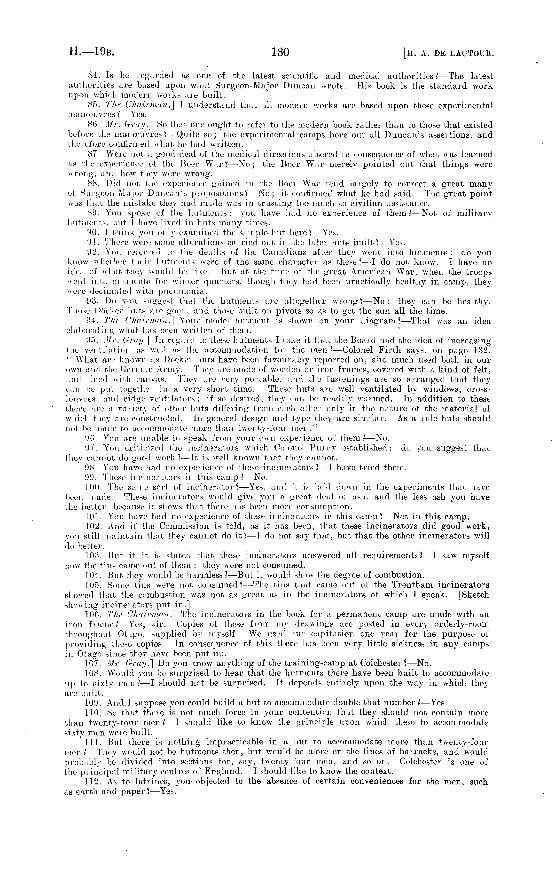 84. Is he regarded as one of the latest scientific and medical authorities?— The latest authorities are based upon what Surgeon-Major Duncan wrote. His book is the standard work upon which modern works are built. 85. The Chairman!] I understand that all modern works are based upon these experimental manoeuvres ?—Yes. 86. Mr. Gray.] So that one ought to refer to the modern book rather than to those that existed before the manoeuvres?— Quite so; the experimental camps bore out all Duncan's assertions, and therefore confirmed what he had written. 87. Were not a good deal of the medical directions altered in consequence of what was learned as the experience of the Boer War? —No; the Boer War merely pointed out that things were wrong, and how they were wrong. 88. Did not the experience gained in the Boer War tend largely to correct a great many 7 of Surgeon-Major Duncan's propositions?—No; it confirmed what he had said. The great point was that the mistake they had made was in trusting too much to civilian assistance. 89. You spoke of the hutments: you have had no experience of them? —Not of military hutments, but I have lived in huts many times. 90. I think you only examined the sample hut here? —Yes. 91. There were some alterations carried out in the later huts built?— Yes. 92. You referred to the deaths of the Canadians after they went into hutments : do you know whether (heir hutments were of the same character, as these? —I do not know. I have no idea of what they would be like. But at the time of the great American War, when the troops went, into hutments for winter quarters, though they had been practically healthy in camp, they were decimated with pneumonia. 93. Do you suggest that the hutments are altogether wrong?—No; they can be healthy. Those Docker huts are good, and those built on pivots so as fo get the sun all the time. 1)4. The Chairman.] Your model hutment is shown on your diagram?— That, was an idea elaborating what has been written of them. 95. Mr. Gray.] In regard to these hutments I take it that the Board had the idea of increasing (he ventilation as well as the accommodation for the men?— Colonel Firth says, on page 132, " What are known as Docker huts have been favourably reported on, and much used both in our own and the German Army. They are made of wooden or iron frames, covered with a kind of felt, and lined with canvas. They are very 7 portable, and the fastenings are so arranged that they can be put together in a very short time. These huts are well ventilated by windows, crosslouvres, and ridge ventilators; if so desired, they can be readily warmed. In addition to these there are a variety of other huts differing from each other only in the nature of the material of which they are constructed. In general design and type they are similar. As a rule huts should not be made to accommodate more than twenty-four men." 96. You are unable to speak from your own experience of them?— No. i) 7. You criticized tlie incinerators which Colonel Purdy 7 established: do you suggest that they cannot do good work?—lt is well known that they cannot. 98. You have had no experience of these incinerators? —I have tried them. ill). These incinerators in this camp?— No. TOO. The same sort of incinerator?— Yes, and it, is laid down in the experiments that have been made. These incinerators would give you a great deal of ash, and the less ash you have the better, because it shows that there has been more consumption. 101. You have had no experience of these incinerators in. this camp?— Not in this camp. 102. And if the Commission is told, as it has been, that these incinerators did good work, you still maintain that they cannot do it? —I do not say that, but that the other incinerators will do better. 103. But if it is stated that these incinerators answered all requirements?—l saw myself how the tins came out of them : they were not consumed. 104. But they would be harmless? —But it would show the degree of combustion. 1,05. Some tins were not consumed? —The tins that came out, of the Trentham incinerators showed that the combustion was not as great as in the incinerators of which I speak. [Sketch showing incinerators put in.] 106. The Chairman.] Tlie incinerators in the book for a permanent camp are made with an iron frame?— Yes, sir. Copies of these from my drawings arc posted in every orderly-room throughout Otago, supplied by 7 myself. We used our capitation one year for the purpose of providing these copies. In consequence of this there has been very little sickness in any camps in Otago since they have been put up. 107. Mr. Gray.] Do you know anything of the training-camp at Colchester?— No. 108. Would you be surprised to hear that the hutments there have been built, to accommodate up to sixty men? —I should not be surprised. It, depends entirely upon the way in which they are built. 109. And I suppose you could build a hut to accommodate double that number?— Yes. 110. So that there is not much force in your contention that they should not contain more than twenty-four men?—l should like to know the principle upon which these to accommodate sixty men were built. HI. But there is nothing impracticable in a hut to accommodate more than twenty-four men? —They would not be hutments then, but would be more on the lines of barracks, and would probably be divided into sections for, say, twenty-four men, and so on. Colchester is one of the principal military centres of England. I should like to know the context. 112. As to latrines, you objected to the absence of certain conveniences for the men, such as earth and paper?— Yes.