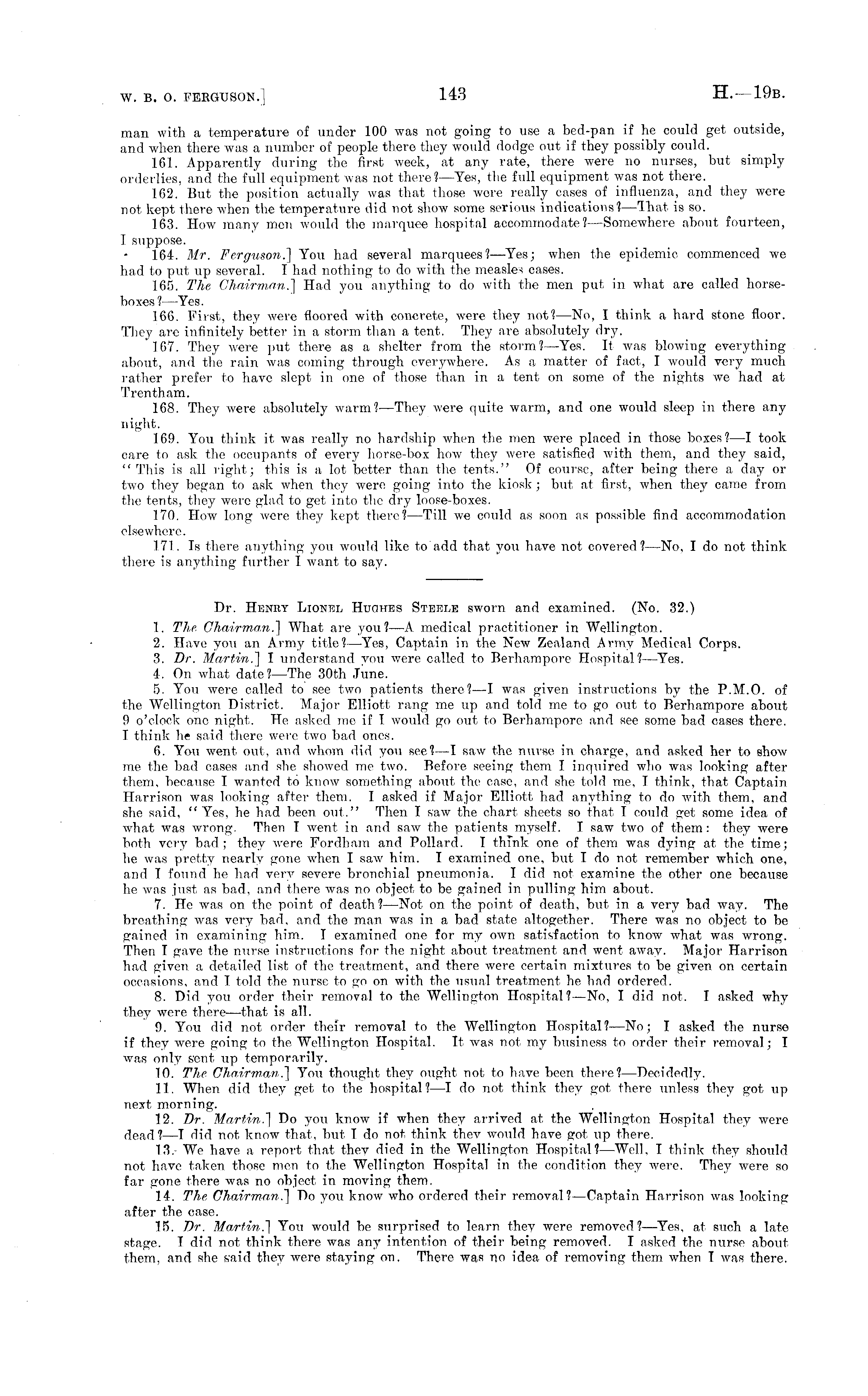man with a temperature of under 100 was not going to use a bed-pan if he could get outside, and when there was a number of people there they would dodge out if they possibly could. 161. Apparently during the first week, at any rate, there were no nurses, but simply orderlies, and the full equipment was not there ?—Yes, the full equipment was not there. 162. But the position actually was that those wore really cases of influenza, and they were not kept there when the temperature did not show some serious indications? —That is so. 163. How many men would the marquee hospital accommodate? —Somewhere about fourteen, I suppose. 164. Mr. Ferguson.] You had several marquees?— Yes; when the epidemic, commenced we had to put up several. I had nothing to do with the measles cases. 165. The Chairman.] Had you anything to do with the men put in what are called horseboxes ?—Yes. 166. First, they were floored with concrete, were they not? —No, I think a hard stone floor. They are infinitely better in a storm than a tent. They are absolutely dry. 167. They were put there as a shelter from the storm? —Yes. It was blowing everything about, and the rain was coming through everywhere. As a matter of fact, I would very much rather prefer to have slept in one of those than in a tent, on some of the nights we had at Trentham. 168. They were absolutely warm?— They were quite warm, and one would sleep in there any night. 1.69. You think it was really no hardship when the men were placed in those boxes? —I took care to ask the occupants of every horse-box how they were satisfied with them, and they said, " This is all right; this is a lot better than the tents." Of course, after being there a day or two they began to ask when they were going into the kiosk ; but at first, when they came from the tents, they were glad to get into the dry loose-boxes. 170. How long were they kept there? —Till we could as soon as possible find accommodation elsewhere. 171. Is there anything you would like to add that you have not covered?—No, I do not think there is anything further I. want to say. Dr. Henby Lionel Huohes Steele sworn and examined. (No. 32.) 1. The Chairman.] What are you?—A medical practitioner in Wellington. 2. Have you an Army title?— Yes, Captain in the New Zealand Army Medical Corps. 3. Dr. Martin.] I understand you were called to Berhampore Hospital?— Yes. 4. On what date?— The 30th June. 5. You were called to see two patients there?—l was given instructions by the P.M.O. of the Wellington District. Major Elliott, rang me up and told me to go out to Berhampore about 9 o'clock one night, He asked me if I would go out, to Berhampore and see some bad cases there. I think he said there were two bad ones. 6. You went out, and whom did you see? —I saw the nurse in charge, and asked her to show me the bad cases and she showed me two. Before seeing them I inquired who was looking after them, because I wanted to know something about the case, and she told me, I think, that Captain Harrison was looking after them. I asked if Major Elliott had anything to do with them, and she said, "Yes, he had been out," Then I saw the chart sheets so that, T could get some idea of what was wrong. Then I went in and saw the patients myself. I saw two of them: they were both very bad; they w-ere Fordham and Pollard. I think one of them was dying at the time; he was pretty nearly gone when I saw him. I examined one, but Ido not remember which one, and I found he had very severe bronchial pneumonia. I did not examine the other one because he was just as bad, and there was no object to be gained in pulling him about. 7. He was on the point of death?— Not on the point of death, but in a very bad way. The breathing was very bad, and the man was in a bad state altogether. There was no object to be gained in examining him. I examined one for my own satisfaction to know what was wrong. Then I gave the nurse instructions for the night about treatment and went away. Major Harrison had given a detailed list of the treatment, and there were certain mixtures to be given on certain occasions, and I told the nurse to go on with the usual treatment he had ordered. 8. Did you order their removal to the Wellington Hospital?—No, I did not. I asked why they were there—that is all. 9. You did not order their removal to the Wellington Hospital?—No; I asked the nurse if they were going to the Wellington Hospital. It was not my business to order their removal; I was only sent up temporarily. 10. The Chairman.] You thought they ought not to have been there?— Decidedly. 11. When did they get to the hospital?—l do not think they got there unless they got up next morning. 12. Dr. Martin.] Do you know if when they arrived at the Wellington Hospital they were dead? —I did not know that, but Ido not think they would have got, up there. 13.- We have a report that they died in the Wellington Hospital?— Well, T think they should not have taken those men to the Wellington Hospital in the condition they were. They were so far gone there was no object in moving them. 14. The Chairman.] Do you know who ordered their removal?— Captain Harrison was looking after the case. 15. Dr. Martin.] You would be surprised to learn they were removed?— Yes, at such a late stage. I did not think there was any intention of their being removed. I asked the nurse about, them, and she said they were staying on. There was no idea of removing them when T was there.