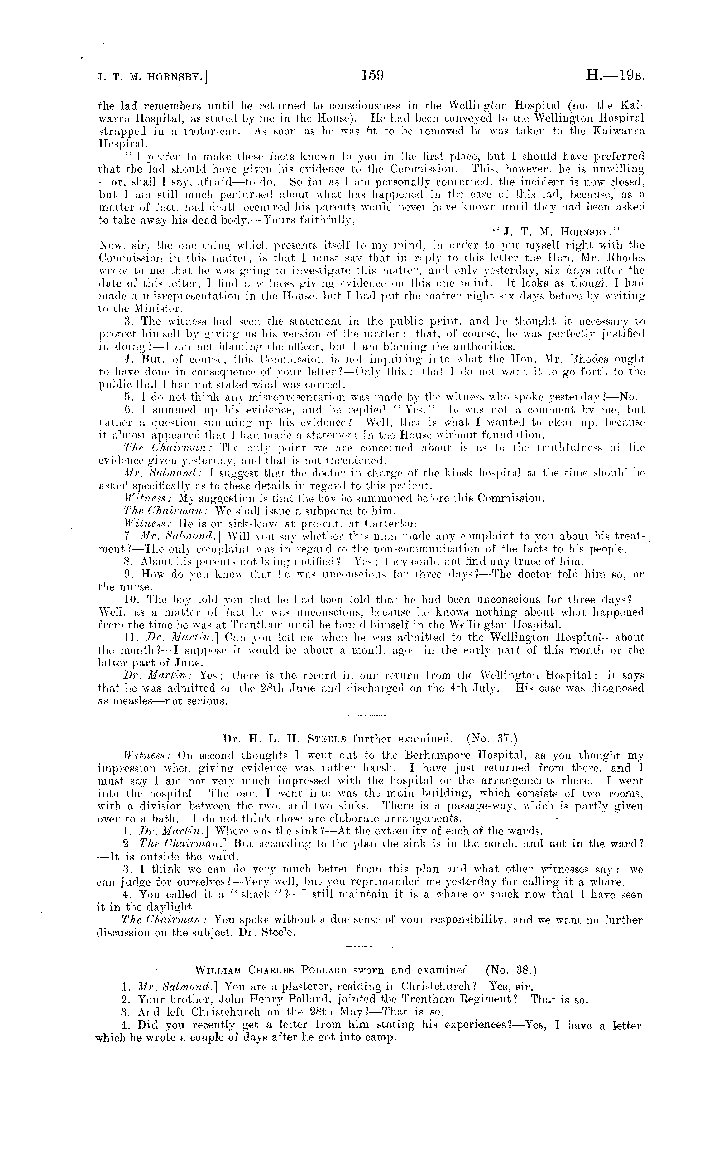 the lad remembers until he returned to consciousness in the Wellington Hospital (not the Kaiwarra Hospital, as stated by me in the House). He had been conveyed to the Wellington Hospital strapped in a motor-car. As soon as he was fit to be removed he was taken to the Kaiwarra Hospital. " 1 prefer to make these facts known to you in the first place, but I should have preferred that the lad should have given his evidence to the Commission. This, however, he is unwilling —or, shall I say, afraid —to do. So far as lam personally concerned, the incident is now closed, but I am still much perturbed about what has happened in the case of this lad, because, as a matter of fact, had death occurred his parents would never have known until they had been asked to take away his dead body.—Yours faithfully, "J. T. M. Hobnsby." Now, sir, the one thing which presents itself to my mind, in order to put myself right with the Commission in this matter, is that I must say that in reply to this letter the Hon. Mr. Rhodes wrote to me that he was going to investigate this matter, and only yesterday, six days after the date of this letter, I find a witness giving evidence on this one point. It looks as though I had. made a misrepresentation in the House, but, I had put the matter right six day-s before by writing to -the Minister. 3. The witness had seen the statement in the public print, and he thought it necessary to protect himself by giving us his version of the matter : that, of course, he was perfectly justified in doing?—l am not blaming the officer, but lam blaming the authorities. 4. But, of course, this Commission is not inquiring into what the Hon. Mr. Rhodes ought to have done in consequence of your letter?— Only this: (hat I do not want it to go forth to the public that I had not stated what was correct, 5. I do not, think any misrepresentation was made by the witness who spoke yesterday? —No. 6. I summed up his evidence, and he replied "Yes." It, was not a comment by me, but rather a question summing up his evidence?— Well, that is what I wanted to clear up, because it almost appeared that I had made a statement in the House without foundation. The Chairman: The only point we are concerned about is as to the truthfulness of the evidence given yesterday, and that is not threatened. Mr. Salmond: I suggest that the doctor in charge of the kiosk hospital at the time should be asked specifically as to these details in regard to this patient. Witness: My suggestion is that the boy be summoned before this Commission. The Chairman: We shall issue a subpoena to him. Witness: He is on sick-leave at present, at Carterton. 7. Mr. Salmond.] AVill you say whether this man made any complaint to you about his treatment?— The only complaint was in regard to the non-communication of the facts to his people. 8. About his parents not being notified? —Yes; they could not find any trace of him, 9. How do you know that he was unconscious for three days?— The doctor told him so, or the nurse. 10. The boy told you that ho had been told that, he had been unconscious for three days? — Well, as a matter of fact he was unconscious, because he knows nothing about what happened from the time he was at Trentham until he found himself in the Wellington Hospital. 11. Dr. Martin.] Can you tell me when he was admitted to the Wellington Hospital—about, the month?—l suppose it would be about a month ago —in the early part of this month or the latter part of June. Dr. Martin : Yes ; there is (he record in our return from the Wellington Hospital : it says that he was admitted on the 28th June and discharged on the 4th July. His case was diagnosed as measles—not serious. Dr. 11. L. H. Steele further examined. (No. 37.) Witness: On second thoughts I went out to the Berhampore Hospital, as you thought my impression when giving evidence was rather harsh. I have just returned from there, and I must, say I am not. very much impressed with the hospital or the arrangements there. I went into the hospital. The part I went into was the main building, which consists of two rooms, with a division between the two, and two sinks. There is a passage-way, which is partly given over to a bath. Ido not think those are elaborate arrangements. 1. Dr. Martin.] Where was the sink? —At the extremity of each of the wards. 2. The Chairman.] But according to the plan the sink is in the porch, and not in the ward? —It, is outside the ward. 3. I think we can do very much better from this plan and what other witnesses say : we can judge for ourselves?— Very well, but you reprimanded me yesterday for calling it a whare. 4. You called it a "shack "?—I still maintain it is a whare or shack now that I have seen it, in the da}dight, The Chairman: You spoke without a due sense of your responsibility, and we want no further discussion on the subject, Dr. Steele. William Charles Pollard sworn and examined. (No. 38.) 1. Mr. Salmond,.] You are a plasterer, residing in Christchurch I—Yes,1 —Yes, sir. 2. Your brother, John Henry Pollard, jointed the Trentham Regiment?— That is so. 3. And left Christchurch on the 28th May?— That is so. 4. Did you recently get a letter from him stating his experiences?— Yes, I have a letter which he wrote a couple of days after he got into camp.