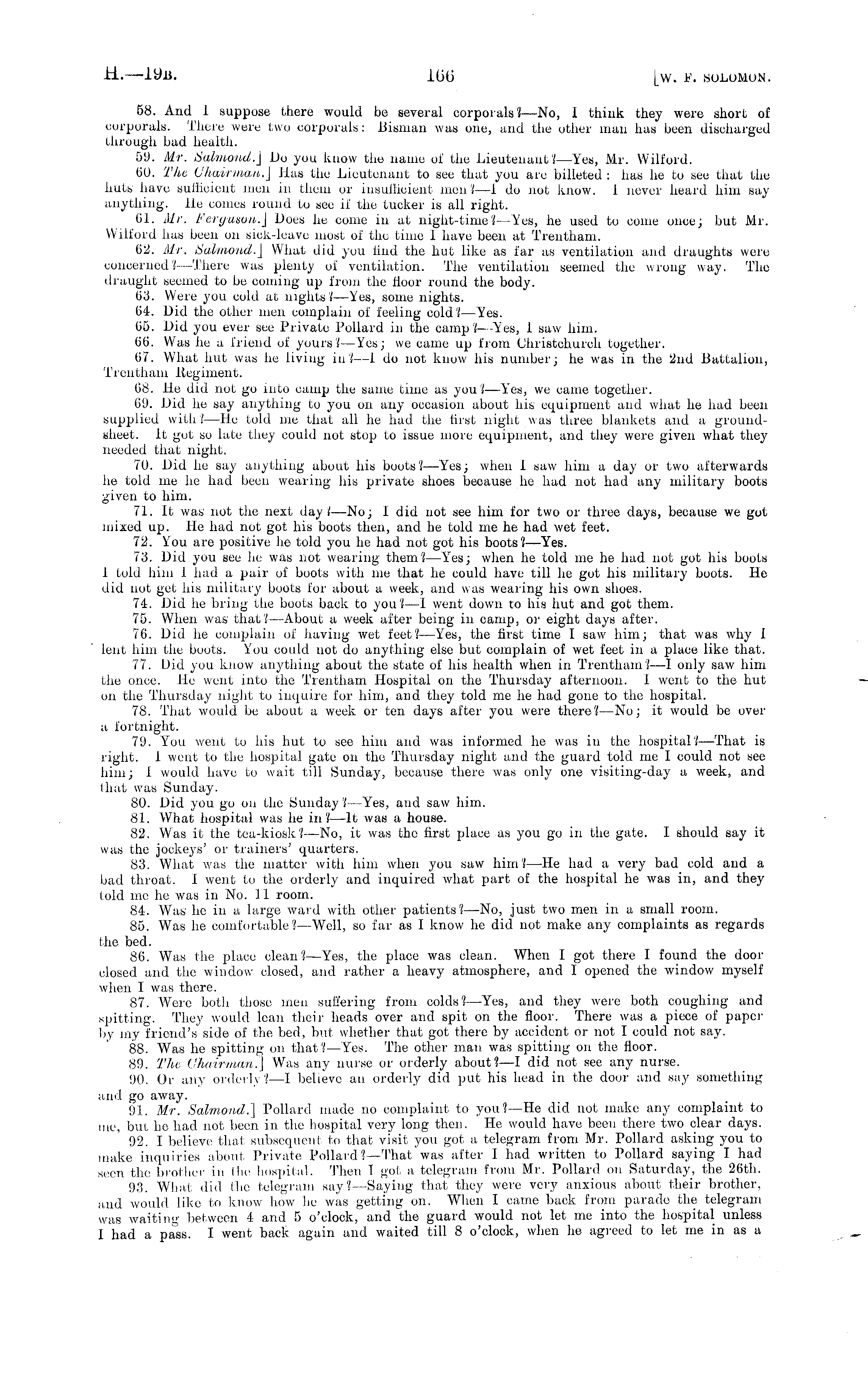 58. And 1 suppose there would be several corporals?—No, I think they were short of corporals. There were two corporals: Bisman was one, and the other man has been discharged through bad health. 59. Mr. Salmond.] Do you know the name of the Lieutenant?— Yes, Mr. Wili'ord. 60. The Chairman.] Has the Lieutenant to see that you are billeted : has he to see that the huts have sufficient men in them or insufficient men ?—1 do not know. 1 never heard him say anything. He comes round to see if the tucker is all right. 61. Mr. Ferguson.] Does he come in at night-time?— Yes, he used to come once; but Mr. Wilford has been on sick-leave most of the time I have been at Trentham. 62. Mr. Salmond.] What did you find the hut like as far as ventilation and draughts were concerned?— There was plenty of ventilation. The ventilation seemed the wrong way. The draught seemed to be coining up from the floor round the body. 63. Were you cold at nights?— Yes, some nights. 64. Did the other men complain of feeling cold ?—Yes. 65. Did you ever see Private Pollard in the camp ?—Y'es, I saw him. 66. Was he a friend of yours?— Yes; we came up from Christchurch together. 67. AVhat hut was he living in?—l do not know his number; he was in the 2nd Battalion, Trentham Regiment. 68. He did not go into camp the same time as you?— Yes, we came together. 69. Did he say anything to you on any occasion about his equipment and what he had been supplied with?—He told me that all he had the first night was three blankets and a groundsheet. It got so late they could not stop to issue more equipment, and they were given what they needed that night. 70. Did he say anything about his boots?— Yes; when I saw him a day or two afterwards he told me he had been wearing his private shoes because he had not had any military boots given to him. 71. It was not the next day?—No; I did not see him for two or three days, because we got mixed up. He had not got his boots then, and he told me he had wet feet. 72. You are positive he told you he had not got his boots?-—Yes. 73. Did you see he was not wearing them?— Yes; when he told me he had not got his boots I told him I had a pair of boots with me that he could have till he got his military boots. He did not get his military boots for about a week, and was wearing his own shoes. 74. Did he bring the boots back to you?—l went down to his hut and got them. 75. When was that? —About a week after being in camp, or eight days after. 76. Did he complain of having wet feet?— Yes, the first time I saw him; that was why I lent him the boots. You could not do anything else but complain of wet feet in a place like that. 77. Did you know anything about the state of his health when in Trentham? —I only saw him the once. He went into ihe Trentham Hospital on the Thursday afternoon. I went to the hut on the Thursday night to inquire for him, and they told me he had gone to the hospital. 78. That would be about a week or ten days after you were there?—No; it would be over a fortnight. 79. You went to his hut to see him and was informed he was in the hospital?— That is right. I went to the hospital gate on the Thursday night and the guard told me I could not see him; I would have to wait till Sunday, because there was only one visiting-day a week, and that was Sunday. 80. Did you go on the Sunday?— Yes, and saw him. 81. AVhat hospital was he in?—lt was a house. 82. Was it the tea-kiosk? —No, it was the first place as you go in the gate. I should say it was the jockeys' or trainers' quarters. 83. What was the matter with him when you saw him?—He had a very bad cold and a bad throat. I went to the orderly and inquired what part of the hospital he was in, and they told me he was in No. 11 room. 84. AVas he in a large ward with other patients? —No, just two men in a small room. 85. Was he comfortable? —AVell, so far as I know he did not make any complaints as regards the bed. 86. Was the place clean? —Yes, the place was clean. When I got there I found the door closed and the window closed, and rather a heavy atmosphere, and I opened the window myself when I was there. 87. AVere both those men suffering from colds? —Yes, and they were both coughing and spitting. They would lean their heads over and spit on the floor. There was a piece of paper by my friend's side of the bed, but whether that got there by accident or not I could not say. 88. Was he spitting on that? —Yes. The other man was spitting on the floor. 89. The Chairman.] Was any nurse or orderly about? —I did not see any nurse. 90. Or any orderly ?—I believe an orderly did put his head in the door and say something and go away. 91. Mr. Salmond.] Pollard made no complaint to you?—He did not make any complaint to me, but he had not been in the hospital very long then. He would have been there two clear days. 92. I believe that subsequent, to that visit you got a telegram from Mr. Pollard asking you to make inquiries about Private Pollard ?—That was after I had written to Pollard saying I had seen the brother in the hospital. Then I got a telegram from Mr. Pollard on Saturday, the 26th. 93. What did the telegram say?— Saying that they were very anxious about their brother, and would like to know how lie was getting on. When I came back from parade the telegram was waiting between 4 and 5 o'clock, and the guard would not let me into the hospital unless I had a pass. I went back again and waited till 8 o'clock, when he agreed to let me in as a