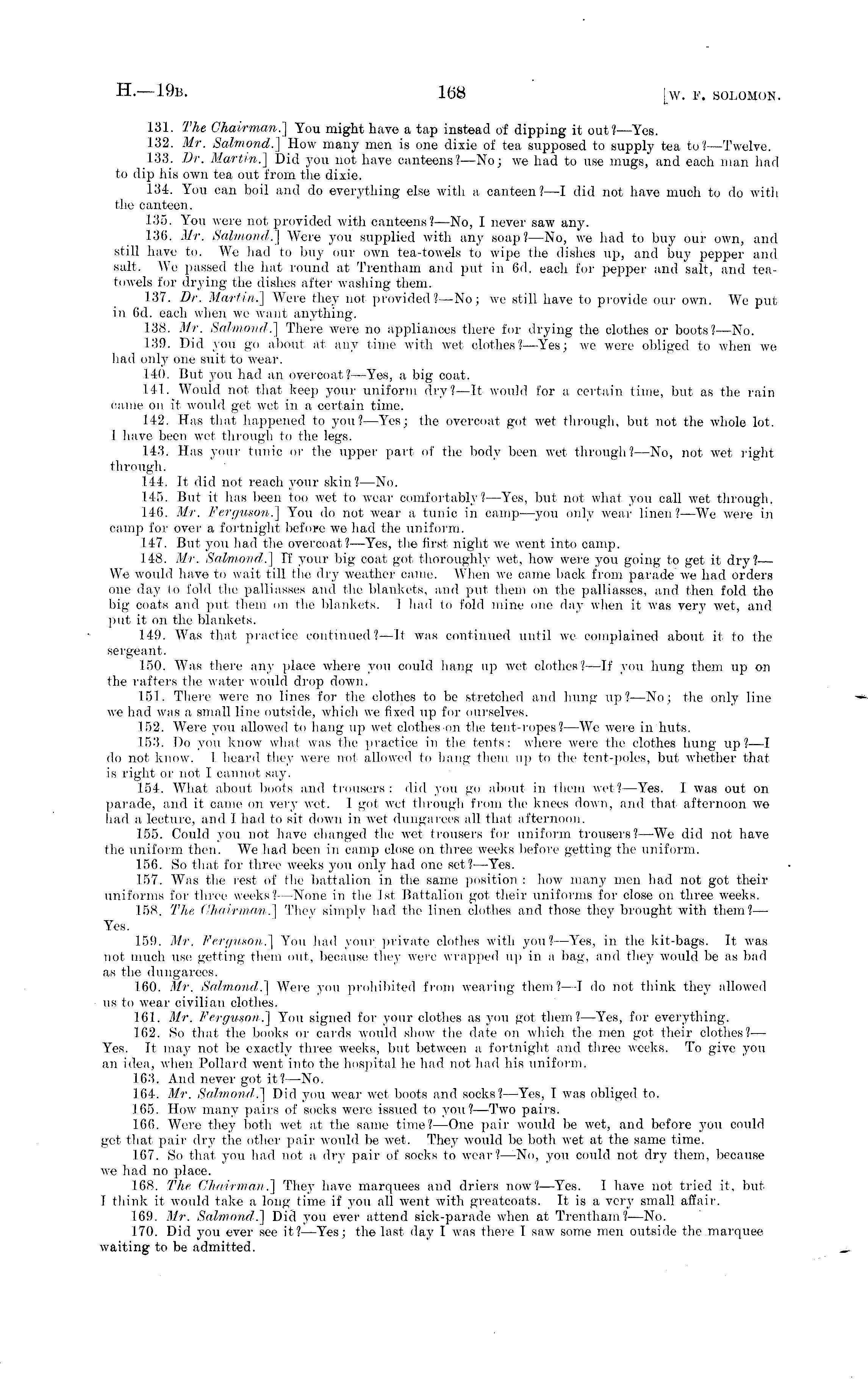 131. The You might have a tap instead of dipping it out?— Yes. 132. Mr. Salmond.] How many men is one dixie of tea supposed to supply tea to? —Twelve. 133. Dr. Martin.] Did you not have canteens? —No; we had to use mugs, and each man had to dip his own tea out from the dixie. 134. You can boil and do everything else with a canteen?—l did not have much to do with the canteen. 135. You were not provided with canteens? —No, I never saw any. 136. Mr. Salmond.] Were you supplied with any soap?—No, we had to buy our own, and still have to. We had to buy our own tea-towels to wipe the dishes up, and buy pepper and salt. We passed the hat round at Trentham and put in 6d. each for pepper and salt, and teatowels for drying the dishes after washing them. 137. Dr. Martin.] Were they not provided?—No; we still have to provide our own. We put in 6d. each when we want anything. 138. Mr. Salmond.] There were no appliances there for drying the clothes or boots?— No. 139. Did you go about at any time with wet, clothes? —Yes; we were obliged to when we had only one suit to wear. 140. But you had an overcoat? —Yes, a big coat. 141. Would not that keep your uniform dry?—lt would for a, certain time, but as the rain came on it would get wet in a certain time. 142. Has that happened to you?— Yes; the overcoat got wet through, but not the whole lot. I have been wet through to the legs. 143. Has your tunic or the upper part of the body been wet through? —No, not wet right through. 144. It did not reach your skin? —No. 145. But it has been too wet to wear comfortably?— Yes, but not what you call wet through. 146. Mr. Ferguson.] You do not wear a tunic in camp —you only wear linen? —We were in camp for over a fortnight before we had the uniform. 147. But you had tlie overcoat? —Yes, the first night we went into camp. 148. Mr. Salmond.] If your big coat got, thoroughly wet, how were you going to get it dry?— We would have to wait till the, dry weather came. When we came back from parade'we had orders one day to fold the palliasses and the blankets, and put them on the palliasses, and then fold the big coats and put them on the blankets. I had to fold mine one day when it was very wet, and put it on the blankets. 149. Was that practice continued? —It was continued until we complained about it, to the sergeant. 150. Was there any place where y 7 ou could hang up wet clothes?—lf you hung them up on the rafters the water would drop down. 151. There were no lines for the clothes to be stretched and hung up?—No; the only line we had was a small line outside, which we fixed up for ourselves. 152. Were y 7 ou allowed to hang up wet clothes-on the tent-ropes?—AVe were in huts. 153. Do you know what was the practice in the tents: where were the clothes hung up?—l do not know. I heard they were not allowed to hang them up to the tent-poles, but whether that, is right or not I cannot say. 154. What about boots and trousers : did you go about in them wet? —Yes. I was out on parade, and it came on very wet. I got wet through from the knees down, and that afternoon we had a lecture, and I had to sit down in wet dungarees all that afternoon. 155. Could you not have changed the wet trousers for uniform trousers? —We did not have the uniform then. We had been in camp close on three weeks before getting the uniform. 156. So that for three weeks you only had one set? —Yes. 157. Was the rest of the battalion in the same position : how many men had not got their uniforms for three weeks?— None in the Ist Battalion got their uniforms for close on three weeks. 158. The Chairman.] They simply had the linen clothes and those they brought with them?— Yes. 159. Mr. Ferguson.] You had your private clothes with you? —Yes, in the kit-bags. It was not much use getting them out, because they were wrapped up in a bag, and they would be as bad as the dungarees. 160. Mr. Salm,ond.] Were you prohibited from wearing them? —I do not think they 7 allowed us to wear civilian clothes. 161. Mr. Ferguson.] You signed for your clothes as you got them?— Yes, for everything. 162. So that the books or cards would show the date on which the men got their clothes?— Yes. It may not be exactly three weeks, but, between a fortnight and three weeks. To give you an idea, when Pollard went into the hospital he had not had his uniform. 163. And never got it?— No. 164. Mr. Salmond.] Did you wear wet boots and socks?— Yes, I was obliged to. 165. How many pairs of socks were issued to y 7 ou ?—Two pairs. 166. Were they both wet at the same time? —One pair would be wet, and before you could got that pair dry the other pair would be wet. They would be both wet at the same time. 167. So that you had not a dry pair of socks to wear? —-No, you could not dry them, because we had no place. 168. The Chairman.] They 7 have marquees and driers now?— Yes. I have not tried it, but I think it would take a long time if you all went with greatcoats. It is a very small affair. 169. Mr. Salmond.] Did y 7 ou ever attend sick-parade when at Trentham? —No. 170. Did you ever see it?— Yes; the last day I was there I saw some men outside the marquee waiting to be admitted.