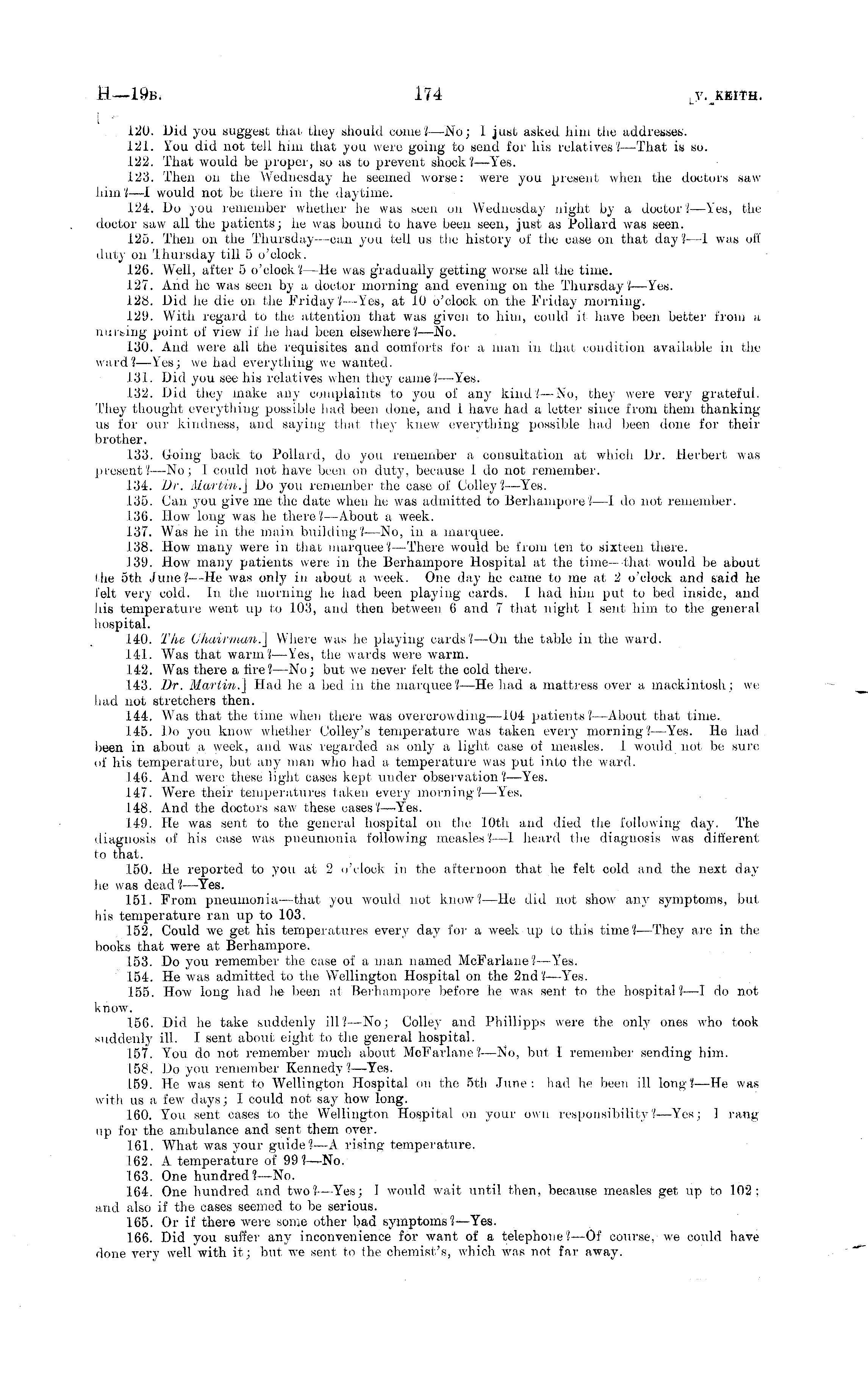 1 120. Did you suggest that they should come?—No; 1 just asked him the addresses'. 121. You did not tell him that you were going to send for his relatives? —That is so. 122. That would be proper, so as to prevent shock?— Yes. 123. Then on the Wednesday he seemed worse: were you present, when the doctors saw him? —I would not be there in the daytime. 124. Do you remember whether he was seen on Wednesday night by a doctor? —Yes, the doctor saw all the patients; lie was bound to have been seen, just as Pollard was seen. 125. Then on the Thursday —can you tell us the history of the case on that day? —I was off duty on Thursday till 5 o'clock. 126. Well, after 5 o'clock? —He was gradually getting worse all the time. 127. And he was seen by a doctor morning and evening on the Thursday?-—Yes. 128. Did he die on the Friday? —Yes, at 10 o'clock on the Friday morning. 129. With regard to the attention that was given to him, could it have been better from a nursing point of view if he had been elsewhere? —No. 130. And were all the requisites and comforts for a man in that condition available in the ward?— Yes; we had everything we wanted. 131. Did you see his relatives when they came? —-Yes. 132. Did they make any complaints to you of any kind? — No, they were very grateful. They thought everything possible had been done, and 1 have had a letter since from them thanking us for on)' kindness, aud saying that they knew everything possible had been, done for their brother. 133. Going back to Pollard, do you remember a consultation at which Dr. Herbert was present?—No; I could not have been on duty, because I elo not remember. 134. Dr. Martin.] Do you remember the case of Colley?—Yes. 135. Can you give me the date when he was admitted to Berhampore?—l do not remember. 136. How long was he there? —About a week. 137. Was he in the main building?—No, in a marquee. 138. How many were in that marquee?— There would be from ten to sixteen there. 139. How many patients were in the Berhampore Hospital at the time— that would be about the sth June? —He was only in about a week. One day he came to me at 2 o'clock and said he felt very cold. In the morning he had been playing cards. I had him put to bed inside, aud his temperature went up to 103, and then between 6 and 7 that night 1 sent him to the general hospital. 140. The Chairman] Where was he playing cards?—On the table in. the ward. 141. Was that warm?— Yes, the wards were warm. 14-2. Was there a fire? —No; but we never felt the cold there. 143. Dr. Martin.] Had he a bed in the marquee?-—He had a mattress over a mackintosh; we had not stretchers then. 144. Was that the time when there was overcrowding—lo4 patients?— About that time. 145. Do you know whether Colley's temperature was taken every morning?— Yes. He had been in about a week, and was regarded as only a light case of measles. 1 would not be sure. of his temperature, but any man who had a temperature was put into the ward. 146. And were these light cases kept under observation?— Yes. 147. Were their temperatures taken every morning?— Yes. 148. And the doctors saw these cases?— Yes. 149. He was sent to the general hospital on the 10th and died the following day. The diagnosis of his case was pneumonia following measles?—l heard the diagnosis was different, to that. 1.50. He reported to you at 2 o'clock in the afternoon that he felt cold and the next day he was dead ?—Yes. 151. From pneumonia—that you would not know? —He did not show any symptoms, but his temperature ran up to 103. 152. Could we get his temperatures every day for a week up to this time?— They are in the hooks that were at Berhampore. 153. Do you remember the case of a man. named McFarlane? —Yes. 154. He was admitted to the Wellington Hospital on the 2nd ?—Yes. 155. How long had he been at Berhampore before he was sent to the hospital?—l do not know. 1.56. Did he take suddenly ill?—No; Colley and Phillipps were the only ones who took suddenly ill. I sent about eight to the general hospital. 157. You do not remember much about McFarlane?—No, but I remember sending him. 158. Do you remember Kennedy?— Yes. 159. He was sent to Wellington Hospital on the sth June: had he been ill long?—He was with us a few days; I could not say how long. 160. You sent cases to the Wellington Hospital on your own responsibility?— Yes; I rang up for the ambulance and sent them over. 161. What was your guide?—A rising temperature. 162. A temperature of 99?—-No. 163. One hundred?— No. 164. One hundred and two? —Yes; I would wait until then, because measles get up to 102: and also if the cases seemed to be serious. 165. Or if there were some other bad symptoms?— Yes. 166. Did you suffer any inconvenience for want of a telephone?—Of course, we could have done very well with it; but we sent to the chemist's, which was not far away.
