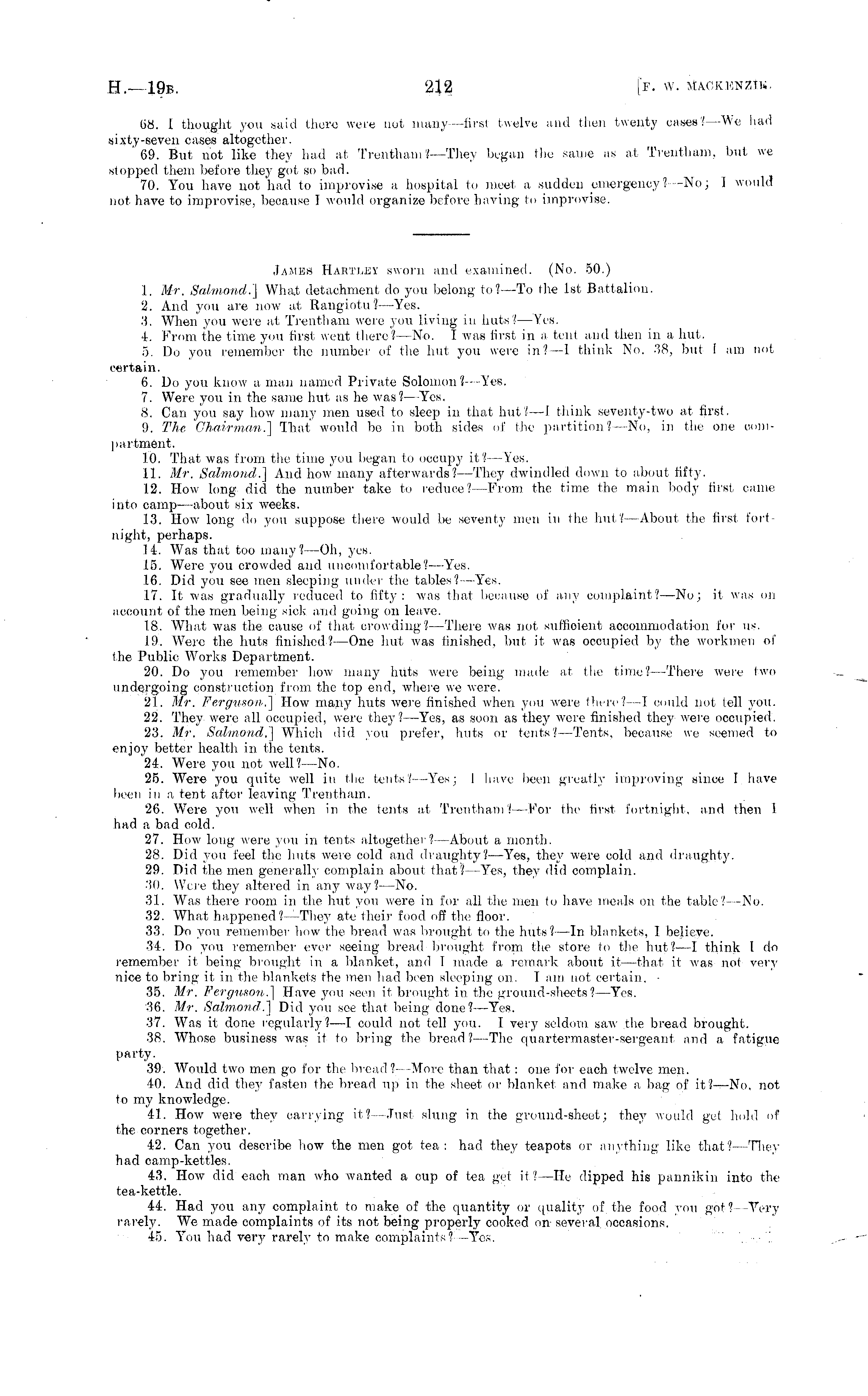 68. I thought you said there were not many —first twelve and then twenty cases? —We had sixty-seven cases altogether. '69. But not like they had at Trentham ?—They began the same as at Trentham. but we stopped them before they got, so bad. 70. You have not had to improvise a hospital to meet a sudden emergency? -No; I would not have to improvise, because I would organize before having to improvise. James HartliHY sworn and examined. (No. 50.) 1. Mr. Salmond.] What detachment do you belong to?—To the Ist Battalion. 2. And you are now at Rangiotu? —Yes. 3. When you were at, Trentham were you living in huts? —Yes. 4. From the time you first went there? —No. I was first in a tent and then in a hut, 5. Do you remember the number of the hut you were in?—l think No. 38, but I am not certain. 6. Do you know a man named Private Solomon ?---Yes. 7. Were you in the same hut as he was?— Yes. 8. Can you say how many men used to sleep in that hut?—l think seventy-two at first. 9. The Chairman.] That would bo in both sides of Ihe partition ? —No, in the one compartment. 10. That was from the time you began to occupy it? —Yes. 11. Mr. Salmond.] And how many afterwards? —They dwindled down to about fifty. 12. How long did the number take to reduce ?--From the time (he main body first came into camp —about six weeks. 13. How long do you suppose there would lie seventy men in the hut? —About the first fortnight, perhaps. 14. Was that too many?—Oh, yes. 15. Were you crowded and uncomfortable?— Yes. 16. Did you see men sleeping under the tables?— Yes. 17. It was gradually reduced to fifty: was that because of any complaint? —No; it was on account of the men being sick and going on leave. 18. What was the cause of that crowding? —There was not sufficient accommodation for us. 19. Were the huts finished? —One hut, was finished, but it, was occupied by the workmen of the Public Works Department. 20. Do you remember how many huts were being made at the time? —There were two undergoing construction from the top end, where we were. 21. Mr. Ferguson.] How many huts were finished when you were there?—l could not tell you. 22. They were all occupied, were they?— Yes, as soon as they were finished they were occupied. 23. Mr. Salmond.] Which did you prefer, huts or tents? —Tents, because we seemed to enjoy better health in the tents. 24. Were you not well? —No. 25. Were you quite well in the tents? —Yes; I have been greatly improving since I have been in a tent after leaving Trentham. 26. Were you well when in the tents at, Trentham? —For the first fortnight, and then 1 had a bad cold. 27. How long were you in tents altogether?— About a month. 28. Did you feel the huts were cold and draughty?— Yes, they were cold and draughty. 29. Did the men generally complain about that? —Yes, they did complain. ■'!(). Were they altered in any way?— No. 31. Was there room in the hut you were in for all the men to have meals on the table? -No, 32. What happened?— They ate their food off the floor. 33. Do you remember how the bread was brought to the huts? —In blankets, I believe. 34. Do you remember ever seeing bread brought from the store to the hut? —I think I do remember it being brought in a blanket, and I made a remark about it—that it was not very nice to bring it in the blankets the men had been sleeping on. lam not certain. - 35. Mr. Ferguson.] Have you seen it brought in the ground-sheets?— Yes. '36. Mr. Salmond,.] Did you see that being done?— Yes. 37. Was it done regularly? —I could not tell you. I very seldom saw the bread brought. 38. Whose business was it to bring the bread?— The quartermaster-sergeant and a fatigue party. 39. AVould two men go for the bread? —More than that: one for each twelve men. 40. nind did they fasten the bread up in the sheet, or blanket and make a bag of it? —No, not to my knowledge. 41. How were they carrying it? —Just slung in the ground-sheet; they would gel hold of the corners together. 42. Can you describe how the men got tea: had they teapots or anything like that?— They had camp-kettles. 43. How did each man who wanted a cup of tea gel it?—He dipped his pannikin into the tea-kettle. 44. Had you any complaint to make of the quantity or quality of the food you got ?--Very rarely. We made complaints of its not being properly cooked on several occasions. 45. You had very rarely to make complaints? —Yes. . '