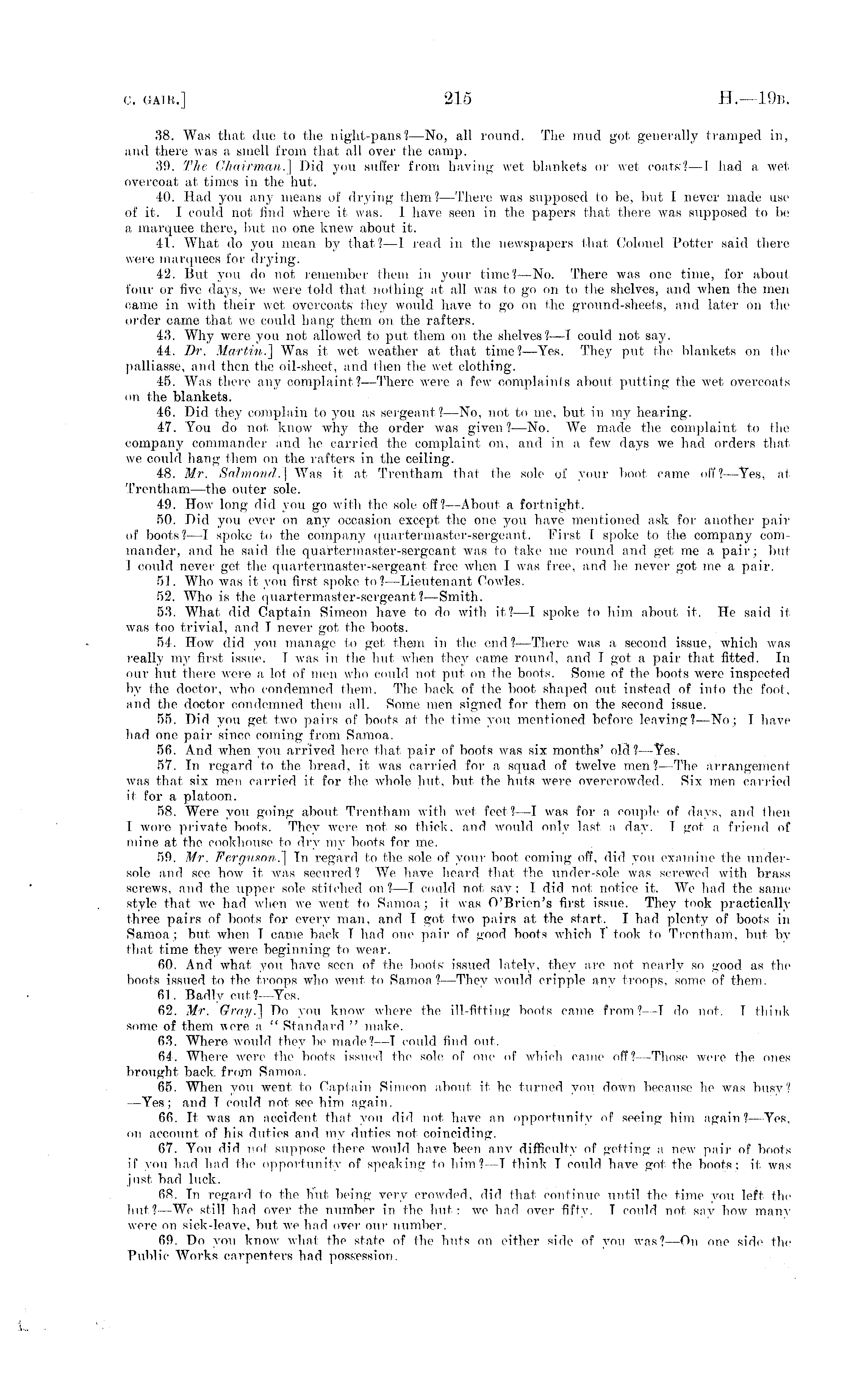 38. Was that due to the night-pans? —No, all round. The mud got generally tramped in, and there was a smell from that all over the camp. 39. The Chairman] Did you suffer from having wet blankets or wet coats?—l had a wet, overcoat at, times in the hut. 40. Had you any means of drying them?— There was supposed (o be, but I never made use of it. I could not find where it was. I have seen in the papers that, there w r as supposed to be a marquee there, but no one knew about it. 41. What do you mean by that?—l read in the newspapers that Colonel Potter said there were marquees for drying. 42. But, you do not remember them in your time?— No. There was one time, for about four or five days, we were told that nothing at all was to go on to the shelves, and when the men came in with their wet overcoats' they would have to go on the ground-sheets, and later on the order came that we could hang them on the rafters. 43. Why were you not allowed to put, them on the shelves?—l could not say. 44. Dr. Martin.] Was it wet, weather at that time?— Yes. They put the blankets on the palliasse, and then the oil-sheet, and then the wet clothing. 45. Was there any complaint?— There were a few complaints about putting the wet overcoats on the blankets. 46. Did they complain to you as sergeant?—No, not to me, but, in my hearing. 47. You do not know why the order was given?- —No. We made the oomplaint to I he company commander and he carried the complaint on, and in a few days we had orders that, we could hang them on the rafters in the ceiling. 48. Mr. Salmond.] Was it at Trentham that the sole of your boot came off?— Yes, at Trentham—the outer sole. 49. How long did you go with the sole off?— About a fortnight, 50. Did you ever on any occasion except the ono you have mentioned ask for another pair of boots? —I spoke to the company quartermaster-sergeant. First I spoke to the company commander, and he said the quartermaster-sergeant was to take me round and get me a, pair; but I could never get, the quartermaster-sergeant, free when I was free, and he never got me a pair. 51. Who was it you first spoke to?— Lieutenant Cowles. 52. Who is the quartermaster-sergeant?— Smith. 53. What did Captain Simeon have to do with it? —I spoke to him about it. He said i( was too trivial, and I never got the boots. 54. How did you manage to get them in the end? —There was a second issue, which was really my first issue. T was in the hut when they came round, and I got a pair that fitted. In our hut there were a lot of men who could not put on the boots. Some of the boots were inspected by the doctor, who condemned them. The back of the boot shaped out instead of into the fool, and the doctor condemned them all. Some men signed for them on the second issue. 55. Did you get two pairs of boots at the time you mentioned before leaving?—No; I have had one pair since coining from Samoa. 56. And when you arrived hen- that pair of boots w r as six months' old?— Yes. 57. In regard to the bread, if, was carried for a squad of twelve men?— The arrangement was that six men carried it for the whole hut, hut the huts were overcrowded. Six men carried it for a platoon. 58. Were you going about, Trentham with wet feet?—l was for a couple of days, and then I wore private boots. They were not so thick, and would only last a day. I got a friend of mine at the cookhouse to dry my boots for me. 59. Mr. Ferguson.] In regard to the sole of your boot coming off, did you examine the undersole and see how it was secured? We have heard that, the under-sole was screwed with brass screws, and the upper sole stitched on?—I could not, say; I did not notice it, We had the same style that we had when we went to Samoa; it was O'Brien's first issue. They took practically three pairs of boots for every man, and I got two pairs at the start, I had plenty of boots in Samoa; but, when I came back I had one pair of good boots which T took to Trentham. but by that time they were beginning to wear. 60. And what you have seen of the boots issued lately, they are not nearly so good as the boots issued to the troops who went to Samoa? —They would cripple any troops, some of them. 61. Badly cut?— Yes. 62. Mr. Gray.] Do you know where the ill-fitting boots came from?—l do not. I think some of them were a " Standard " make. 63. Where would they be made?—T could find out, 64. AVhere were the boots issued the sole, of one of which came off?-—Those were the ones brought, back from Samoa, 65. When you went to Captain Simeon about it he turned you down because he was busy? —Yes; and T could not, see him again. 66. It was an accident, that you did not have an opportunity of seeing him again?— Yes, on account of his duties and my duties not coinciding. 67. You did not suppose there would have been any difficulty of getting a new pair of boots if you had had the opportunity of speaking In him? I think T could have got the boots; it was just bad luck. 68. Tn regard to the hut being very crowded, did that continue until the time you left the hut?—Wc still had over the number in the hut: we had over fifty. I could not say how manr were on sick-leave, but we had over our number. 69. Do you know what the state of the huts on either side of you was? —On one side the Public Works carpenters had possession.
