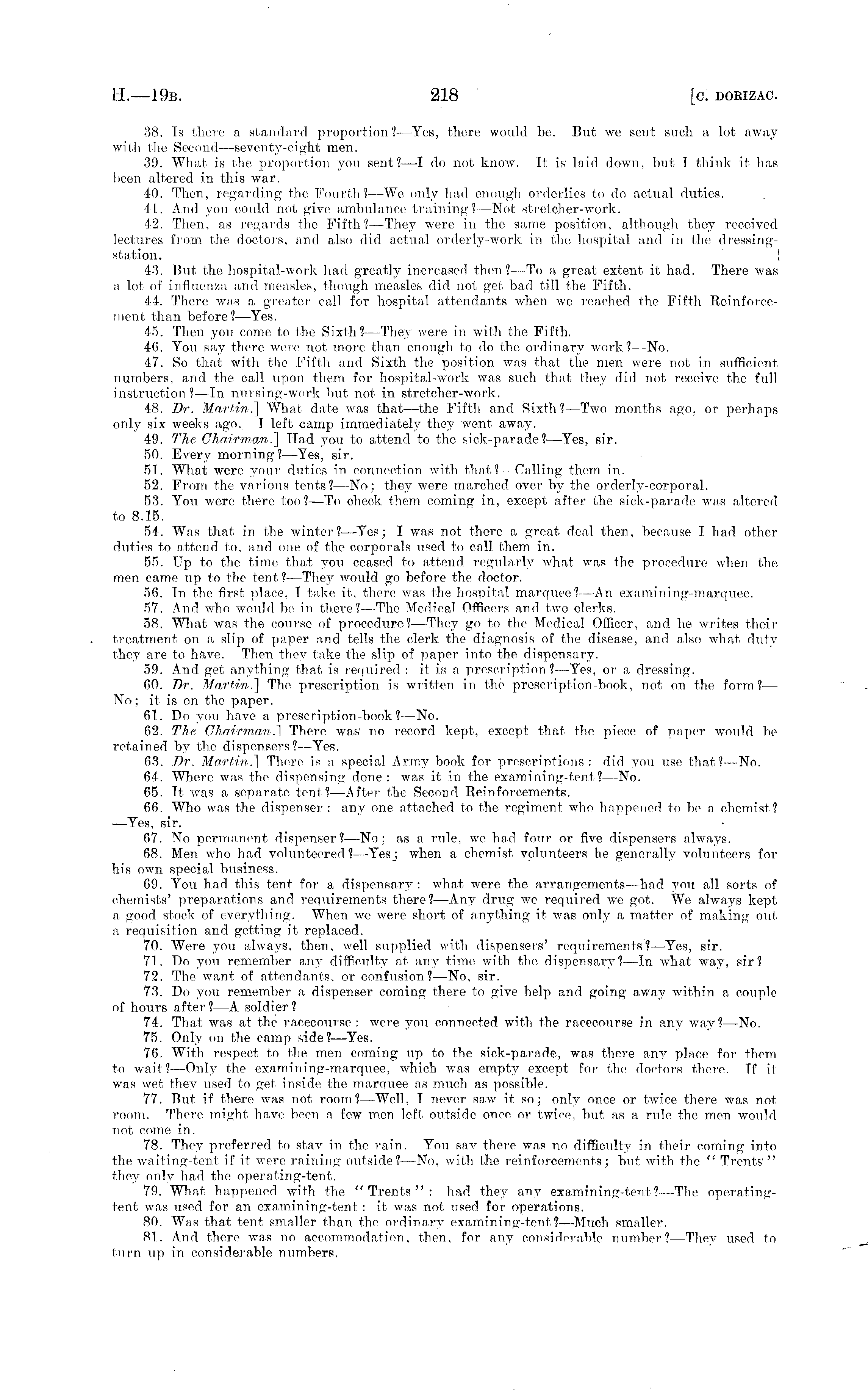 38. Is there a standard proportion? —Yes, there would be. But we sent such a lot away with the Second —seventy-eight men. 39. What is the proportion you sent? —I do not know. It. is laid down, but I think it has been altered in this war. 40. Then, regarding the Fourth?—We only had enough orderlies to do actual duties. 41. And you could not give ambulance training?— Not stretcher-work. 42. Then, as regards the Fifth?— They were in the same position, although they received lectures from the doctors, and. also did actual orderly-work in the hospital and in the dressingstation. ! 43. But the hospital-work had greatly increased then?—To a great extent it had. There was a lot of influenza and measles, though measles did not get bad till the Fifth. 44. There was a greater call for hospital attendants when we reached the Fifth Reinforcement than before? —Yes. 45. Then you come to the Sixth?— They were in with the Fifth. 46. You say there were not more than enough to do the ordinary work?— No. 47. So that with the Fifth and Sixth the position was that the men were not in sufficient numbers, and the call upon them for hospital-work was such that they did not receive the full instruction? —In nursing-work but not in stretcher-work. 48. Dr. Martin.] What, date was that—the Fifth and Sixth? —Two months ago, or perhaps only six weeks ago. I left camp immediately they went away. 49. The Chairman.] Had you to attend to the sick-parade?— Yes, sir. 50. Every morning?— Yes, sir. 51. What were your duties in connection with that?— Calling them in. 52. From the various tents?—No; they were marched over by the orderly-corporal. 53. You were there too?—To check them coming in, except after the sick-parade was altered to 8.15. 54. Was that in the winter?— Yes; I was not there a great, deal then, because T had other duties to attend to, and one of the corporals used to call them in. 55. Up to the time that you ceased to attend regularly what, was the procedure when the men came up to the tent ?—They would go before the doctor. 56. Tn the first place, I take it, there was the hospital marquee?—An examining-marquee, 57. And who would be in there? —The Medical Officers and two clerks. 58. What was the course of procedure?— They go to the Medical Officer, and he writes their treatment, on a slip of paper and tells the clerk the diagnosis of the disease, and also wdiat, duty they are to have. Then they take the slip of paper into the dispensary. 59. And get anything that is required : it is a prescription?— Yes, or a dressing. 60. Dr. Martin.] The prescription is written in the prescription-book, not, on the form? — No; it is on the paper. 61. Do you have a prescription-book? —No. 62. The Chairman.] There was no record kept, except that the piece of paper would be retained by the dispensers?— Yes. 63. Dr. Martin.] There is a special Army book for prescriptions : did you use that?— No. 64. Where was the dispensing done: was it in the examining-tent?—No. 65. It was a separate tent? —After the Second Reinforcements. 66. Who was the dispenser : any one attached to the regiment who happened to be a chemist? —Yes, sir. 67. No permanent dispenser?—No; as a rule, we had four or five dispensers always. 68. Men who had volunteered?—Yesj when a chemist volunteers he generally volunteers for his own special business. 69. You had this tent, for a dispensary : what were the arrangements —had you all sorts of chemists' preparations and requirements there?— Any drug we required we got. We always kept, a good stock of everything. When we were short of anything it was only a matter of making out a requisition and getting it replaced. 70. Were you always, then, well supplied with dispensers' requirements?— Yes, sir. 71. Do you remember any difficulty at any time with the dispensary?—ln what way, sir? 72. The want of attendants, or confusion?—No, sir. 73. Do you remember a dispenser coming there to give help and going away within a couple of hours after ?—A soldier ? 74. That was at the racecourse : were you. connected with the racecourse in any wav?—No. 75. Only on the camp side?— Yes. 76. With respect to the men coming up to the sick-parade, was there any place for them to wait? —Only the examining-marquee, which was empty except, for the doctors there. Tf it was wet they used to get, inside the marquee as much as possible. 77. But if there was not room?— Well, I never saw it so; only once or twice there was not, room. There might, have been a few men left outside once or twice, hut. as a rule the men would not come in. 78. They preferred to stay in the rain. You say there was no difficulty in their coming into the waiting-tent if it were raining outside?—No, with the reinforcements; but with the " Trents " they only had the operating-tent. 79. What happened with the "Trents": had they any examining-tent?—The operatingtent was used for an examining-tent : it was not used for operations. 80. Was that, tent smaller than the ordinary examining-tent?—Much smaller. 81. And there was no accommodation, then, for any considerable number? —They used to turn up in considerable numbers.