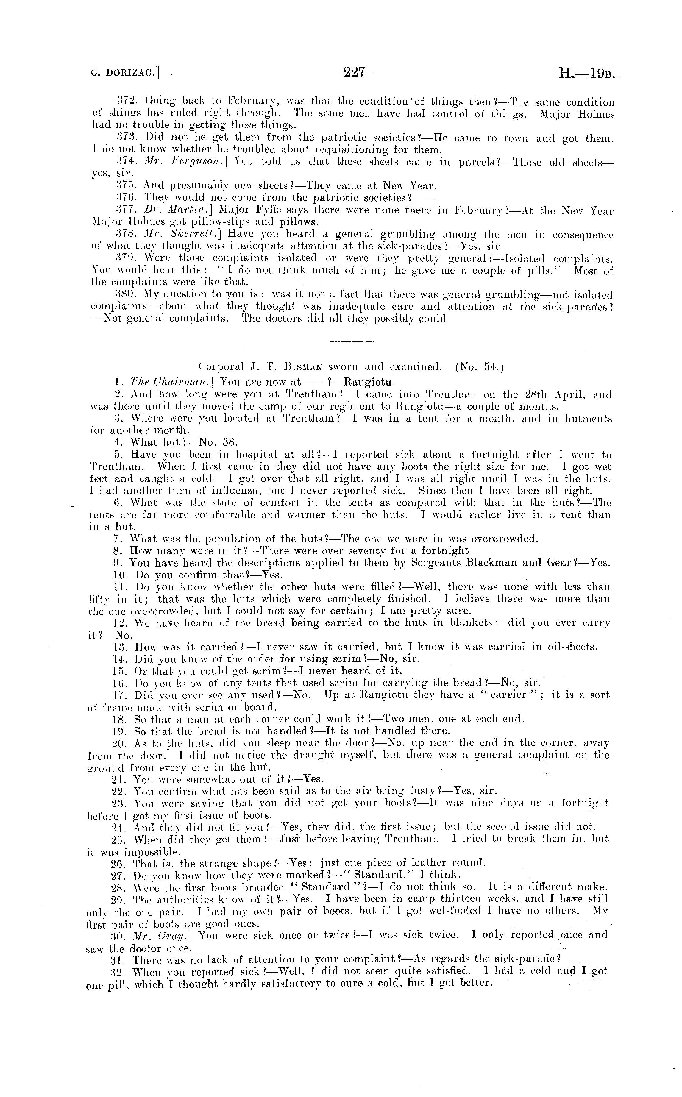 372. Going back to February, was that, the condition *of things then?— The same condition of things has ruled right through. The same men have had control of things. .Major Holmes had no trouble in getting those things. 373. Did not he get them from the patriotic societies?—He came to town and got them. 1 do not know whether he troubled about, requisitioning for them. 374. Mr. Ferguson.] You told us that these sheets came in parcels?— Those old sheets— yes, sir. 375. And presumably new sheets?— They came at New Year. 376. They would not come from the patriotic societies? 377. Dr. Martin.] Major Fyffe says there were none there in February?—At the New Year Major Holmes got pillow-slips and pillows. 378. Mr. Skerrett,.] Have you heard a general grumbling among the men in consequence of what they thought was inadequate attention at the sick-parades?— Yes, sit. 379. AVere those complaints isolated or wore they pretty general?—lsolated complaints. You would hear this: " 1 do not think much of him; he gave me a couple of pills." Most of the complaints were like that. 380. My question to you is : was it not a fact that there was general grumbling —not isolated complaints—about what they thought was inadequate care and attention at the sick-parades? —Not general complaints. The doctors did all they possibly could. Corporal J. T. Busman sworn and examined. (No. 54.) 1 . The Chairman.] You are now at ?—Rangiotu. 2. And how long were you at Trentham? —I came into Trentham on the 28th April, and was there until they moved the camp of our regiment to Rangiotu—a couple of months. 3. Where were you located at Trentham?—l was in a tent for a month, and in hutments for another month. 4. What hut?— No. 38. 5. Have you been in hospital at all?—I reported sick about a fortnight after 1 went to Trentham. When I first came in they did not have any boots the right size for me. I got wet feet and caught a cold. I got over that all right, and I was all right until 1 was in the huts. 1 had another turn of influenza, hut 1 never reported sick. Since then 1 have been all right. 6. What was the state of comfort in the tents as compared with that in the huts?— The tents arc far more comfortable and warmer than the huts. I would rather live in a tent than in a hut. 7. What was the population of the huts?— The one we were in was overcrowded. 8. How many were in it? -There were over seventy for a fortnight, 9. You have heard the descriptions applied to them by Sergeants Blackman and Gear? —Yes. 10. Do you confirm that?— Yes. 11. Do you know 7 whether the other huts were filled? —Well, there was none with less than fifty in it; that was the huts'which were completely finished. I believe there was more than the one overcrowded, but I could not say for certain; I am pretty sure. 12. AYe have heard of the bread being carried to the huts in blankets': did you ever carry it ?—No. 13. How was it carried?—l never saw it carried, but I know it was carried in oil-sheets. 14. Did you know of the order for using scrim?—No, sir. 15. Or that you could get scrim?—l never heard of it. 1.6. Do you know of any tents that used scrim for carrying the bread?—No, sir. 17. Did you ever sec any 7 used?— No. Up at Rangiotu they have a "carrier"; it is a sort of frame made with scrim or board. 1.8. So that a man at each corner could work it? —Two men, one at each end. 19. So that the bread is not handled? —It is not handled there. 20. As to the huts, did you sleep near the door?—No, up near the end in the corner, away from the door. I did not notice the draught myself, but there was a general complaint on the ground from every one in the hut. 21. You were somewhat out of it? —Yes. 22. You confirm what has been said as to the air being fusty?— Yes, sir. 23. You wore saying that you did not get your boots? —It was nine days or a fortnight before I got my first issue of boots. 24. And they did not fit you?— Yes, they did, the first issue; but the second issue did not. 25. When did they get them? —Just before leaving Trentham. I tried to break them in, but it was impossible. 26. That is, the strange shape?— Yes; just one piece of leather round. 27. Do you know how- they were marked?—" Standard," T think. 28. Were the first, boots branded "Standard"? —I do not think so. It is a different make. 29. The authorities know of it? —Yes. I have been in camp thirteen -weeks, and T have still only the one pair. I had my own pair of boots, but if I got wet-footed I have no others. My first pair of boots' are good ones. 30. Mr. Gray.] You were sick once or twice?—l was sick twice. T only reported once and saw the doctor once. 31. There was no lack of attention to your complaint?—As regards the sick-parade? 32. When you reported sick?— Well, I did not seem quite satisfied. I had a cold and I.got one pill, which I thought hardly satisfactory to cure a cold, but I got better.