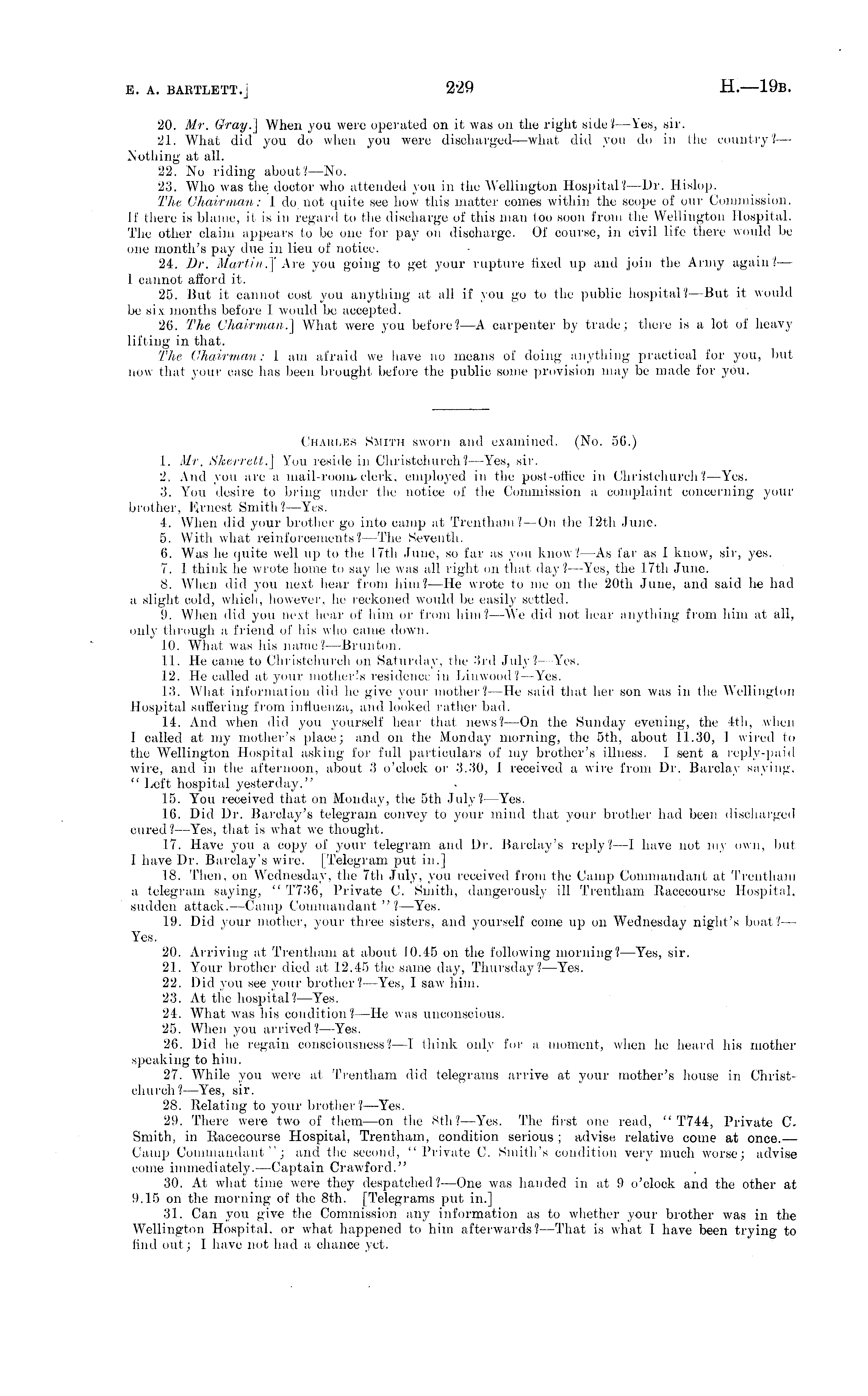 20. Mr. Gray.] When you were operated on it was on the right side? —Yes, sir. 21. What did you do when you were discharged—what did you do in Ihe country? — Nothing at all. 22. No riding about? —No. 23. Who was the doctor who attended you in the AVellington Hospital? —Dr. Hislop. The Chairman: I do not quite see how this matter comes within the scope of our Commission. If there is blame, it is in regard to the discharge of this man 100 soon from the Wellington Hospital. The other claim appears (o be one for pay on discharge. Of course, in civil life there would be one month's pay due in lieu of notice. 24. Dr. Mart'ln.]' Are you going to get your rupture fixed up and join the Army again?— 1 cannot afford it. 25. But it cannot cost you anything at all if you go to the public hospital?— But it would be six months before I would be accepted. 26. The Chairman.] What were you before? —A carpenter by trade; there is a lot of heavy lifting in that. The Chairman: 1 am afraid we have no means of doing anything practical for you, but now that your case has been brought before the public some provision may be made for you. Charles Smith sworn and examined. (No. 56.) 1. Mr, Skerrett.] You reside in Christchurch? —Yes, sir. 2. And you are a mail-room..clerk, employed in the post-office in Christchurch?—Yes. 3. You desire to bring under the notice of the Commission a, complaint concerning your brother, Ernest Smith? —Yes. 4. When did your brother go into camp at Trentham ! —On the 12th June. 5. With what reinforcements? —The Seventh. 6. Was he quite well up Io the 17th June, so far as you know? —As far as I know, sir, yes. 7. 1 think he wrote home to say he was all right on that day? —Yes, the 17th June. 8. When did you next hear from him? —He wrote to me on the 20th June, and said he had a slight cold, which, however, he reckoned would be easily settled. 9. When did you next hear of him or from him? —We did not heat anything from him at all. only through a friend of his who came down. fO. What, was his name? —Brunton. 1.1. He came to Christchurch on Saturday, ihe 3rd July? —Yes. 12. He called at your mother's residence in Linwood? —Yes. 13. What information did he give your mother? —He said that her son was in the Wellington Hospital suffering from influenza, and looked rather bad. 14. And when did you yourself hear that news?—On the Sunday evening, the -Ith, when I called at my mother's place; and on the Monday morning, the sth, about 11.30, 1 wired to the Wellington Hospital asking for full particulars of my brother's illness. I sent a reply-paid wire, and in the afternoon, about 3 o'clock or 3.30, 1 received a wire from Dr. Barclay saying. " Left hospital yesterday." 15. You received that on Monday, the sth July?— Yes. 16. Did Dr. Barclay's telegram convey to your mind that your brother had been discharged cured?— Yes, that is what we thought. 17. Have you a copy 7 of your telegram and Dr. Barclay's reply?—l have not my own, bul I have Dr. Barclay's wire. [Telegram put in.] 18. Then, on Wednesday, the 7th July, you received from the Camp Commandant at Trentham a telegram saying, " T736, Private C. Smith, dangerously ill Trentham Racecourse Hospital, sudden attack. —Camp Commandant"? —Yes. 19. Did your mother, your three sisters, and yourself come up on Wednesday night's boat?— Yes. 20. Arriving at Trentham at about 10.45 on the following morning?— Yes, sir. 21. Your brother died at 12.45 the same day 7 , Thursday?— Yes. 22. Did you see your brother?— Yes, I saw him. 23. At tlie hospital?— Yes. 24. What was his condition? —He was unconscious. 25. When you arrived?— Yes. 26. Did he regain consciousness?—l think only for a moment, when he heard his mother speaking to him. 27. AVhile you were at Trentham did telegrams arrive at your mother's house in Christchurch? —Yes, sir. 28. Relating to your brother? —Yes. 29. There were two of them—on the Bth?—Yes. The first one read, " T744, Private C. Smith, in Racecourse Hospital, Trentham, condition serious ; advise relative come at once.— Camp Commandant"; anil the second, "Private C. Smith's condition very much worse; advise come immediately.—Captain Crawford." 30. At what time were they despatched?— One was handed in at 9 o'clock and the other at 9.15 on the morning of the Bth. | Telegrams put in.] 31. Can you give the Commission any information as to whether your brother was in the Wellington Hospital, or what happened to him afterwards? —That is what 1 have been trying to find out; I have not had a chance yet.