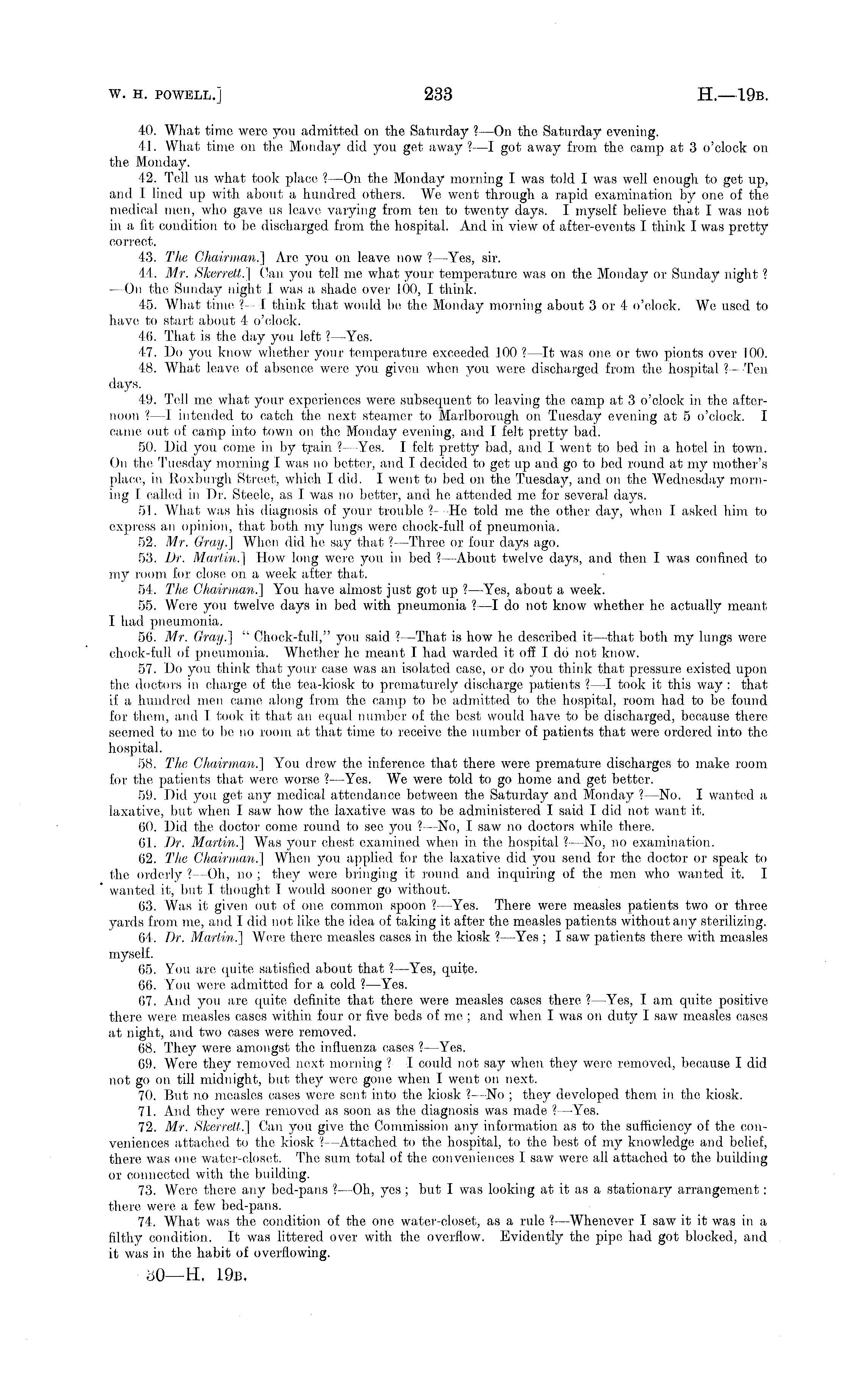 40. What time were you admitted on the Saturday ? —On the Saturday evening. 41. What time on the Monday did you get away ? —I got away from the camp at 3 o'clock on the Monday. 42. Tell us what took place ? —On the Monday morning I was told I was well enough to get up, and I lined up with about a hundred others. We went through a rapid examination by one of the medical men, who gave us leave varying from ten to twenty days. I myself believe that I was not in a fit condition to be discharged from the hospital. And in view of after-events I think I was pretty correct. 43. The Chairman.] Are you on leave now ? —Yes, sir. 14. Mr. Skerrett.] Can you tell me what your temperature was on the Monday or Sunday night ? —On the Sunday night I was a shade over 100, I think. 45. What time ? —I think that would be the Monday morning about 3or 4 o'clock. We used to have to start about 4 o'clock. 46. That is the day you left ?— Yes. 47. Do you know whether your temperature exceeded 100 ?—lt was one or two pionts over 100. 48. What leave of absence were you given when you were discharged from the hospital ?—Ten days. 49. Tell mo what your experiences were subsequent to leaving the camp at 3 o'clock in. the afternoon ? —I intended to catch the next steamer to Marlborough on Tuesday evening at 5 o'clock. I came out of camp into town on the Monday evening, and I felt pretty bad. 50. Did you come in by train ? —Yes. I felt pretty bad, and I went to bed in a hotel in town. On the Tuesday morning I was no better, and I decided to get up and go to bed round at my mother's place, in Roxburgh Street, which I did. I went to bed on the Tuesday, and on the Wednesday morning I called in Dr. Steele, as I was no better, and he attended me for several days. 51. What was his diagnosis of your trouble ?—He told me the other day, when I asked him to express an opinion, that both my lungs were chock-full of pneumonia. 52. Mr. Gray.] When did he say that ? —Three or four days ago. 53. Dr. Martin.] How long were you in bed ?—About twelve days, and then I was confined to my room for close on a week after that. 54. The Chairman.] You have almost just got up ?—Yes, about a week. 55. Were you twelve days in bed with pneumonia ?—I do not know whether he actually meant, I had pneumonia. 56. Mr. Gray.] " Chock-full," you said?— That is how he described it—that both my lungs were chock-full of pneumonia. Whether he meant I had warded it off Ido not know. 57. Do you think that your case was an isolated case, or do you think that pressure existed upon the doctors in charge of the tea-kiosk to prematurely discharge patients ? —I took it this way : that if a hundred men came along from the camp to be admitted to the hospital, room had to be found for them, and I took it that an equal number of the best would have to be discharged, because there seemed to me to be no room at that time to receive the number of patients that were ordered into the hospital. 58. The Chairman.] You drew the inference that there were premature discharges to make room for the patients that were worse ? —Yes. We were told to go home and get better. 59. Did you get any medical attendance between the Saturday and Monday ?—No. I wanted a laxative, but when I saw how the laxative was to be administered I said I did not want it. 60. Did the doctor come round to see you ? —No, I saw no doctors while there. 61. Dr. Martin.] Was your chest examined when in the hospital ?—No, no examination. 62. The Chairman.] AVhen you applied for the laxative did you send for the doctor or speak to the orderly ?—Oh, no ; they were bringing it round and inquiring of the men who wanted it. I wanted it, but I thought I would sooner go without. 63. Was it given out of one common spoon ? —Yes. There were measles patients two or three yards from me, and I did not like the idea of taking it after the measles patients without any sterilizing. 64. Dr. Martin.] Were there measles cases in the kiosk ? —Yes ; I saw patients there with measles myself. 65. You are quite satisfied about that ? —Yes, quite. 66. You were admitted for a cold ? —Yes. 67. And you are quite definite that there were measles cases there ? —Yes, I am quite positive there were measles cases within four or five beds of me ; and when I was on duty I saw measles cases at night, and two cases were removed. 68. They were amongst the influenza cases ?—Yes. 69. Were they removed next morning ? I could not say when they were removed, because I did not go on till midnight, but they were gone when I went on next. 70. But no measles cases were sent into the kiosk ? —No ; they developed them in the kiosk. 71. And they were removed as soon as the diagnosis was made ? —Yes. 72. Mr. Skerrett.] Can you give the Commission any information as to the sufficiency of the conveniences attached to the kiosk ? —Attached to the hospital, to the best of my knowledge and belief, there was one water-closet. The sum total of the conveniences I saw were all attached to the building or connected with the building. 73. Were there any bed-pans ? —Oh, yes ; but I was looking at it as a stationary arrangement: there were a few bed-pans. 74. What was the condition of the one water-closet, as a rule ?—Whenever I saw it it was in a filthy condition. It was littered over with the overflow. Evidently the pipe had got blocked, and it was in the habit of overflowing.