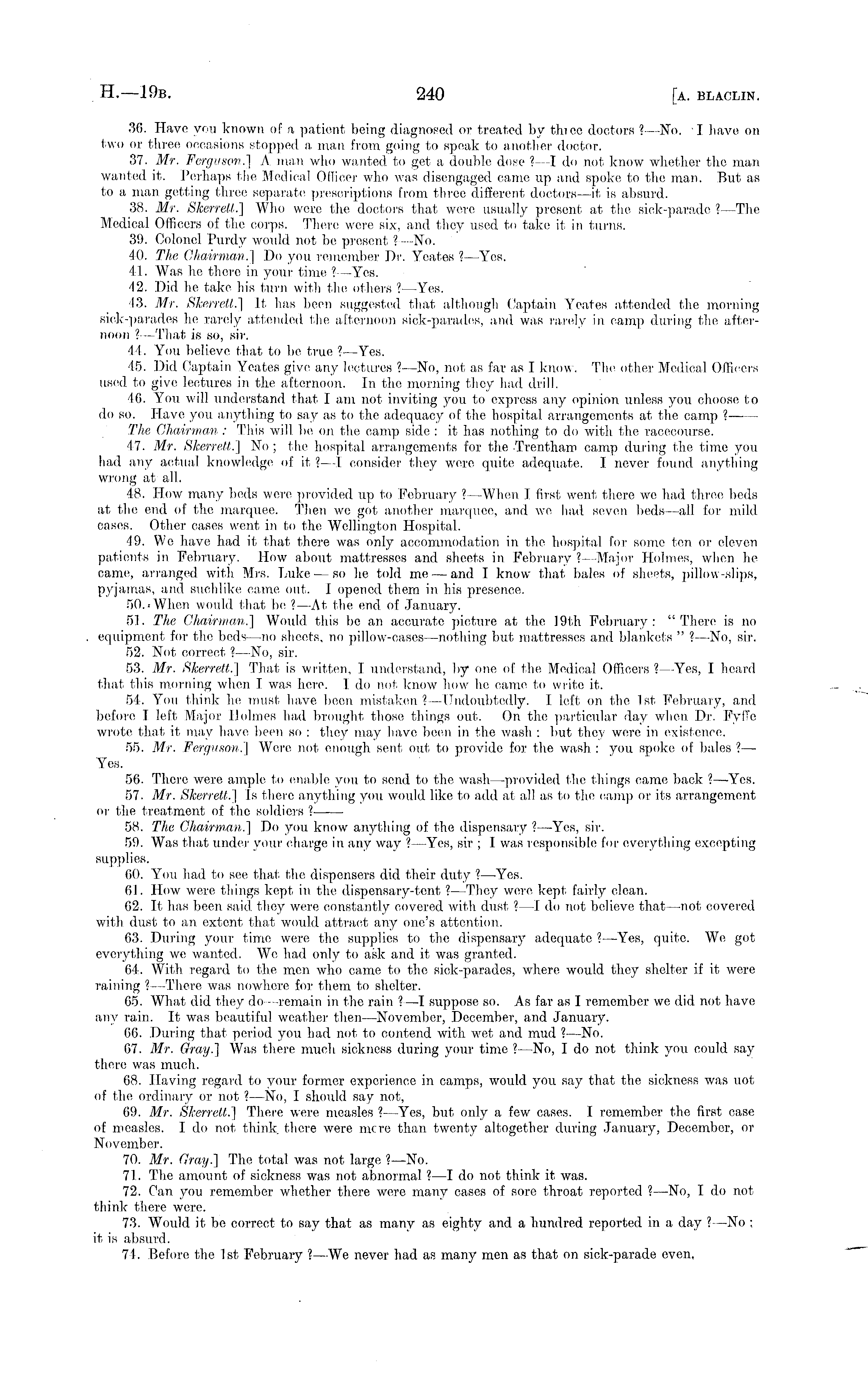 36. Have you known of a patient being diagnosed or treated by thice doctors ?—No. I have on two or three occasions stopped a man from going to speak to another doctor. 37. Mr. Ferguson.] A man who wanted to get a double dose ? —I do not know whether the man wanted it. Perhaps the Medical Officer who was disengaged came up and spoke to the man. But as to a man getting three separate prescriptions from three different doctors—it is absurd. 38. Mr. Skerrett.] Who were the doctors that were usually present at the, sick-parade ?—The Medical Officers of the corps. There were six, and they used to take it in turns, 39. Colonel Purdy would not be present ? -No. 40. The Chairman.] Do you remember Dr. Yeates ?—Yes. 41. Was he there in your time ? —Yes. 12. Did he take his turn with the others ? —Yes. 43. Mr. Skerrett.] It has been suggested that although Captain Yeates attended the morning sick-parades he rarely attended the afternoon sick-parades, and was rarely in camp during the afternoon ?—That is so, sir. 44. You believe that to be true ?—Yes. 45. Did Captain Yeates give any lectures ? —No, not as far as I know. The other Medical Officers used to give lectures in the afternoon. In the morning they had drill. 46. You will understand that I am not inviting you to express any opinion unless you choose to do so. Have you anything to say as to the adequacy of the hospital arrangements at the camp ? —— The Chairman : This will be on the camp side : it has nothing to do with the racecourse. 17. Mr. Skerrett.] No; the hospital arrangements for the Trentham camp during the time you had any actual knowledge of it ? —I consider they were quite adequate. I never found anything wrong at all. 48. How many beds were provided up to February ? —When I first went there w 7 O had three beds at the end of the marquee. Then we got another marquee, and we had seven beds—all for mild cases. Other cases went in to the Wellington Hospital. 19. We have had it that there was only accommodation in the hospital for some ten or eleven patients in February. How about mattresses and sheets in February ? —Major Holmes, when he came, arranged with Mrs. Luke — so he told me — and I know that bales of sheets, pillow-slips, pyjamas, and suchlike came out. I opened them in his presence. 50..When would that be ?—At the end of January. 51. The Chairman.] Would this be an accurate picture at the 19th February: "There is no equipment for the beds—no sheets, no pillow-cases—nothing but. mattresses and blankets " ?—No, sir. 52. Not correct ? —No, sir. 53. Mr. Skerrett.] That is written, I understand, by one of the Medical Officers ?—Yes, I hoard that this morning when I was here. Ido not, know how he came to write it. 54. You think he must have been, mistaken?— Undoubtedly. I left on the Ist February, and before I left Major Holmes had brought, those things out. On the particular day when Dr. Fyffe wrote that it may have been so : they may have been in the wash : but they were in existence. 55. Mr. Ferguson.] Were not, enough sent out to provide for the wash : you spoke of bales ? — Yes. 56. There were ample to enable you to send to the wash—provided the things came back ?—Yes. 57. Mr. Skerrett.] Is there anything you would like to add at. all as to the camp or its arrangement or the treatment of the soldiers ? 58. The Chairman.] Do you know anything of the dispensary ? —Yes, sir. 59. Was that under your charge in any way ?—Yes, sir ; I was responsible lot everything excepting supplies. 60. You had to see that the dispensers did their duty ?—Yes. 61. How were things kept in the dispensary-tent ? —They were kept fairly clean. 62. It has been said they were constantly covered with dust, ?—I do not believe that—not covered with dust to an extent that would attract any one's attention. 63. During your time were the supplies to the dispensary adequate ?—Yes, quite. We got everything we wanted. Wo had only to ask and it was granted. 64. With regard to the men who came to the sick-parades, where would they shelter if it were raining ? —There was nowhere for them to shelter. 65. What did they do —remain in the rain ?—I suppose so. As far as I remember we did not have any rain. It was beautiful weather then—November, December, and January. 66. During that period you had not to contend with wet and mud ? —No. 67. Mr. Gray.] AVas there much sickness during your time ? —No, I do not think you could saythere was much. 68. Having regard to your former experience in camps, would you say that the sickness was uot of the ordinary or not ?—No, I should say not, 69. Mr. Skerrett.] There were measles ? —Yes, but only a few cases. I remember the first case of measles. Ido not think, there were mere than twenty altogether during January, December, or November. 70. Mr. Gray.] The total was not, large ?—No. 71. The amount of sickness was not ahnormal ? —I do not think it was. 72. Can you remember whether there were many cases of sore throat reported ? —No, I do not think there were. 73. Would it be correct to say that as many as eighty and a hundred reported in a day ? —No ; it is absurd. 74. Before the Ist February ? —We never had as many men as that on sick-parade even,