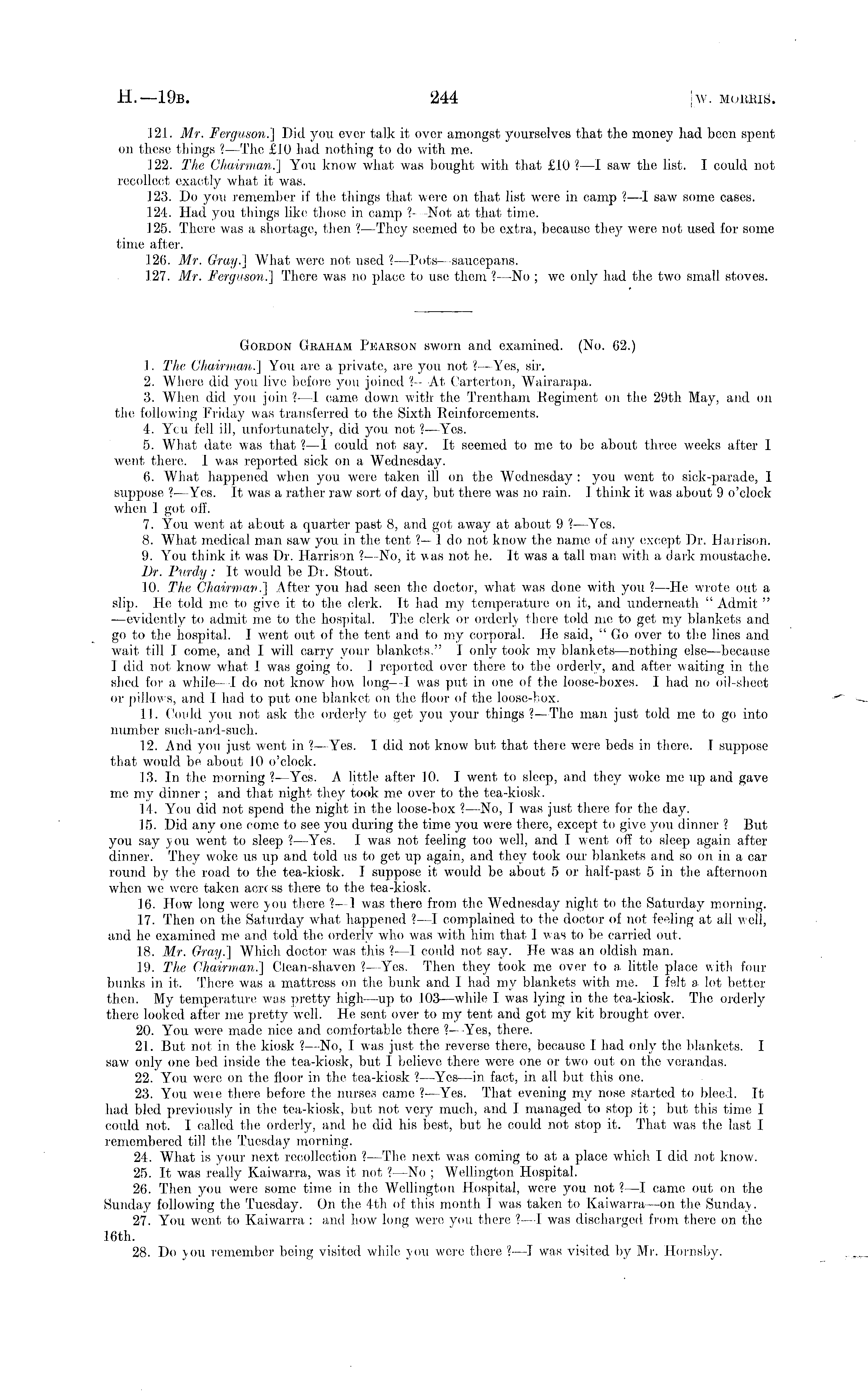 121. Mr. Ferguson.] Did you ever talk it over amongst yourselves that the money had been spent on these things ?—The £10 had nothing to do with me. 122. The Chairman!] You know what was bought with that £10 ?—I saw the list. I could not recollect exactly what it was. 123. Do you remember if the things that were on that list wore in camp ?—I saw some cases. 124. Had you things like those in camp I—Not1 —Not at that time. 125. There was a shortage, then ? —They seemed to be extra, because they were not used for some time after. 126. Mr. Gray.] What were not used ? —Pots- saucepans. 127. Mr. Ferguson.] There was no place to use them ?—No ; we only had the two small stoves. Gordon Graham: Pearson sworn and examined. (No. 62.) 1. The Chairman.] You are a private, are you not ? —Yes, sir. 2. Where did you live before you joined ? —At Carterton, Wairarapa. 3. When did you join ?—I came down with the Trentham Regiment on the 29th May, and on the following Friday was transferred to the Sixth Reinforcements. 4. Yeu fell ill, unfortunately, did you not . —Yes. 5. What date was that ? —I could not say. It seemed to me to be about three weeks after I went there. I was reported sick on a Wednesday. 6. What happened when you were taken ill on the Wednesday : you went to sick-parade, I suppose ? —Yes. It was a rather raw sort of day, but there was no rain. I think it was about 9 o'clock when I got off. 7. You went at about a quarter past 8, and got away at about 9 ? —Yes. 8. What medical man saw you in the tent ?— 1 do not know the name of any except Dr. Harrison. 9. You think it was Dr. Harrison ?—No, it was not he. It was a tall man with a dark moustache. Dr. Purely : It would be Dr. Stout. 10. The Chairman.] After you had seen the doctor, what was done with you ?—He wrote out a slip. He told me to give it to the clerk. It had my temperature on it, and underneath " Admit " —evidently to admit me to the hospital. The clerk or orderly there told me to get my blankets and go to the hospital. I went out of the tent and to my corporal. He said, "Go over to the lines and wait till I come, and I will carry your blankets." I only took my blankets —nothing else—because I did not know what I was going to. I reported over there to the orderly 7, and after waiting in the shed for a while —I do not know how long—l was put in one of the loose-boxes. I had no oil-sheet or pillows, and I had to put one blanket on the floor of the loose-box. 11. Coidd you not ask the orderly to get you your things ?—The man just told me to go into number such-and-such. 12. And you just went in '.—Yes. I did not know but that there were beds in there. I suppose that would be about 10 o'clock. 18. In the morning ? —Yes. A little after 10. I went to sleep, and they woke me up and gave me my dinner ; and that night they took me over to the tea-kiosk. 14. You did not spend the night in the loose-box ?—No, I was just there for the day. 15. Did any one come to see you during the time you were there, except to give you dinner ? But you say you went to sleep ? —Yes. I was not feeling too well, and I went off to sleep again after dinner. They woke us up and told us to get up again, and they took our blankets and so on in a car round by the road to the tea-kiosk. I suppose it would be about 5 or half-past 5 in the afternoon when we were taken aortss there to the tea-kiosk. 16. How long were you there ?—I was there from the Wednesday night to the Saturday morning. 17. Then on the Saturday what happened ?—I complained to the doctor of not feeling at all well, and he examined me and told the orderly who was with him that I was to be carried out. 18. Mr. Gray.] Which doctor was this ? —I could not say. He was an oldish man. 19. The Chairman.] Clean-shaven ? —Yes. Then they took me over to a. little place with four bunks in it. There was a mattress on the bunk and I had my blankets with me. I felt a lot better then. My temperature was pretty high—up to 103—while I was lying in the tea-kiosk. The orderly there looked after me pretty well. He sent over to my tent, and got my kit brought over. 20. You were made nice and comfortable there ? —Yes, there. 21. But not in the kiosk ? —No, I was just the reverse there, because I had only the blankets. I saw only one bed inside the tea-kiosk, but I believe there were one or two out, on the verandas. 22. You were on the floor in the tea-kiosk .—Yes —in fact, in all but this one. 23. You weie there before the nurses came . —Yes. That evening my nose started to bleed. It had bled previously in the tea-kiosk, but not very much, and I managed to stop it; but this time I could not. I called the orderly, and he did his best, but he could not stop it. That was the last I remembered till the Tuesday morning. 24. What is your next recollection ? —The next was coming to at a place which. I did not know. 25. It was really Kaiwarra, was it, not ?—No ; Wellington Hospital. 26. Then you were some time in the Wellington Hospital, were you not ? —I came out on the Sunday following the Tuesday. On the 4th of this month I was taken to Kaiwarra—on the Sunday. 27. You went to Kaiwarra : and how long were you there ?—I was discharged, from there on the 16th. 28. Do you remember being visited while you were there ?—I was visited by Mr. Hornsby,