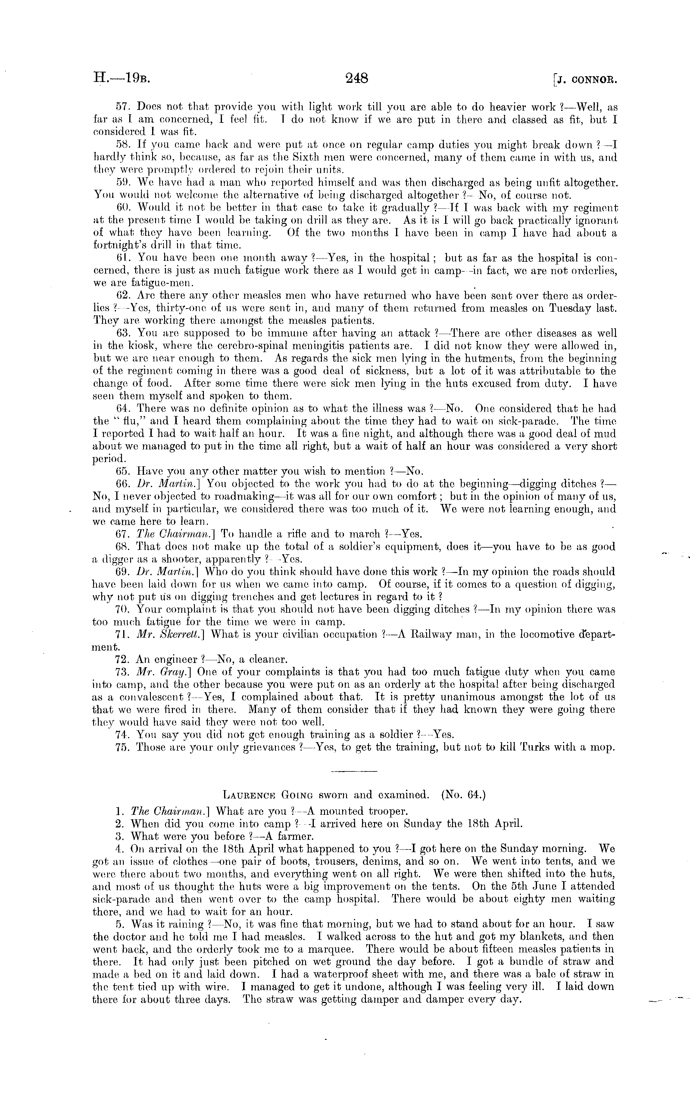 57. Does not that provide you with light work till you are able to do heavier work ?—Well, as far as lam concerned, I feel fit. Ido not know if we are put in there and classed as fit, but I considered I was fit. 58. If you came, back and were put at once on regular camp duties you might break down ? —I hardly think so, because, as far as the Sixth men were concerned, many of them came in with, us, and they were promptly ordered to rejoin their units. 59. We have had a man who reported himself and was then discharged as being unfit altogether. You would not welcome the alternative of being discharged altogether ?—No, of course not. 60. Would it not be better in that case to take it gradually . —lf I was back with my regiment at the present time I would be taking on drill as they are. As it is I will go back practically ignorant of what they have'been learning. Of the two months I have been in camp I have had about a fortnight's drill in that time. 61. You have been one month away ?—Yes, in the hospital ; but as far as the hospital is concerned, there is just as much fatigue work there as I would get in camp—in fact, we are not orderlies, we are fatigue-men. 62. Arc there any other measles men who have returned who have been sent over there as orderlies ? —Yes, thirty-one of us were sent in, and many of them returned from measles on Tuesday last. They are working there amongst the measles patients. 63. You are supposed to be immune after having an attack ?—There are other diseases as well in the kiosk, where the cerebro-spinal meningitis patients are. I did not know they were allowed in, but we are near enough to thorn. As regards the sick men lying in the hutments, from the beginning of the regiment coming in there was a good deal of sickness, but a lot of it was attributable to the change of food. After some time there were sick men lying in the huts excused from duty. I have seen them myself and spoken to them. 64. There was no definite opinion as to what the illness was ?—No. One considered that he had the " flu," and I heard them complaining about the time they had to wait on sick-parade. The time I reported I had to wait half an. hour. It was a fine night, and although there was a good deal of mud about we managed to put in the time all right, but a wait of half an hour was considered a very short period. 65. Have you any other matter you wish to mention ?—No. 66. Dr. Martin.] You objected to the, work you had to do at the beginning—digging ditches ? — No, I never objected to roadmaking—it was all for our own comfort; but in the opinion of many of us, and myself in particular, we considered there was too much of it. We were not learning enough, and we came here to learn. 67. The Chairman.] To handle a rifle and to march . —Yes. 68. That does not make up the total of a soldier's equipment, does it—you have to be as good a digger as a shooter, apparently ?—Yes. 69. Dr. Martin.] Who do you think should have done this work ? —ln my opinion the roads should have been laid down for us when we came into camp. Of course, if it comes to a question of digging, why not put lis on digging trenches and get lectures in regard to it ? 70. Your complaint is that you should not have been digging ditches ?—ln my opinion there was too much fatigue for the time we were in camp. 71. Mr. Skerrett.] What is your civilian occupation ? —A Railway man, in the locomotive department. 72. An engineer ? —No, a cleaner. 73. Mr. Gray.] One of your complaints is that you had too much fatigue duty when you came into camp, and the other because you were put on as an orderly at tho hospital after being discharged as a convalescent . —Yes, I complained about that. It is pretty unanimous amongst the lot of us that we were fired in there. Many of them consider that if they had known they were going there they would have said they were not too well. 74. You say you did not get enough training as a soldier ?—Yes. 75. Those are your only grievances ?—Yes, to get the training, but not to kill Turks with a mop. Laurence Going sworn and examined. (No. 64.) 1. The Chairman.] What are you ?—A mounted trooper. 2. When did you come into camp '.- -I arrived here on Sunday the I.Bth April. 3. What were you before ? —A farmer. 4. On arrival on the 18th April what happened to you . —I got here on the Sunday morning. We got an issue of clothes—one pair of boots, trousers, denims, and so on. We went into tents, and we were there about two months, and everything went on all right. We were then shifted into the huts, and most of us thought the huts were a big improvement on the tents. On the sth June I attended sick-parade and then went over to the camp hospital. There would be about eighty men waiting there, and we had to wait for an hour. 5. Was it raining . —No, it was fine that morning, but we had to stand about for an hour. I saw the doctor and he told me I had measles. I walked across to the hut and got my blankets, and then went back, and the orderly took me to a marquee. There would be about fifteen measles patients in there. It had only just been pitched on wet ground the day before. I got a bundle of straw and made, a bed on it and laid down. I had a waterproof sheet with me, and there was a bale of straw in the tent tied up with wire. I managed to get it undone, although I was feeling very ill. I laid down there for about three days. The straw was getting damper and damper every day.