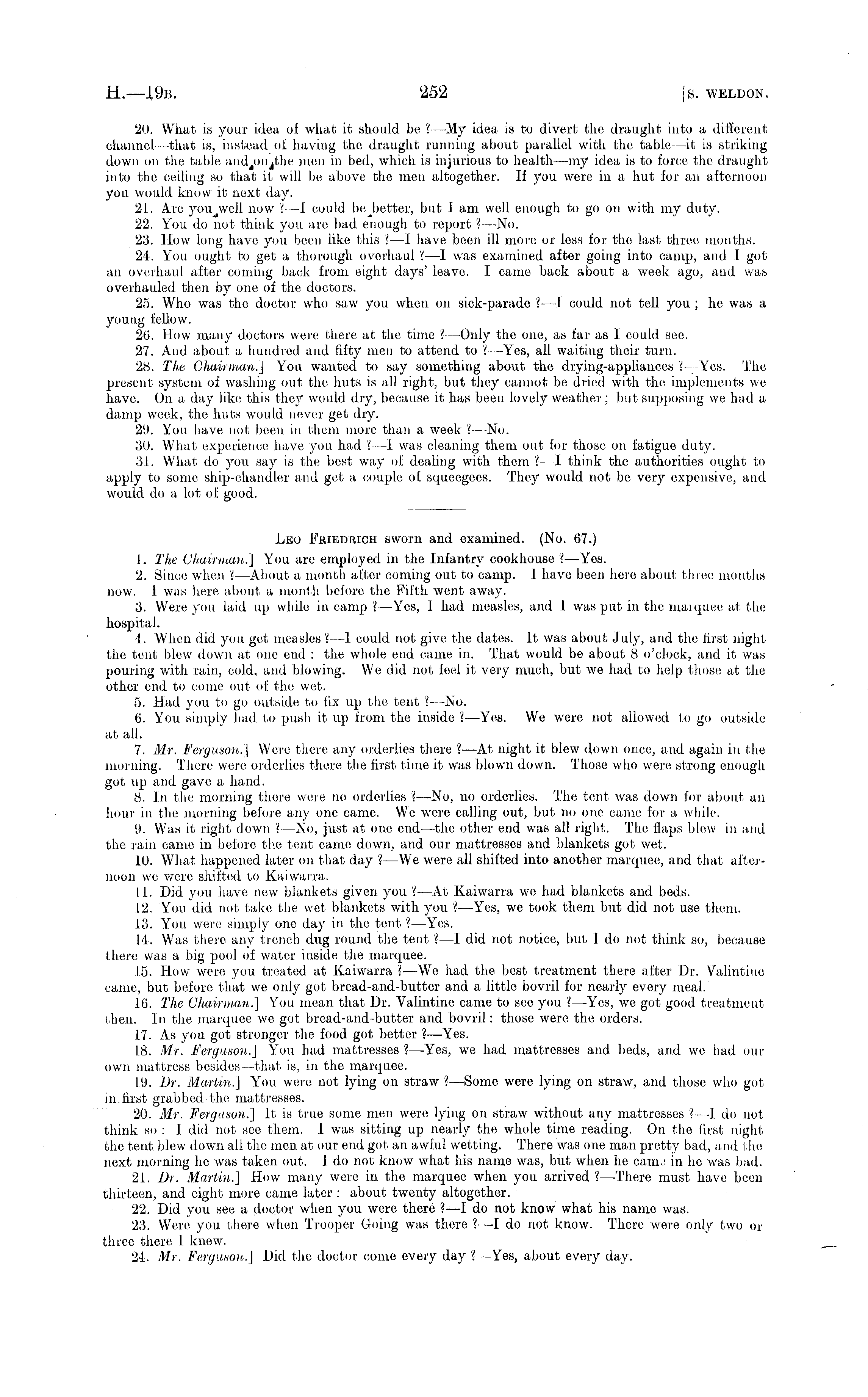 20. What is your idea of what it should be ? —My idea is to divert the draught into a different channel —that is, instead of having the draught running about parallel with the table—it is striking down on the table and.onjthe men in bed, which is injurious to health —my idea is to force the draught into the ceiling so that it will be above the men altogether. If you were in a hut for an afternoon you would know it next day. 21. Are now ?—I could bejbetter, but I am well enough to go on with my duty. 22. You do not think you are bad enough to report . —No. 23. How long have you been like this . —I have been ill more or less for the last three months. 24. You ought to get a thorough overhaul ? —I was examined after going into camp, and I got an overhaul after coming back from eight days' leave. I came back about a week ago, and was overhauled then by one of the doctors. 25. Who was the doctor who saw you when on sick-parade ? —I could not tell you ;he was a young fellow. 26. How many doctors were there at the time ? —Only the one, as far as I could see. 27. And about a hundred and fifty men to attend to ? -Yes, all waiting their turn. 28. Tlie Chairman.] You wanted to say something about the drying-appliances ?—Yes. The present system of washing out the huts is all right, but they cannot be dried with the implements we have. On a day like this they would dry, because it has been lovely weather ; but supposing we had a damp week, the huts would never get dry. 29. You have not been in them more than a week ? —No. 30. What experience have you had ?—I was cleaning them out for those on fatigue duty. 31. What do you say is the best way of dealing with them ?- ■—I think the authorities ought to apply to some ship-chandler and get a couple of squeegees. They would not be very expensive, and would do a lot of good. Leo Friedrich sworn and examined. (No. 67.) 1. The Chairman.] You are employed in the Infantry cookhouse 'I —Yes. 2. Since when .—About a month after coming out to camp. 1 havo been here about three months now. 1 was here about a month before the Fifth went away. 3. Were you laid up while in camp { —Yes, I had measles, and 1 was put in the marquee at the hospital. 4. When did you get measles I—l1 —I could not give the dates. It was about July, and the first night the tent blew 7 down at one end : the whole end came in. That would be about 8 o'clock, and it was pouring with rain, cold, and blowing. We did not feel it very much, but we had to help those at the other end to come out of the wet. 5. Had you to go outside to fix up the tent ?—No. 6. You simply had to push it up from the inside '.—Yes. We were not allowed to go outside at all. 7. Mr. Ferguson.] Were there any orderlies there ? —At night it blew down once, and again in the morning. There were orderlies there the first time it was blown down. Those who wore strong enough got up and gave a hand. 8. In the morning there were no orderlies . —No, no orderlies. The tent was down for about an hour in the morning before any one came. We were calling out, but no one came for a while. 9. Was it right down ? —No, just at one end —the other end was all right. The flaps blew in and the rain came in before the tent came down, and our mattresses and blankets got wet. 10. What, happened later on that day ?—We were all shifted into another marquee, and that afternoon we were shifted to Kaiwarra. 11. Did you have new blankets given y 7 ou ? —At Kaiwarra we had blankets and beds. 12. You did not take the wet blankets with you ? —Yes, we took them but did not use them. 13. You were simply one day in the tent . —Yes. 14. Was there any trench dug round the tent \ —l did not notice, but Ido not think so, because there was a big pool of water inside the marquee. 15. How were you treated at Kaiwarra % —We had the best treatment there after Dr. Valintine came, but before that we only got bread-and-butter and a little bovril for nearly every meal. 16. The Chairman!] You mean that Dr. Valintine came to see you . —Yes, we got good treatment then. In the marquee we got bread-and-butter and bovril: those were the orders. 17. As you got stronger the food got better ?—Yes. 18. Mr. Ferguson.] You had mattresses . —Yes, wo had mattresses and beds, and we had our own mattress besides—that is, in the marquee. 19. Dr. Martin.] You were not lying on straw ? —Some were lying on straw, and those who got in.first grabbed the mattresses. 20. Mr. Ferguson.] It is true some men were lying on straw without any mattresses . —I do not think so : I did not see them. 1 was sitting up nearly the whole time reading. On the first night the tent blew down all tho men at our end got an awful wetting. There was one man pretty bad, and tlie next morning he was taken out. Ido not know what his name was, but when ho canu in he was bad. 21. Dr. Martin.] How many were in the marquee when you arrived ? —There must have been thirteen, and eight more came later : about twenty altogether. 22. Did you see a doctor when you were there ?—I do not know what his name was. 23. Were you there when Trooper Going was there ?—I do not know. There were only two or three there 1 knew. 24. Mr. Ferguson.] Did the doctor come every day ?—-Yes, about every day.