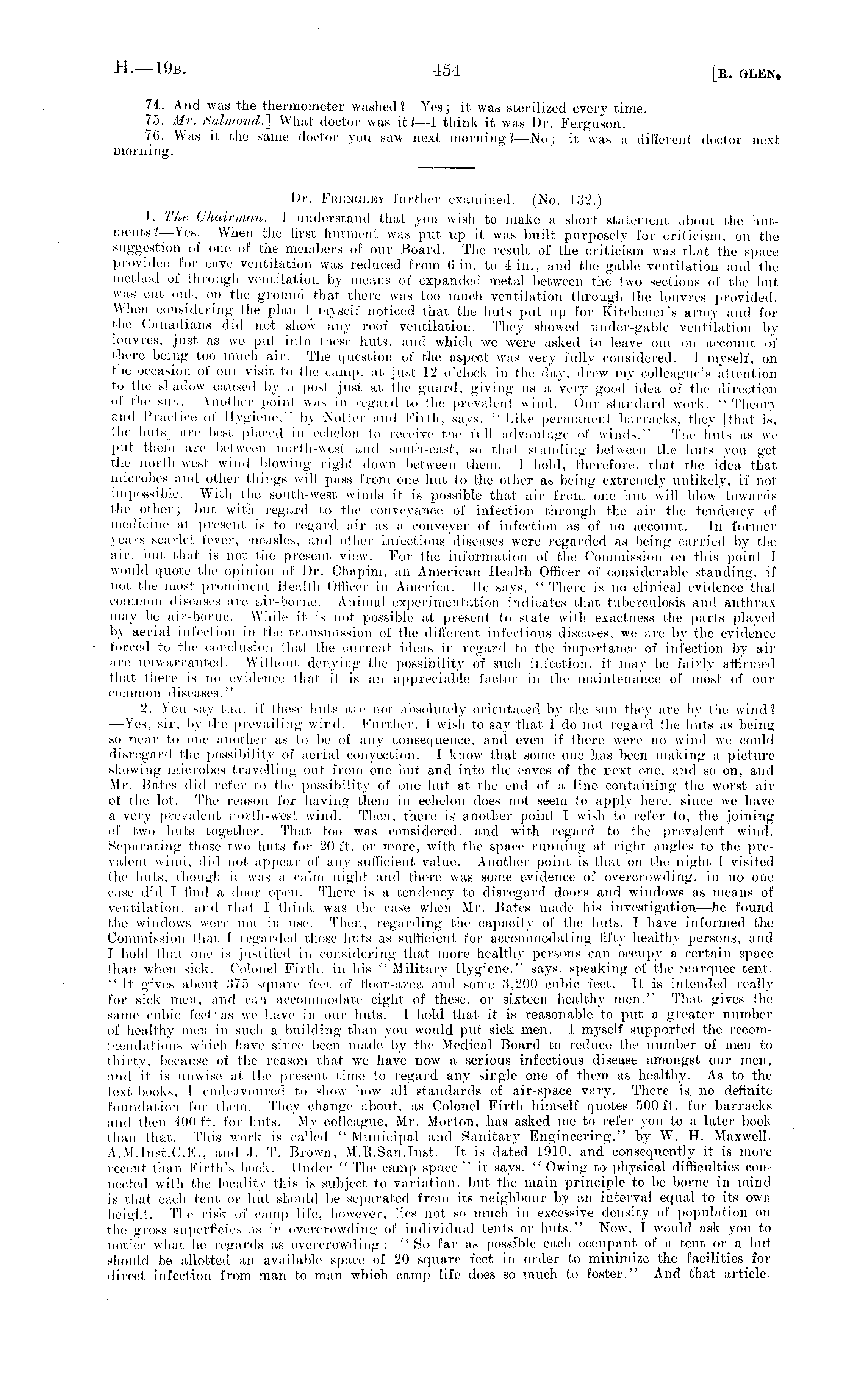 74. And was the thermometer washed?— Yes; it was sterilized every time. 75. Mr. Salmond] AVhat. doctor was it? —I think it was Dr. Ferguson. 76. AVas it the same doctor you saw next morning?—No; it was a different doctor next morning. Dr. Fbenglisy further examined. (No. 132.) I. The Chair-man.] I understand that you wish to make a short, statement about the hutments?— Yes. When the first hutment was put rrp it was built purposely for criticism, on the suggestion of one of the members of om- Board. The result of the criticism was that the space provided for cave ventilation was reduced from 6 in. to 4 irr., and the gable ventilation and the method of through ventilation by means of expanded metal between the two sections of the hut was cut out, on the ground that there was too much ventilation through the louvres provided. When considering the plan I myself noticed that the huts put up for Kitchener's army ami fertile Canadians did not show any roof ventilation. They showed under-gable ventilation bylouvres, just as we put into these huts, and which we were asked to leave out on account of there being too much air. The question of the aspect was very fully considered. I myself, on the occasion of out visit to the camp, at just 12 o'clock in the day, drew my colleagues attention to the shadow caused by a post, just, at, the guard, giving rrs a very good idea of the direction of the sun. Another point was in regard to (he prevalent wind. Our standard work, "' Theory and Practice of Hygiene," by Nutter and Firth, says. " Like permanent barracks, they [that is. the huts] are best, placed in echelon to receive the full advantage of winds." The huts as we put them are between north-west and south-east, so that standing between the huts yorr get the north-west wind blowing right down between them. I hold, therefore, that the idea that microbes and other things will pass from one hut to the other as being extremely unlikely, if not impossible. With the south-west winds it is possible that, air from one hut: will blow towards tlie other; but with regard to the conveyance of infection through the air the tendency of medicine at present is to regard air as a conveyer of infection as of no account. In former years scar-let; fever-, measles, and other infectious diseases were regarded as being carried by the air, but, that is not the present view. For the information of the Commission on this point 1 would quote the opinion of Dr. Chapim, an American Health Officer of considerable standing., if not the most prominent Health Officer in America. He says, "There is no clinical evidence that common diseases are air-borne. Animal experimentation indicates that tuberculosis and anthrax may be air-borne. While it is not, possible at present to state with exactness the parts played by aerial infection in the transmission of the different infectious diseases, we are by the evidence forced to the conclusion that the current ideas in regard to the importance of infection by air are unwarranted. Without denying the possibility of such infection, it may be fairly affirmed that there is no evidence that it is an appreciable factor in the maintenance of most of our common diseases." 2. You say that, if these huts are not absolutely orientated by the sun they- are by the wind? —A'es, sir, by the prevailing wind. Further, I wish to say that Ido not regard the bids as being so near to one another as to be of any consequence, and even if there were no wind we could disregard the possibility of aerial convection. I know that some one has been making a picture showing microbes travelling out from one hut and into the eaves of the next one, and so on, and Mr. Bates did refer to the possibility of one hut, at the end of a lino containing the worst air of the lot. The reason for having them in echelon does not seem to apply here, since we have a very prevalent north-west wind. Then, there is another point, I wish to refer to, the joining of two huts together. That, too was considered, and with regard to the prevalent, wind. Separating those two huts for 20ft. or more, with the space running at right angles to the prevalenl wind, did not appear of any sufficient value. Another point is that on the night I visited the huts, though it was a calm night and there was some evidence of overcrowding, in no one case did I find a door open. There is a tendency 7to disregard doors arrd windows as means of ventilation, and thai I think, was Ihe ease when Mr. Bates made his investigation—he found the windows were not in use. Then, regarding the capacity 7of the huts, 1 have informed the Commission that I regarded those huts as sufficient for accommodating fifty healthy persons, and I hold that one is justified in considering that more healthy persons can occupy 7 a certain space than when sick. Colonel Firth, in his " Military Hygiene," says, speaking of the marquee tent, "It gives about 375 square feet of floor-area and some 3,200 cubic feet. It is intended really for sick men, and can accommodate eight of these, or sixteen healthy men." That gives the same cubic feet* as we have in our huts. I hold that it is reasonable to put a greater number of healthy men in such a building than you would put sick men. I myself supported the recommendations which have since been made by the Medical Board to reduce the number of men to thirty, because of the reason that we have now a serious infectious disease amongst our men, and it is unwise at, tlie present, time to regard any single one of them as healthy. As to the text-books, I endeavoured to show how all standards of air-space vary. There is no definite foundation for them. They change about, as Colonel Firth himself quotes 500 ft. for bar-racks and then 400 ft. for huts. My colleague, Mr. Morton, has asked me to refer you to a later book than that. This work is called " Municipal and Sanitary Engineering," by AY. H. Maxwell, A.M.Inst.C.E., and J. T. Brown, M.R.San.lnst. It is dat