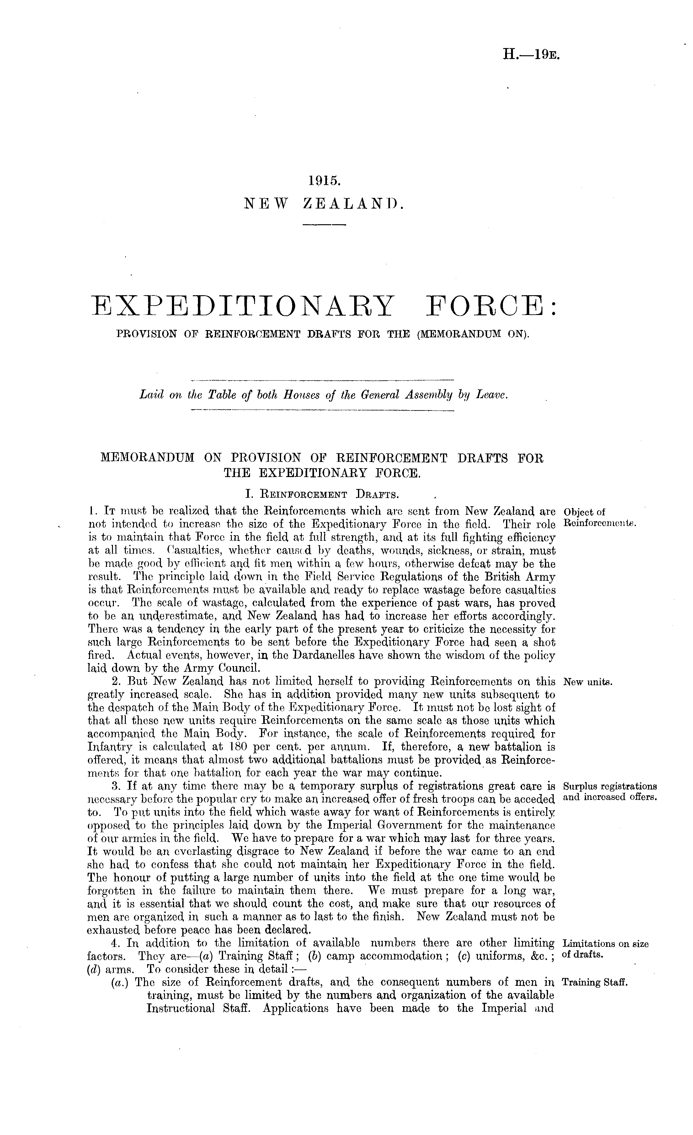 MEMORANDUM ON PROVISION OF REINFORCEMENT DRAFTS FOR THE EXPEDITIONARY FORCE. I. Reinforcement Drafts. 1. It must be realized that the Reinforcements which are sent from New Zealand are not intended to increase the size of the Expeditionary Force in the field- Their role is to maintain that Force in the field at full strength, and at its full fighting efficiency at all times. Casualties, whether caused by deaths, wounds, sickness, or strain, must be made good by efficient and fit men within a few hours, otherwise defeat may be the result. The principle laid down in the Field Service Regulations of the British Army is that Reinforcements must be available and ready to replace wastage before casualties occur. The scale of wastage, calculated from the experience of past wars, has proved to be an underestimate, and New Zealand has had to increase her efforts accordingly. There was a tendency in the early part of the present year to criticize the necessity for such large Reinforcements to be sent before the Expeditionary Force had seen a shot fired. Actual events, however, in the Dardanelles have shown the wisdom of the policy laid down by the Army Council. 2. But New Zealand has not limited herself to providing Reinforcements on this greatly increased scale. She has in addition provided many new units subsequent to the despatch of the Main Body of the Expeditionary Force. It must not bo lost sight of that all these new units require Reinforcements on the same scale as those units which accompanied the Main Body. For instance, the scale of Reinforcements required for Infantry is calculated at 180 per cent, per annum. If, therefore, a now 1 battalion is offered, it means that almost two additional battalions must be provided as Reinforcements for that one battalion for each year the war may continue. 3. If at any time there may be a temporary surplus of registrations great care is necessary before the popular cry to make an increased offer of fresh troops can be acceded to. To put units into the field which waste away for want of Reinforcements is entirely opposed to the principles laid down by the Imperial Government for the maintenance of our armies in the field. We have to prepare for a war which may last for three years. It Would be an everlasting disgrace to New Zealand if before the war came to an end she had to confess that she could not maintain her Expeditionary Force in the fieldThe honour of putting a large number of units into the field at the one time would be forgotten in the failure to maintain them there. We must prepare for a long war, and it is essential that we should, count the cost, and make sure that our resources of men are organized in such a manner as to last to the finish. New Zealand must not be exhausted before peace has boon declared. 4. In addition to the limitation of available numbers there are other limiting factors. They are — (a) Training Staff; (b) camp accommodation ; (c) uniforms, &c.; (d) arms. To consider these in detail: — (a.) The size of Reinforcement drafts, and the consequent numbers of men in training, must bo limited by the numbers and organization of the available Instructional Staff. Applications have been made to the Imperial iuid