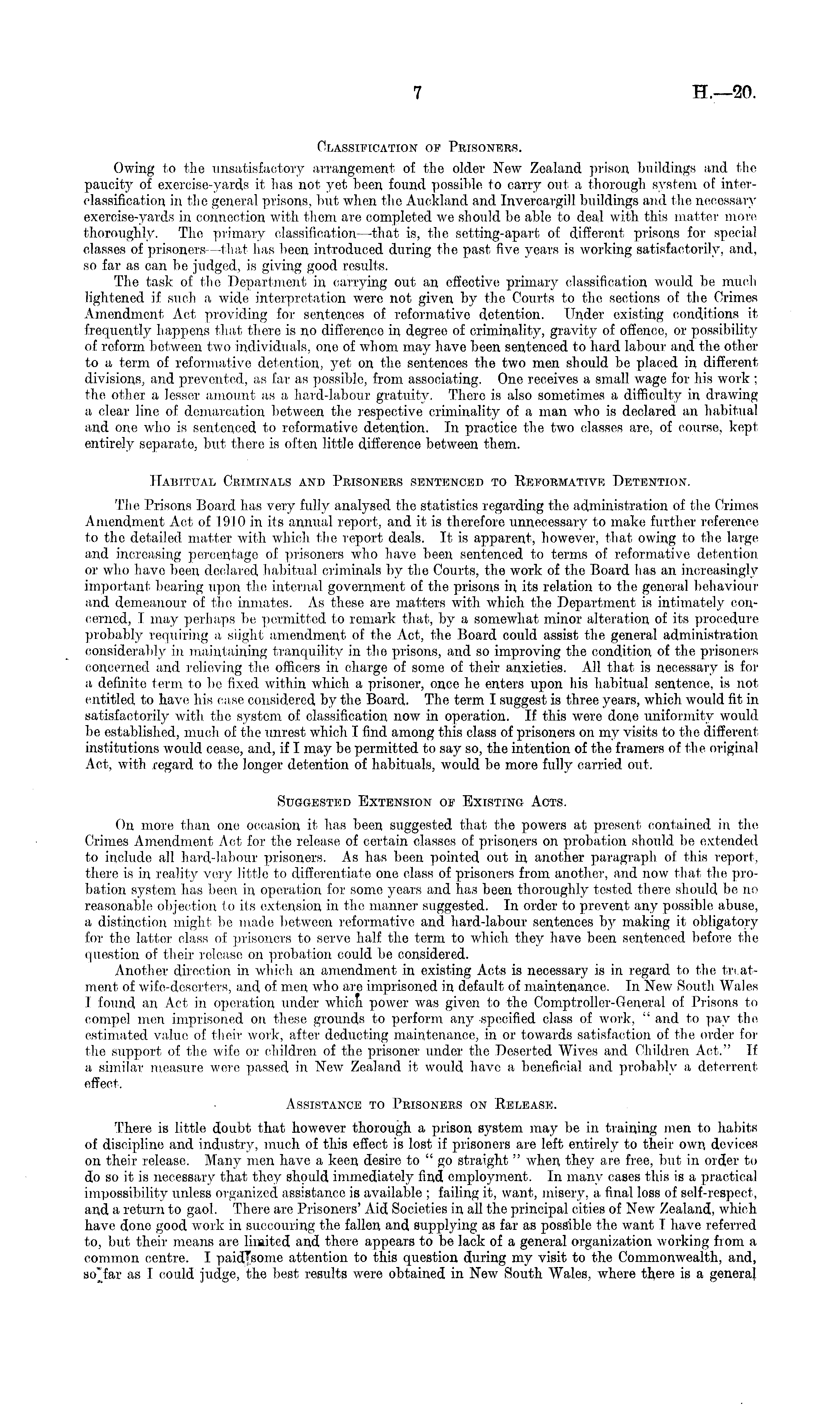 Classification op Prisoners. Owing to the unsatisfactory arrangement of the older New Zealand prison buildings and the paucity of exercise-yards it has not yet been found possible to carry out a thorough system of interclassification in the general prisons, but when the Auckland and Invercargill buildings and the necessary exercise-yards in connection with them are completed we should be able to deal with this matter more thoroughly. The primary classification —that is, the setting-apart of different prisons for special classes of prisoners—that has been introduced during the past five years is working satisfactorily, and, so far as can be judged, is giving good results. The task of the Department in carrying out an effective primary classification would be much lightened if such a wide interpretation were not given by the Courts to the sections of the Crimes Amendment Act providing for sentences of reformative detention. Under existing conditions it frequently happens that there is no difference in degree of criminality, gravity of offence, or possibility of reform between two individuals, one of whom may have been sentenced to hard labour and the other to a term of reformative detention, yet on the sentences the two men should be placed in different divisions, and prevented, as far as possible, from associating. One receives a small wage for his work ; the other a lesser amount as a hard-labour gratuity. There is also sometimes a difficulty in drawing a clear line of demarcation between the respective criminality of a man who is declared an habitual and one who is sentenced to reformative detention. Tn practice the two classes are, of course, kept entirely separate, but there is often little difference between them. Habitual Criminals and Prisoners sentenced to Reformative Detention. The Prisons Board has very fully analysed the statistics regarding the administration of the Crimes Amendment Act of 1910 in its annual report, and it is therefore unnecessary to make further reference to the detailed matter with which the report deals. It is apparent, however, that owing to the large and increasing percentage of prisoners who have been sentenced to terms of reformative detention or who have been declared habitual criminals by the Courts, the work of the Board has an increasingly important bearing upon the internal, government of the prisons in its relation to the general behaviour and demeanour of the inmates. As these are matters with, which the Department is intimately concerned, I may perhaps be permitted to remark that, by a somewhat minor alteration of its procedure probably requiring a slight amendment of the Act, the Board could assist the general administration considerably in maintaining tranquility in the prisons, and so improving the condition of the prisoners concerned and relieving the officers in charge of some of their anxieties. All that is necessary is for a definite term to be fixed within which a prisoner, once he enters upon his habitual sentence, is not entitled to have his case considered by the Board. The term I suggest is three years, which would fit in satisfactorily with, the system of classification now in operation. If this were done uniformity would be established, much of the unrest which I find among this class of prisoners on my visits to the different institutions would cease, and, if I may be permitted to say so, the intention of the franters of the original Act, with regard to the longer detention of habituals, would be more fully carried out. Suggested Extension of Existing Acts. On more than one occasion it has been suggested that the powers at present contained in the Crimes Amendment Act for the release of certain classes of prisoners on probation should be extended to include all hard-labour prisoners. As has been pointed out in another paragraph of this report, there is in reality very little to differentiate one class of prisoners from another, and now that the probation system has been in operation for some years and has been thoroughly tested there should be no reasonable objection to its extension in the manner suggested. In order to prevent any possible abuse, a distinction might be made between reformative and hard-labour sentences by making it obligatory for the latter class of prisoners to serve half the term to which they have been sentenced before the question of their release on probation could be considered. Another direction in which an amendment in existing Acts is necessary is in regard to the treatment of wife-deserters, and of men who are imprisoned in default of maintenance. In New South Wales I found an Act in operation under which power was given to the Comptroller-General of Prisons to compel men imprisoned on these grounds to perform any specified class of work, " and to pay the estimated value of their work, after deducting maintenance, in or towards satisfaction of the order for the support of the wife or children of the prisoner under the Deserted Wives and Children Act." If a similar measure were passed in New Zealand it would have a beneficial and probably a deterrent effect. Assistance to Prisoners on Release. There is little doubt that however thorough a prison system may be in training men to habits of discipline and industry, much of this effect is lost if prisoners are left entirely to their own, devices on their release. Many men have a keen desire to "go straight " when they are free, but in order to do so it is necessary that they should immediately find employment. In many cases this is a practical impossibility unless organized assistance is available ; failing it, want, misery, a final loss of self-respect, and a return to gaol. There are Prisoners' Aid Societies in all the principal cities of New Zealand, which have done good work in succouring the fallen and supplying as far as possible the want 1 have referred to, but their means are limited and there appears to be lack of a general organization working 