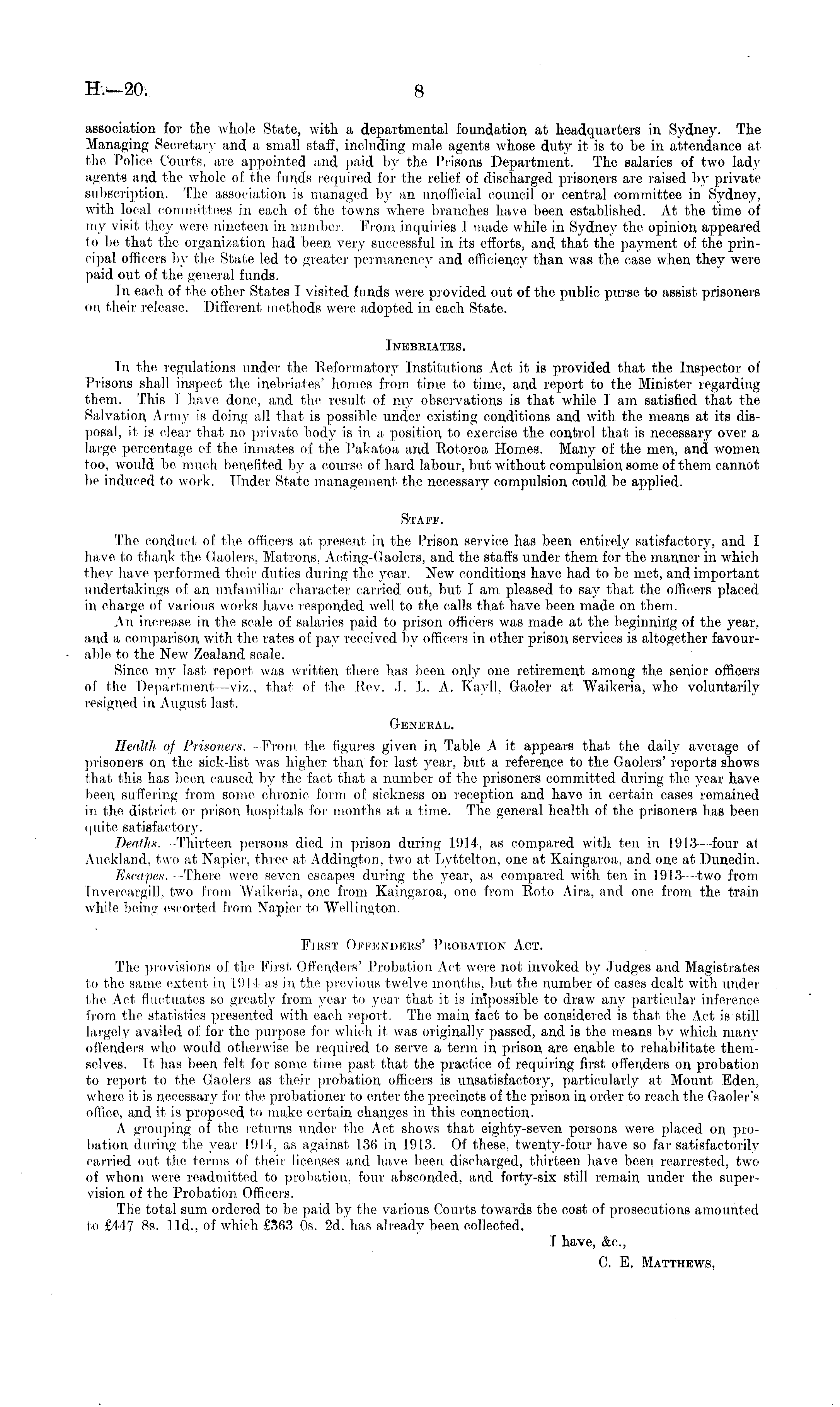 association for the whole State, with a departmental foundation at headquarters in Sydney. The Managing Secretary and a small staff, including male agents whose duty it is to be in attendance at the Police Courts, are appointed and paid by the Prisons Department. The salaries of two lady agents and the whole of the funds required for the relief of discharged prisoners are raised by private subscription. The association is managed by an unofficial council or central committee in Sydney, with local committees in each of the towns where branches have been established. At the time of my visit they were nineteen in number. From inquiries I made while in Sydney the opinion appeared to be that the organization had been very successful in its efforts, and that the payment of the principal officers by the State led to greater permanency and efficiency than was the case when they were paid out of the general funds. In each of the other States I visited funds were provided out of the public purse to assist -prisoners on their release. Different methods were adopted in each. State. Inebriates. In the regulations under the Reformatory Institutions Act it is provided that the Inspector of Prisons shall inspect the inebriates' homes from time to time, and report to the Minister regarding them. This 1 have done, and the result of my observations is that while I am satisfied that the Salvation, Army is doing all that is possible under existing conditions and with the means at its disposal, it is clear that no private body is in a position to exercise the control that is necessary over a large percentage of the inmates of the Pakatoa and Rotoroa Homes. Many of the men, and women too, would be much benefited by a course, of hard labour, but without compulsion some of them cannot be induced to work. Under State management the necessary compulsion could be applied. Stafp. The conduct of the officers at present in the Prison service has been entirely satisfactory, and I have to thank the Gaolers, Matrons, Acting-Gaolers, and the staffs under them, for the manner in which they have performed their duties during the year. New conditions have had to be met, and Important undertakings of an unfamiliar character carried out, but I am pleased to say that the officers placed in charge of various works have responded well to the calls that have been made on them. An increase in the scale of salaries paid to prison officers was made at the beginning of the year, and a comparison with the rates of pay received by officers in other prison services is altogether favourable to the New Zealand scale. Since my last report was written there has been only one retirement among the senior officers of the Department -viz., that of the Rev. J. L. A. Kayll, Gaoler at Waikeria. who voluntarily resigned in August last. General. Health of Prisoners. —From the figures given in Table A it appears that, the daily average of prisoners on the sick-list was higher than for last year, but a reference to the Gaolers' reports shows that this has been caused by the fact that a number of the prisoners committed during the year have been suffering from some chronic form of sickness on reception and have in certain cases remained in the district or prison hospitals for months at a time. The general, health of the prisoners has been quite satisfactory. Dcttlhs. Thirteen persons died in prison during 1914, as compared with ten in 1913 four at Auckland, two at Napier, i hree at Addington, two at Lyttelton, one at Kaingaroa, and one at Dunedin. Escapes. There were seven escapes during the year, as compared with ten in 1913 two from Invercargill, two from Waikeria, one from Kaingaroa, one from Roto Aira, and one from the train while being escorted, from Napier to Wellington. First Offenders' Probation Act. The provisions of the First Offenders' Probation Act were not invoked by Judges and Magistrates to the same extent in 1911 as in the previous twelve months, but the number of cases dealt with, under the Act fluctuates so greatly from year to year that it is impossible to draw any particular inference from the statistics presented with each report. The main fact to be considered is that, the Act is still largely availed of for the purpose for which ii was originally passed, and is the means by which many offenders who would otherwise he required to serve a term in prison an; enable to rehabilitate themselves. It has been felt for some time past that the practice of requiring first offenders on probation to report to the Gaolers as their probation officers is unsatisfactory, particularly at Mount Eden, where it is necessary for the probationer to enter the precincts of the prison in order to reach the Gaoler's office, and it is proposed to make certain changes in this connection. A grouping of the returns under the Act shows that eighty-seven persons were, placed on probation during the year 1914, as against 136 in 1913. Of these, twenty-four have so far satisfactorily carried out the terms of their licenses and have been discharged, thirteen have been rearrested, two of whom were readmitted to probation, four absconded, and forty-six still remain under the supervision of the Probation Officers. The total sum ordered to be paid by the various Courts towards the cost of prosecutions amounted to £447 Bs. lid., of which £363 Os. 2d. has already been collected. I have, &c, C. E, Matthews,