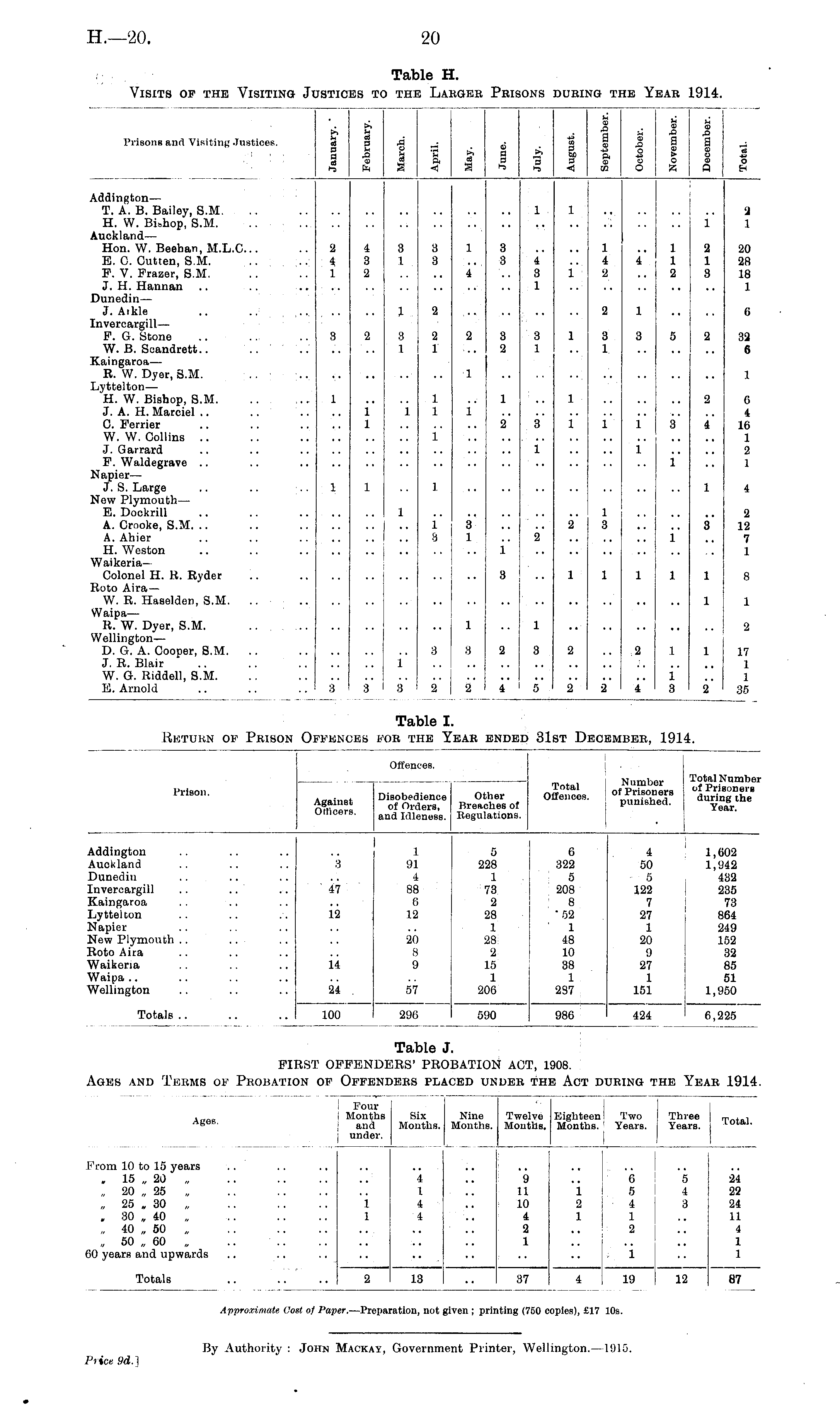 Table H. Visits of the Visiting Justices to the Larger Prisons during the Year 1914.