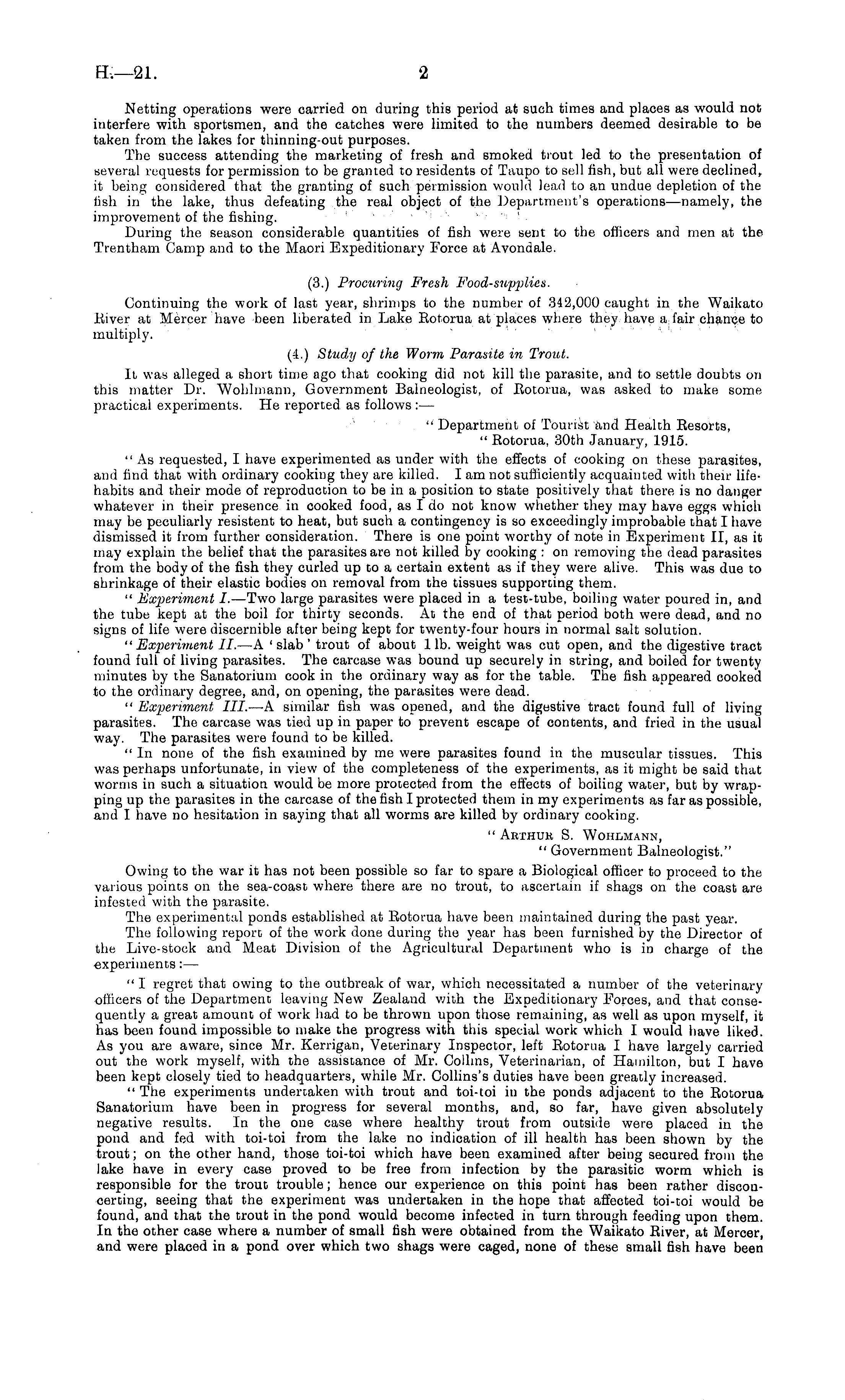 Netting operations were carried on during this period at such times and places as would not interfere with sportsmen, and the catches were limited to the numbers deemed desirable to be taken from the lakes for thinning-out purposes. The success attending the marketing of fresh and smoked trout led to the presentation of several requests for permission to be granted to residents of Taupo to sell fish, but all were declined, it being considered that the granting of such permission would lead to an undue depletion of the fish in the lake, thus defeating the real object of the Department's operations—namely, the improvement of the fishing. ' ; ' During the season considerable quantities of fish were sent to the officers and men at the Trentham Camp and to the Maori Expeditionary Force at Avondale. (3.) Procuring Fresh Food-supplies. Continuing the work of last year, shrimps to the number of 342,000 caught in the Waikato River at Mercer have been liberated in Lake Rotorua at places where they have a fair chance to multiply. (4.) Study of the Worm Parasite in Trout. It was alleged a short time ago that cooking did not kill the parasite, and to settle doubts on this matter Dr. Wohlmann, Government Balneologist, of Rotorua, was asked to make some practical experiments. He reported as follows : — " Department of Tourist and Health Resorts, " Rotorua, 30th January, 1915. " As requested, I have experimented as under with the effects of cooking on these parasites, and find that with ordinary cooking they are killed. lam not sufficiently acquainted with their lifehabits and their mode of reproduction to be in a position to state positively that there is no danger whatever in their presence in cooked food, as I do not know whether they may have eggs which may be peculiarly resistent to heat, but such a contingency is so exceedingly improbable that I have dismissed it from further consideration. There is one point worthy of note in Experiment 11, as it may explain the belief that the parasites are not killed by cooking : on removing the dead parasites from the body of the fish they curled up to a certain extent as if they were alive. This was due to shrinkage of their elastic bodies on removal from the tissues supporting them. " Experiment I. —Two large parasites were placed in a test-tube, boiling water poured in, and the tube kept at the boil for thirty seconds. At the end of that period both were dead, and no signs of life were discernible after being kept for twenty-four hours in normal salt solution. " Experiment II. —A ' slab ' trout of about 1 lb. weight was cut open, and the digestive tract found full of living parasites. The carcase was bound up securely in string, and boiled for twenty minutes by the Sanatorium cook in the ordinary way as for the table. The fish appeared cooked to the ordinary degree, and, on opening, the parasites were dead. " Experiment III. —A similar fish was opened, and the digestive tract found full of living parasites. The carcase was tied up in paper to prevent escape of contents, and fried in the usual way. The parasites were found to be killed. "In none of the fish examined by me were parasites found in the muscular tissues. This was perhaps unfortunate, in view of the completeness of the experiments, as it might be said that worms in such a situation would be more protected from the effects of boiling water, but by wrapping up the parasites in the carcase of the fish I protected them in my experiments as far as possible, and I have no hesitation in saying that all worms are killed by ordinary cooking. " Arthur S. Wohlmann, " Government Balneologist." Owing to the war it has not been possible so far to spare a Biological officer to proceed to the various points on the sea-coast where there are no trout, to ascertain if shags on the coast are infested with the parasite. The experimental ponds established at Rotorua have been maintained during the past year. The following report of the work done during the year has been furnished by the Director of the Live-stock and Meat Division of the Agricultural Department who is in charge of the experiments: — " I regret that owing to the outbreak of war, which necessitated a number of the veterinary officers of the Department leaving New Zealand with the Expeditionary Forces, and that consequently a great amount of work had to be thrown upon those remaining, as well as upon myself, it has been found impossible to make the progress with this special work which I would have liked. As you are aware, since Mr. Kerrigan, Veterinary Inspector, left Rotorua I have largely carried out the work myself, with the assistance of Mr. Collins, Veterinarian, of Hamilton, but I have been kept closely tied to headquarters, while Mr. Collins's duties have been greatly increased. " The experiments undertaken with trout and toi-toi iv the ponds adjacent to the Rotorua Sanatorium have been in progress for several months, and, so far, have given absolutely negative results. In the one case where healthy trout from outside were placed in the pond and fed with toi-toi from the lake no indication of ill health has been shown by the trout; on the other hand, those toi-toi which have been examined after being secured from the lake have in every case proved to be free from infection by the parasitic worm which is responsible for the trout trouble; hence our experience on this point has been rather disconcerting, seeing that the experiment was undertaken in the hope that affected toi-toi would be found, and that the trout in the pond would become infected in turn through feeding upon them. In the other case where a number of small fish were obtained from the Waikato River, at Mercer, and were placed in a pond over which two shags were caged, none of these small fish have been