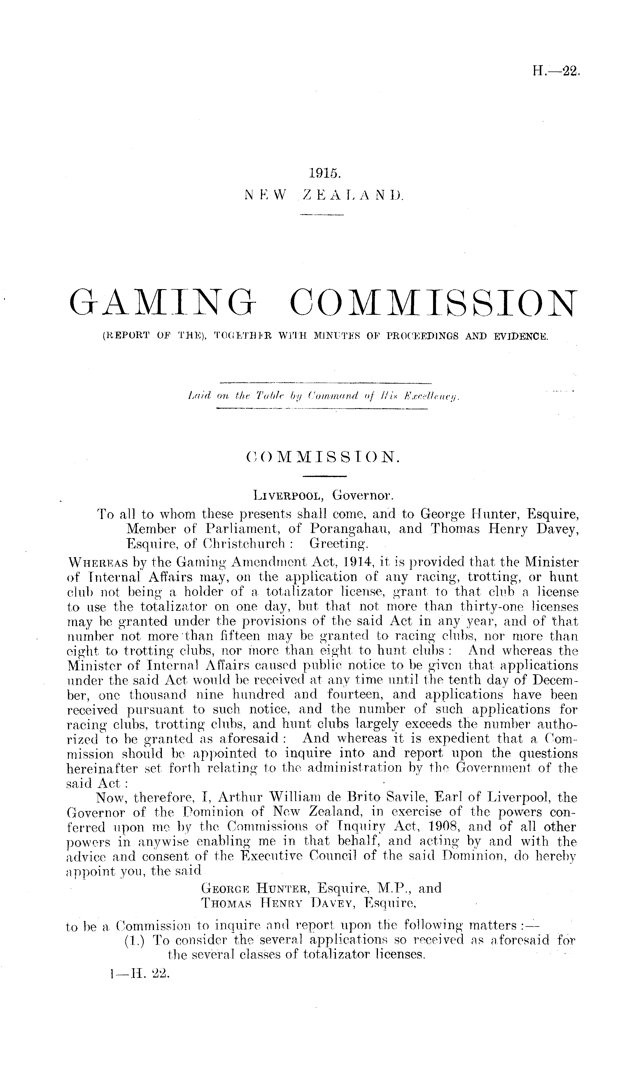COMMISSION. Liverpool, Governor. To all to whom these presents shall come, and to George Hunter, Esquire, Member of Parliament, of Porangah.au, and Thomas Henry Davey, Esquire, of Christchurcb : Greeting. Whereas by the Gaming Amendment Act, 1914, it is provided that the Minister of Internal Affairs may, on the application of any racing, trotting, or hunt club not being a holder of a totalizator license, grant to that club a license to use the totalizator on one day, but that not more than thirty-one licenses may be granted under the provisions of the said Act in any year, and of that number not more than fifteen may be granted to racing clubs, nor more than eight to trotting clubs, nor more than eight to hunt clubs : And whereas the Minister of Internal Affairs caused public notice to be given that applications under the said Act would be received at any time until the tenth day of December, one thousand nine hundred and fourteen, and applications have been received pursuant to such, notice, and the number of such applications for racing clubs, trotting clubs, and hunt clubs largely exceeds the number authorized to be granted as aforesaid : And whereas it is expedient that a Commission should be appointed to inquire into and report upon the questions hereinafter set forth relating to the administration by the Government of the said Act : Now, therefore, I, Arthur William de Brito Savile, Earl of Liverpool, the Governor of the Dominion of New Zealand, in exercise of the powers conferred upon me by the Commissions of Inquiry Act, 1908, and of all other powers in anywise enabling me in that behalf, and acting by and with the advice and consent of the Executive Council of the said Dominion, do hereby appoint you, the said George Pltjnter, Esquire, M.P., and Thomas Henry Davey, Esquire, to be a Commission to inquire and report upon the following matters : — (1.) To consider the several applications so received as aforesaid for the several classes of totalizator licenses.
