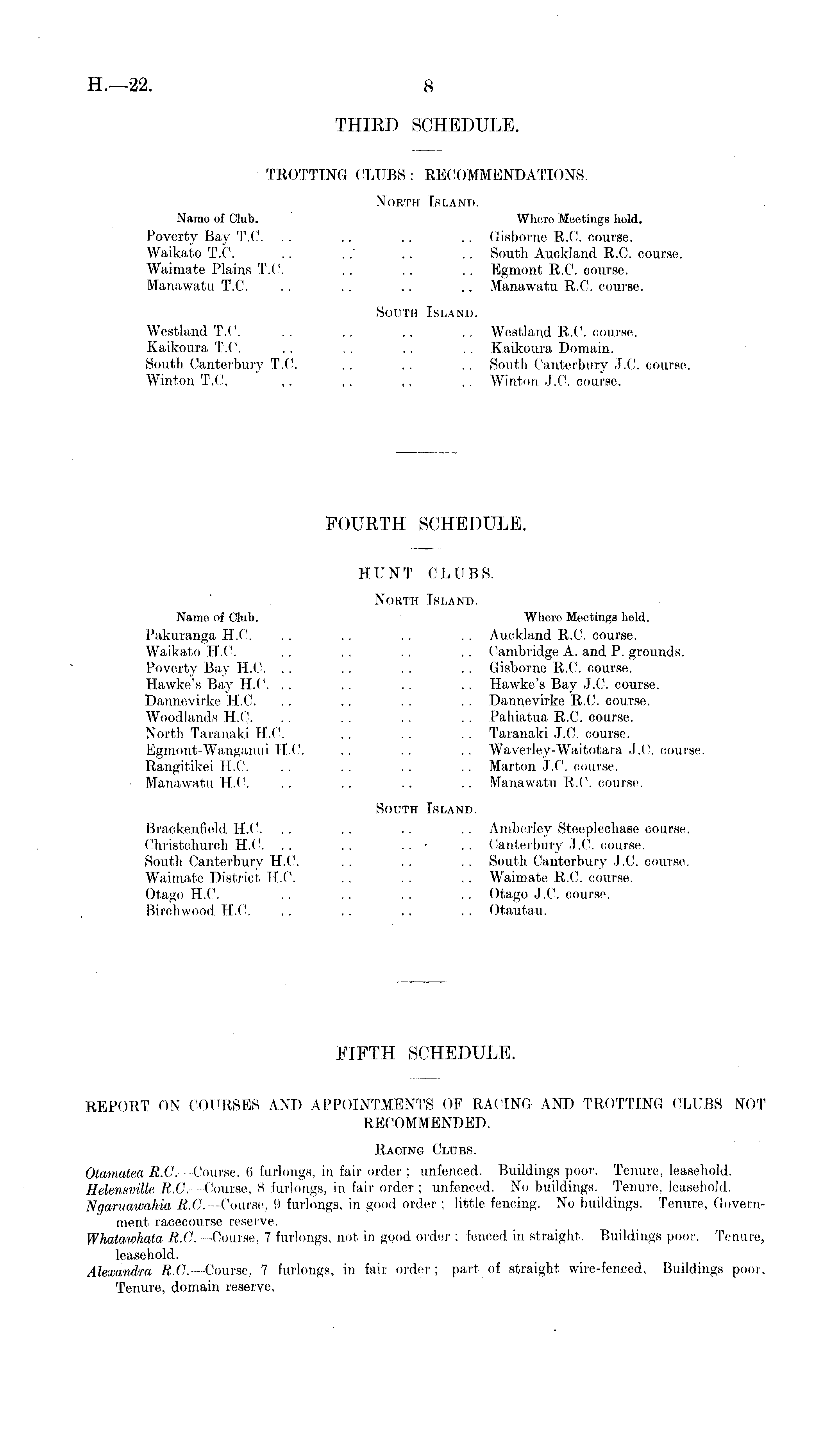 FIFTH SCHEDULE. REPORT ON COURSES ANT) APPOINTMENTS OF RACING AND TROTTING CLUBS NOT RECOMMENDED. Racing Clubs. Otamatea R.C. -Course, 6 furlongs, in fair order ; unfenced. Buildings poor. Tenure, leasehold. Helensville R.C. -Course, 8 furlongs, in fair order ; unfenced. No buildings. Tenure, leasehold. Ngaruawahia R.C. —Course, 9 furlongs, in good order : little fencing. No buildings. Tenure, Government racecourse reserve. Whatawhata R.C. —Course, 7 furlongs, not in good order ; fenced in straight. Buildings poor. Tenure, leasehold. Alexandra B.C.—Course, 7 furlongs, in fair order ; part of straight wire-fenced. Buildings poor. Tenure, domain reserve,