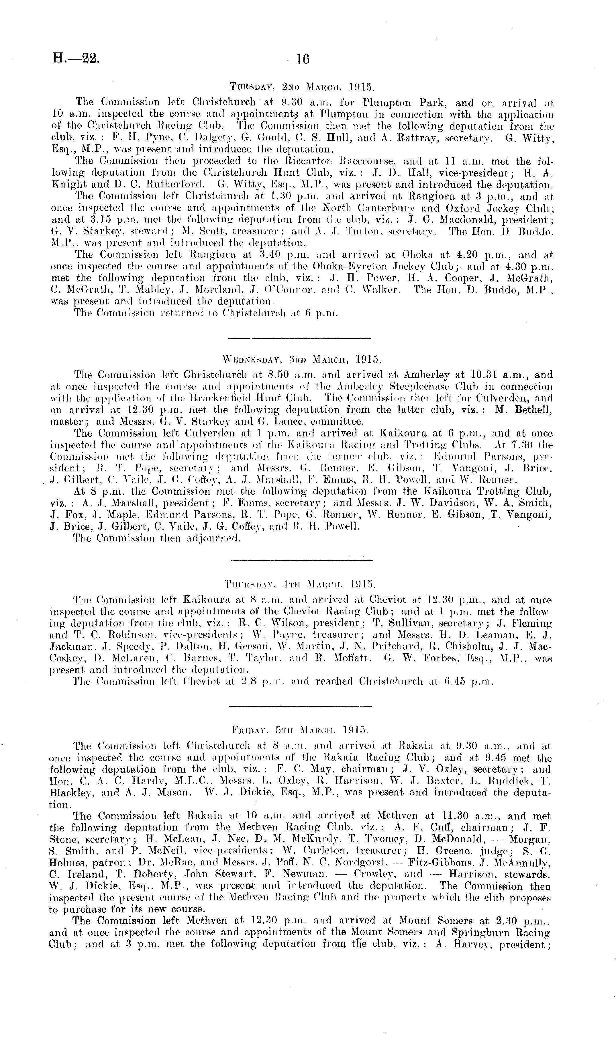 Tuesday. 2nd March, 1915. The Commission left Christchurch at 9.30 a.m. for Plumpton Park, and on arrival at 10 a.m. inspected the course and appointments at Plumpton in connection with the application of the Christchurch Racing Club. The Commission then met the following deputation from the club, viz. :F. 11. Pyne, 0. Dalgety, G. Gould, C. S. Hull, and A. Rattray, secretary. G. Witty, Esq., M.P., was present and introduced (he deputation. The Commission then proceeded to the Riccarton Racecourse, and at II a.m. met the following deputation from the Christchurch Hunt Club, viz. : J. 1). Hall, vice-president; 11. A. Knight and D. C. Rutherford. G. Witty, Esq., M.P., was present and introduced the deputation. The Commission left Christchurch at 1.30 p.m. and arrived at Rangiora at 3 p.m., and at once inspected the course and appointments of the North Canterbury and Oxford Jockey Club; and at 3.15 p.m. met the following deputation from the club, viz. : J. G. Macdonald, president; G. V. Starkey, steward; M. Scott, treasurer; and A. J. Tullon. secretary. The Hon. D, Bmhlo, M.P., was present and introduced the deputation. The Commission left Rangiora at 3.40 p.m. and arrived at Ohoka at 4.20 p.m., and at once inspected the course and appointments of the Ohoka-Eyreton Jockey Club; and at 4.30 p.m. met the following deputation from the club, viz.: J. 11. Power, H. A. Cooper, J. McGrath, C, McGrath, T. Mabley, J. Mortl.and, J. O'Connor, and C. Walker. The Hon. I). Buddo, M.P,, was present and introduced the deputation The Commission returned lo Christchurch at 6 p.m.