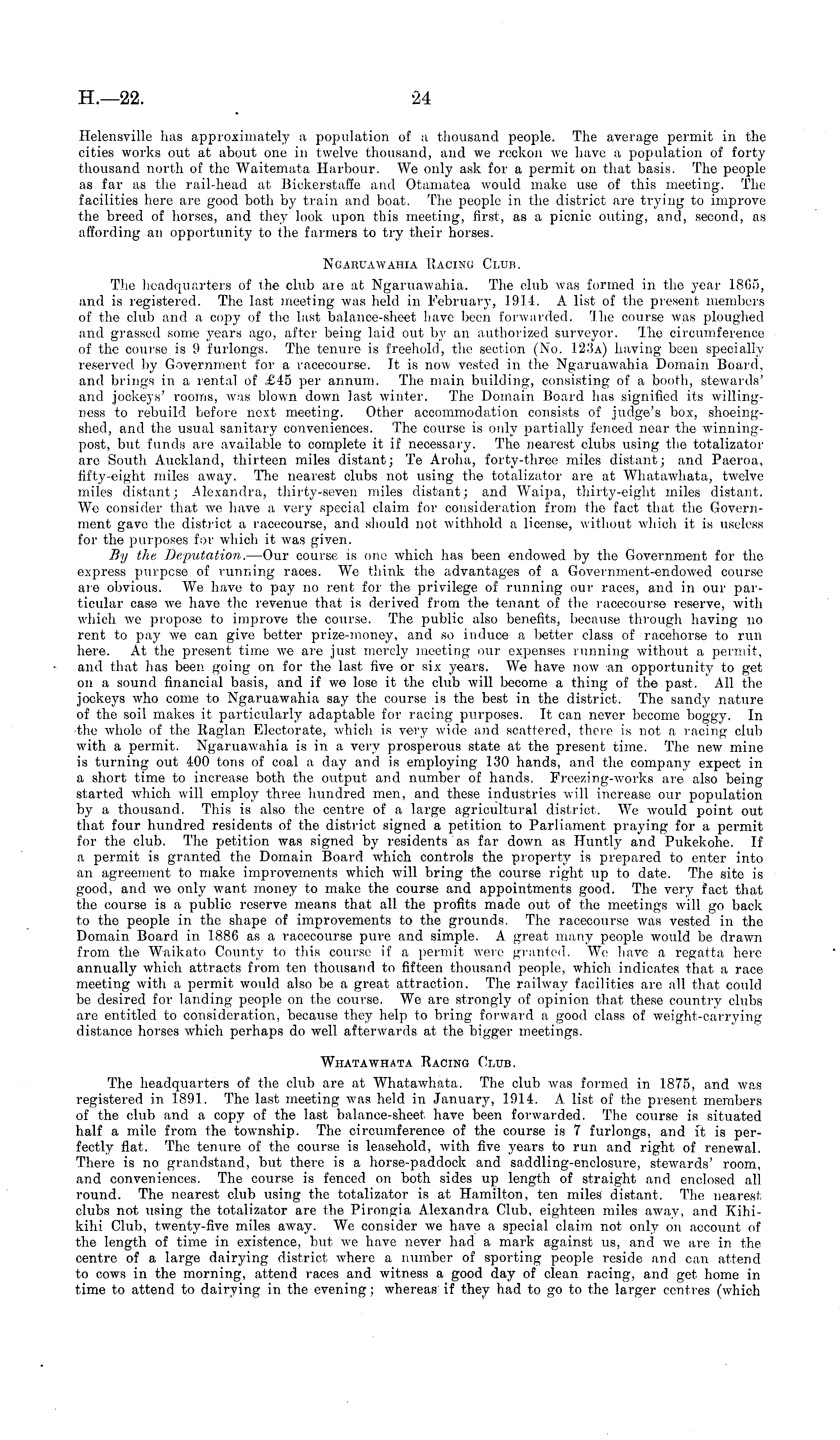 Helensville has approximately a population of a thousand people. The average permit in the cities works out at about one in twelve thousand, and we reckon we have a population of forty thousand north of the Waitemata Harbour. We only ask for a permit on that basis. The people as far as the rail-head at Biokerstaflo and Otamatea would make use of this meeting. The facilities here are good both by train and boat. The people in the district are trying to improve the breed of horses, and they look upon this meeting, first, as a picnic outing, and, second, as affording an opportunity to the farmers to try their horses. Ngaruawahia Racing Club. The headquarters of the club are at Ngaruawahia. The club was formed in the year 1865, and is registered. The last meeting was held in February, 191.4. A list of the present members of the club and a copy of the last balance-sheet have been forwarded. Ihe course was ploughed and grassed some years ago, after being laid out by an authorized surveyor. Ihe circumference of the course is 9 furlongs. The tenure is freehold, the section (No. 123 a) having been specially reserved by Government for a racecourse. It is now vested in the Ngaruawahia Domain Board, and brings in a rental of £45 per annum. The main building, consisting of a booth, stewards' and jockeys' rooms, was blown down last winter. The Domain Board has signified its willingness to rebuild before next meeting. Other accommodation consists of judge's box, shoeingshed, and the usual sanitary conveniences. The course is only partially fenced near the winningpost, but funds are available to complete it if necessary. The nearest clubs using the totalizator are South Auckland, thirteen miles distant; Te Aroha, forty-three miles distant; and Paeroa, fifty-eight miles away. The nearest clubs not using the totalizator are at Whatawhata, twelve miles distant; Alexandra, thirty-seven miles distant; and Waipa, thirty-eight miles distant. We consider that we have a very special claim for consideration from the fact that the Government gave the district a racecourse, and should not withhold a license, without which it is useless for the purposes for which it was given. By the Deputation. —Our course is one which has been endowed by the Government for the express purpose of running races. We think the advantages of a Government-endowed course are obvious. We have to pay no rent for the privilege of running our races, and in our particular case we have the revenue that is derived from the tenant of the racecourse reserve, with which we propose to improve the course. The public also benefits, because through having no rent to pay we can give better prize-money, and so induce a better class of racehorse to run here. At the present time we are just merely meeting our expenses running without a permit, and that has been going on for the last five or six years. We have now an opportunity to get on a sound financial basis, and if we lose it the club will become a thing of the past. All the jockeys who come to Ngaruawahia say the course is the best in the district. The sandy nature of the soil makes it particularly adaptable for racing purposes. It can never become boggy. In ■the whole of the Raglan Electorate, which is very wide and scattered, there is not a racing club with a permit. Ngaruawahia is.in a very prosperous state at the present time. The new mine is turning out 400 tons of coal a day and is employing 130 hands, and the company expect in a short time to increase both the output and number of hands. Freezing-works are also beingstarted which will employ three hundred men, and these industries will increase our population by a thousand. This is also the centre of a large agricultural district. We would point out that four hundred residents of the district signed a petition to Parliament praying for a permit for the club. The petition was signed by residents as far down as Huntly and Pukekohe. If a permit is granted the Domain Board which controls the property is prepared to enter into an agreement to make improvements which will bring the course right up to date. The site is good, and we only want money to make the course and appointments good. The very fact that the course is a public reserve means that all the profits made out of the meetings will go back to the people in the shape of improvements to the grounds. The racecourse was vested in the Domain Board in 1886 as a racecourse pure and simple. A great many people would be drawn from the Waikato County to this course if a permit were granted. We have a regatta here annually which attracts from ten thousand to fifteen thousand people, which indicates that a race meeting with a permit would also be a great attraction. The railway facilities are all that could be desired for landing people on the course. We are strongly of opinion that these country clubs are entitled to consideration, because they help to bring forward a good class of weight-carrying distance horses which perhaps do well afterwards at the bigger meetings. Whatawhata Racing Club. The headquarters of the club are at Whatawhata. The club was formed in 1875, and was registered in 1891. The last meeting was held in January, 1914. A list of the present members of the club and a copy of the last balance-sheet have been forwarded. The course is situated half a mile from the township. The circumference of the course is 7 furlongs, and it is perfectly flat. The tenure of the course is leasehold, with five years to run and right of renewal. There is no grandstand, but there is a horse-paddock and saddling-enclosure, stewards' room, and conveniences. The course is fenced on both sides up length of straight and enclosed all round. The nearest club using the totalizator is at Hamilton, ten miles distant. The nearest clubs not using the totalizator are the Pirongia Alexandra Club, eighteen miles away, and Kihikihi Club, twenty-five miles away. We consider we have a special claim not only on acco