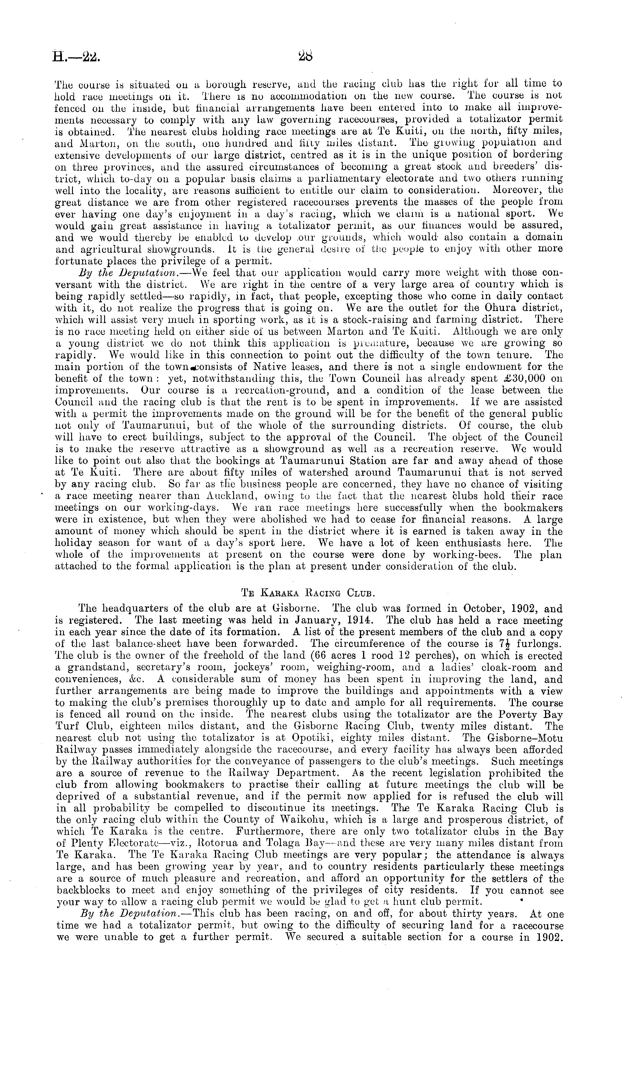 The course is situated oil a borough reserve, and the racing club has the right for all time to hold race meetings on it. There is no accommodation on the new course. The course is not fenced on the inside, but financial arrangements have been entered into to make all improvements necessary to comply with any law governing racecourses, provided a totalizator permit is obtained. The nearest clubs holding race meetings are at Te Kuiti, 011 the north, fifty miles, and Marten, on the south, one hundred and fifty miles distant. The glowing population and extensive developments of our large district, centred as it is in the unique position of bordering on three provinces, and the assured circumstances of becoming a great stock and breeders' district, which to-day on a popular basis claims a parliamentary electorate and two others running well into the locality, are reasons sufficient to entitle our claim to consideration. Moreover, the great distance we are from other registered racecourses prevents the masses of the people from ever having one day's enjoyment in a day's racing, which we claim is a national sport. We would gain great assistance in having a totalizator permit, as our finances would be assured, and we would thereby be enabled to develop our grounds, which would also contain a domain and agricultural showgrounds. It is the general desire of the people to enjoy witli other more fortunate places the privilege of a permit. By the Deputation. —We feel that our application would carry more weight with those conversant with the district. We are right in the centre of a very large area of country which is being rapidly settled —so rapidly, in fact, that people, excepting those who come in daily contact with it, do not realize the progress that is going on. We are the outlet for the Ohura district, which will assist very much in sporting work, as it is a stock-raising and farming district. There is no race meeting held on either side of us between Marton and Te Kuiti. Although we are only a young district we do not think this application is premature, because we are growing so rapidly. We would like in this connection to point out the difficulty of the town tenure. The main portion of the town consists of Native leases, and there is not a single endowment for the benefit of the town : yet, notwithstanding this, the Town Council has already spent £30,000 on improvements. Our course is a recreation-ground, and a condition of the lease between the Council and the racing club is that the rent is to be spent in improvements. If we are assisted with a permit the improvements made on the ground will be for the benefit of the general public not only of Taumarunui, but of the whole of the surrounding districts. Of course, the club will have to erect buildings, subject to the approval of the Council. The object of the Council is to make the reserve attractive as a showground as well as a recreation reserve. We would like to point out also that the bookings at Taumarunui Station are far and away ahead of those at Te Kuiti. There are about fifty miles of watershed around Taumarunui that is not served by any racing club. So far as the business people are concerned, they have no chance of visiting a race meeting nearer than Auckland, owing to the fact that the nearest clubs hold their race meetings on our working-days. We ran race meetings here successfully when the bookmakers were in existence, but when they were abolished we had to cease for financial reasons. A large amount of money which should be spent in the district where it is earned is taken away in the holiday season for want of a day's sport here. We have a lot of keen enthusiasts here. The whole of the improvements at present on the course were done by working-bees. The plan attached to the formal application is the plan at present under consideration of the club. Te Karaka Racing Club. The headquarters of the club are at Gisborne. The club was formed in October, 1902, and is registered. The last meeting was held in January, 1914. The club has held a race meeting in each year since the date of its formation. A list of the present members of the club and a copy of the last balance-sheet have been forwarded. The circumference of the course is 1\ furlongs. The club is the owner of the freehold of the land (66 acres 1 rood 12 porches), on which is erected a grandstand, secretary's room, jockeys' room, weighing-room, and a ladies' cloak-room and conveniences, &c. A considerable sum of money has been spent in improving the land, and further arrangements are being made to improve the buildings and appointments with a view to making the club's premises thoroughly up to date and ample for all requirements. The course is fenced all round on the inside. The nearest clubs using the totalizator are the Povertyßßa r Turf Club, eighteen miles distant, and the Gisborne Racing Club, twenty miles distant. The nearest club not using the totalizator is at Opotiki, eighty miles distant. The Gisborne-Motu Railway passes immediately alongside the racecourse, and every facility has always been afforded by the Railway authorities for the conveyance of passengers to the club's meetings. Such meetings are a source of revenue to the Railway Department. As the recent legislation prohibited the club from allowing bookmakers to practise their calling at future meetings the club will be deprived of a substantial revenue, and if the permit now applied for is refused the club will in all probability be compelled to discontinue its meetings. Tire Te Karaka Racing Club is the only racing club within the County of Waikohu, which is a large and prosperous district, of which Te Karaka is the centre. Furthermore, there are only two totalizator clubs in the Bay of Plenty Electorate—viz., Rotorua and Tolaga Bay—and these are very many miles distant from Te Karaka. The Te Karaka Racing Club meetings are very popular; the attendance is always large, and has been growing y
