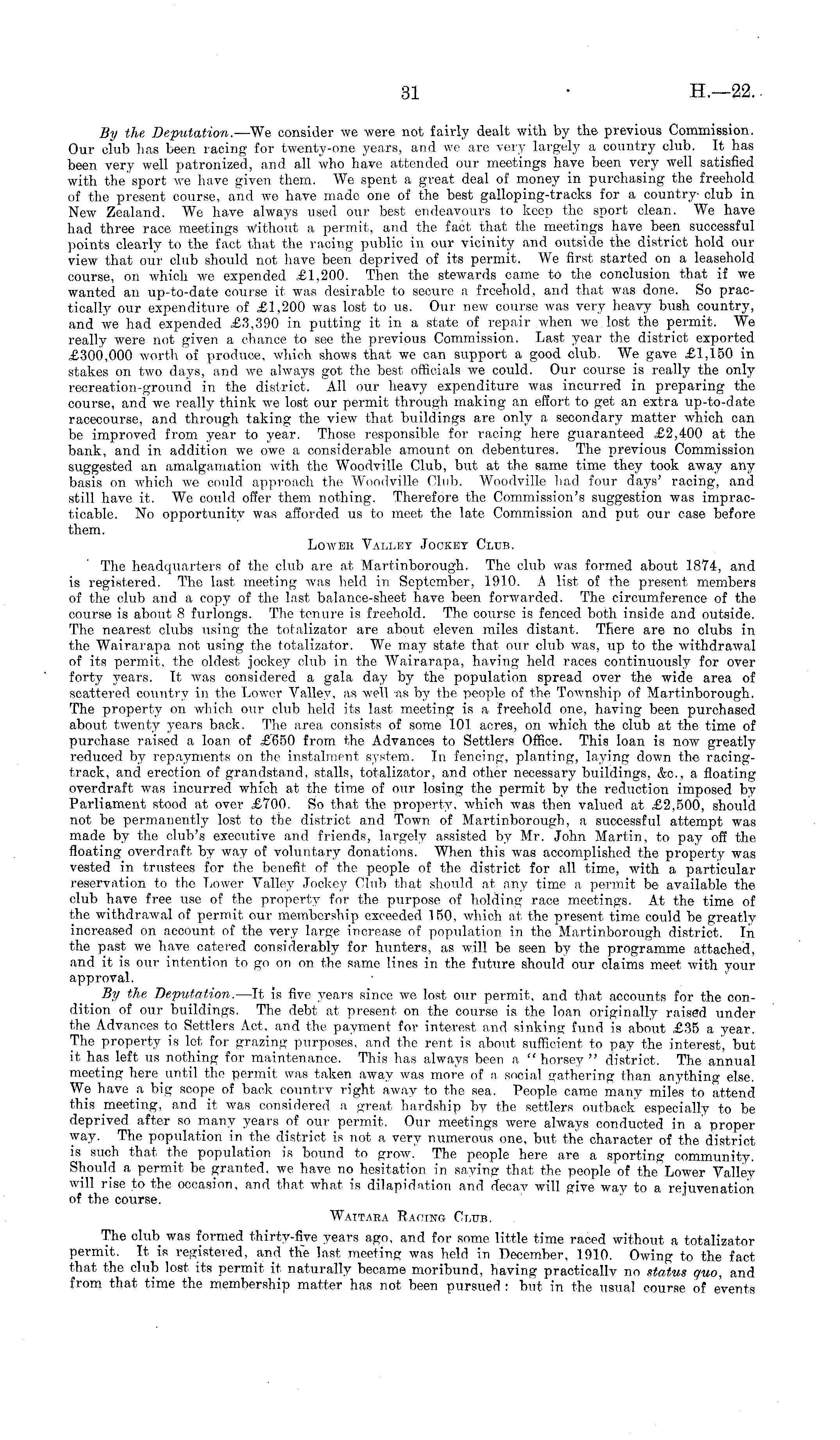 By the Deputation. —We consider we were not fairly dealt with by the previous Commission. Our club has been racing for twenty-one years, and we are very largely a country club. It has been very well patronized, and all who have attended our meetings have been very well satisfied with the sport we have given them. We spent a great deal of money in purchasing the freehold of the present course, and, we have made one of the best galloping-tracks for a country- club in New Zealand. We have always used our best endeavours to keep the sport clean. We have had three race meetings without a permit, and the fact that the meetings have been successful points clearly to the fact that the racing public in our vicinity and outside the district hold our view that our club should not have been deprived of its permit. We first started on a leasehold course, on which we expended £1,200. Then the stewards came to the conclusion that if we wanted an up-to-date course it was desirable to secure a freehold, and that was done. So practically our expenditure of £1,200 was lost to us. Our new course was very heavy bush country, and we had expended £3,390 in putting it in a state of repair when we lost the permit. We really were not given a chance to see the previous Commission. Last year the district exported £300,000 worth of produce, which shows that we can support a good club. We gave £1,150 in stakes on two days, and we always got the best officials we could. Our course is really the only recreation-ground in the district. All our heavy expenditure was incurred in preparing the course, and we really think we lost our permit through making an effort to get an extra up-to-date racecourse, and through taking the view that buildings are only a secondary matter which can be improved from year to year. Those responsible for racing here guaranteed £2,400 at the bank, and in addition we owe a considerable amount on debentures. The previous Commission suggested an amalgamation with the Woodville Club, but at the same time they took away any basis on which we could approach the Woodville Club. Woodville had four days' racing, and still have it. We could offer them nothing. Therefore the Commission's suggestion was impracticable. No opportunity was afforded us to meet the late Commission and put our case before them. Lower Valley Jockey Club. The headquarters of the club are at Martinborough. The club was formed about 1874, and is registered. The last meeting was held in September, 1910. A list of the present members of the club and a copy of the last balance-sheet have been forwarded. The circumference of the course is about 8 furlongs. The tenure is freehold. The course is fenced both inside and outside. The nearest clubs using the totalizator are about eleven miles distant. There are no clubs in the Wairarapa not using the totalizator. We may state that our club was, up to the withdrawal of its permit, the oldest jockey club in the Wairarapa, having held races continuously for over forty years. It was considered a gala day by the population spread over the wide area of scattered country in the Lower Valley, as well as by the people of the Township of Martinborough. The property on which our club held its last meeting is a freehold one, having been purchased about twenty years back. The area consists of some 101 acres, on which the club at the time of purchase raised a loan of £650 from the Advances to Settlers Office. This loan is now greatly reduced by repayments on the instalment system. Tn fencing, planting, laying down the racingtrack, and erection of grandstand, stalls, totalizator, and other necessary buildings, &c, a floating overdraft was incurred which at the time of our losing the permit by the reduction imposed by Parliament stood at over £700. So that the property, which was then valued at £2,500, should not be permanently lost to the district and Town of Martinborough, a successful attempt was made by the club's executive and friends, largely assisted by Mr. John Martin, to pay off the floating overdraft by way of voluntary donations. When this was accomplished the property was vested in trustees for the benefit of the people of the district for all time, with a particular reservation to the Lower Valley Jockey Club that should at any time a permit be available the club have free use of the property for the purpose of holding race meetings. At the time of the withdrawal of permit our membership exceeded 150, which at the present time could he greatly increased on account of the very large increase of population, in the Martinborough district. In the past we have catered considerably for hunters, as will be seen by the programme attached, and it is our intention to go on on the same lines in the future should our claims meet with your approval. By the Deputation. —lt is five years since we lost our permit, and that accounts for the condition of our buildings. The debt at present on the course is the loan originally raised under the Advances to Settlers Act, and the payment for interest and sinking fund is about £35 a year. The property is let for grazing purposes, and the rent is about sufficient to pay the interest', but it has left us nothing for maintenance. This has always been a " horsey " district. The annual meeting here until the permit was taken away was more of a social gathering than anything else. We have a big scope of hack country right away to the sea. People came many miles to attend this meeting, and it was considered a great hardship by the settlers outback especially to be deprived after so many years of our permit. Our meetings were always conducted in a proper way. The population in the district is not a very numerous one, but the character of the district is such that the population is bound to grow. The people here are a sporting community. Should a permit be granted, we have no hesitation in saving that the people of the Lower Valley will rise to the occasion, and t