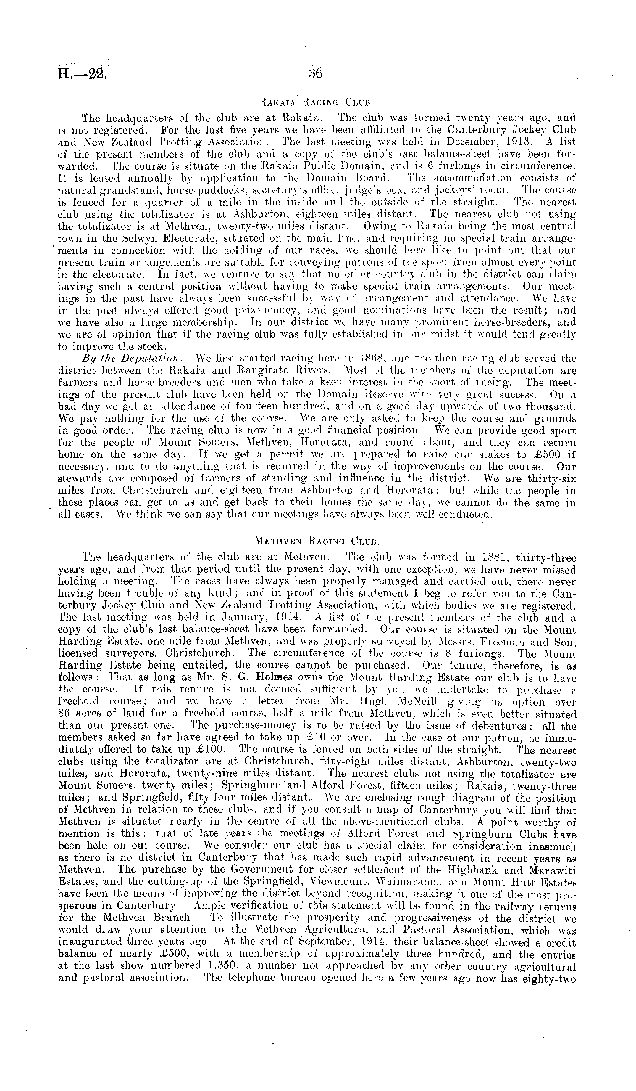 Rakaia Racing Club. The headquarters of the club are at Rakaia. The club was formed twenty years ago, and is not registered. For the last five }-ears we have been affiliated to the Canterbury Jockey Club and New Zealand Trotting Association. The last meeting was held in December, 1913. A list of the present members of the club and a copy of the club's last balance-sheet have been for warded. The course is situate on the Rakaia Public Domain, and is 6 furlongs in circumference. It is leased annually by application to the Domain Hoard. The accommodation consists of natural grandstand, horse-paddocks, secretary's office, judge's box, arid jockeys' room. The course is fenced for a quarter id' a mile in the inside and the outside of the straight. The 1 nearest club using the totalizator is at Ashburton, eighteen miles distant. The nearest club not using the totalizator is at Methven, twenty-two miles distant. Owing to Rakaia being the most central town in the Selwyn Electorate, situated on the main line, and requiring no special train arrangements in connection with the holding of our races, we should here like to point out that our present train arrangements are suitable for conveying patrons of the sport from almost every point in the electorate. In fact, we venture to say that no other country club in the district can claim having such a central position without having to make special train arrangements. Our meetings in the past have always been successful by way of arrangement and attendance. We have in the past always offered good prize-money, and good nominations have been the result; and we have also a large membership. In our district we have many prominent horse-breeders, and we are of opinion that if the racing club was fully established in our midst it would tend greatly to improve the stock. By the, Deputation. —We first started racing here in 1868, and the then racing club served the district between the Rakaia and Rangitata Rivers. Most of the members of the deputation are farmers and horse-breeders and men who take a keen interest in the sport of racing. The meetings of the present club have been held on the Domain Reserve with very great success. On a bad day we get an attendance of fourteen hundred, and on a good day upwards of two thousand. We pay nothing for the use of the course. We are only asked to keep* the course and grounds in good order. The racing club is now in a good financial position. We can provide good sport for the people of Mount Somers, Methven, Hororata, and round about, and they can return home on the same day. If we get a permit we are prepared to raise our stakes to £500 if necessary, and to do anything' that is required in the way of improvements on the course. Our stewards are composed of farmers of standing and influence in the district. We are thirty-six miles from Christchurch and eighteen from Ashburton and Hororata; but while the people in these places can get to us and get back to their homes the same day, we cannot do the same in all cases. We think we can say that our meetings have always been well conducted. Methven Racing Club. Ihe headquarters of the club are at Methven. The club was formed in 1881, thirty-three years ago, and from that period until the present day, with one exception, we have never missed holding a meeting, 'flic races have always been properly managed and carried out, there never having been trouble of any kind; and in proof of this statement I beg to refer you to the Canterbury Jockey Club and New Zealand Trotting Association, with which bodies we are registered. The last meeting was held in January, 1914. A list of the present members of the club and a copy of the club's last balance-sheet have been forwarded. Our course is situated on the Mount Harding Estate, one mile from Methven, and was properly surveyed by Messrs. Freeman and Sou, licensed surveyors, Christchurch. The circumference of the course is 8 furlongs. The Mount Harding Estate being entailed, the course cannot be purchased. Our tenure, therefore, is as follows : That as long as Mr. S. G. Holmes owns the Mount Harding Estate our club is to have the course. If this tenure is not deemed sufficient by you we undertake to purchase a freehold course; and we have a letter from Mr. Hugh McNeill giving us option over 86 acres of land for a freehold course, half a, mile from Methven, which is even better situated than our present one. The purchase-money is to be raised by the issue of debentures : all the members asked so far have agreed to take up £10 or over. In the case of our patron, he immediately offered to take up £100. The course is fenced on both sides of the straight. The nearest clubs using the totalizator are at Christchurch, fifty-eight miles distant, Ashburton, twenty-two miles, and Hororata, twenty-nine miles distant. The nearest clubs not. using the totalizator are Mount Somers, twenty miles; Springburn and Alford Forest, fifteen miles; Rakaia, twenty-three miles; and Springfield, fifty-four miles distant. We are enclosing rough diagram of the position of Methven in relation to these clubs, and if you consult a map of Canterbury you will find that Methven is situated nearly in the centre of all the above-mentioned clubs. A point worthy of mention is this : that of late years the meetings of Alford Forest and Springburn Clubs have been held on our course. We consider our club has a special claim for consideration inasmuch as there is no district in Canterbury that has made such rapid advancement in recent years as Methven. The purchase by the Government for closer settlement of the Highbank and Marawiti Estates, and the cutting-up of the Springfield, Viewmouiri, Waimarama, and Mount Hutt Estates have been the means of improving the district beyond recognition, making it one of the most prosperous in Canterbury Ample verification of this statement will be found in the railway returns for the Methven Branch. To illustrate the prosperity and progres
