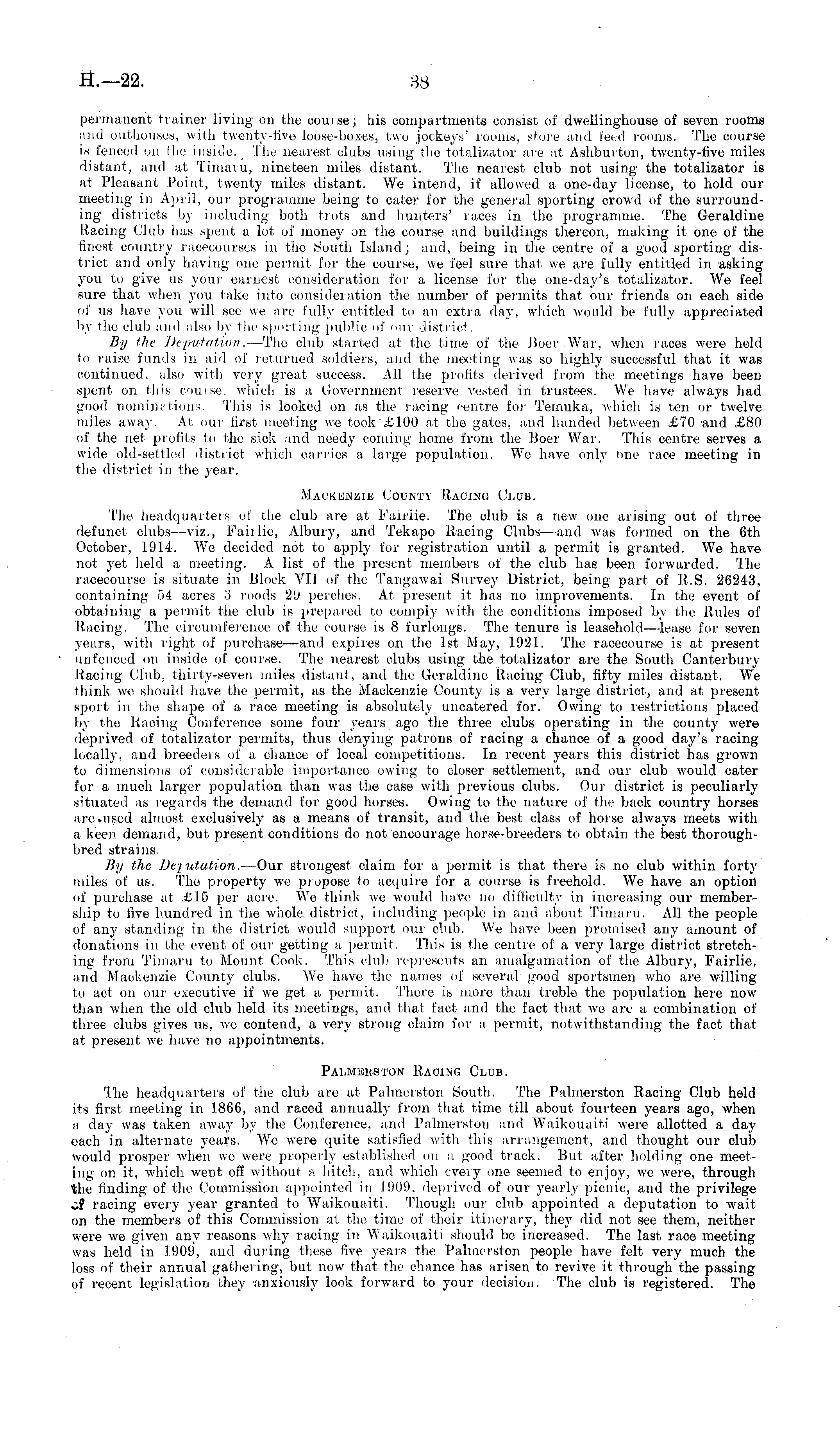perrhanent trainer living on the course; his compartments consist of dwellinghouse of seven rooms and outhouses, with twenty-five loose-boxes, two jockeys' rooms, store and feed rooms. The course is fenced on the inside. i The nearest clubs using the totalizator are at Ashburton, twenty-five miles distant, and at Timaru, nineteen miles distant. The nearest club not using the totalizator is at Pleasant Point, twenty miles distant. We intend, if allowed a one-day license, to hold our meeting in April, our programme being to cater for the general sporting crowd of the surrounding districts by including both trots and hunters' races in the programme. The Geraldine Racing Club has spent a lot of money on the course and buildings thereon, making it one of the finest country racecourses in the South Island; and, being in the centre of a good sporting district and only having one permit for the course, we feel sure that we are fully entitled in asking you to give us your earnest consideration for a license for the one-day's totalizator. We feel sure that when you take into consideration the number of permits that our friends on each side of us have you will see we are fully entitled to an extra day, which would be fully appreciated by the club and also by the sporting public of our district. By the Deputation. —The club started at the time of the Boer War, when races were held to raise funds in aid of returned soldiers, and the meeting was so highly successful that it was continued, also with very great success. All the profits derived from the meetings have been spent on this couise, which is a Government reserve vested in trustees. We have always had good nominations. This is looked on as the racing centre for Temuka, which is ten or twelve miles away. At our first meeting we took £100 at the gates, and handed between £70 and £80 of the net profits to the sick and needy coming home from the Boer "War. This centre serves a wide old-settled district which carries a large population. We have only one race meeting in the district in the year. Mackenzie County Racing Club. The headquarters of the club are at Fairlie. The club is a new one arising out of three defunct clubs —viz., Fairlie, Aibury, and Tekapo Racing Clubs —and was formed on the 6th October, 1914. We decided not to apply for registration until a permit is granted. We have not yet held a meeting. A list of the present members of the club has been forwarded. Ihe racecourse is situate in Block Vfl of the Tangawai Survey District, being part of R.S. 26243, containing 54 acres 3 roods 29 perches. At present it has no improvements. In the event of obtaining a permit the club is prepared to comply with the conditions imposed, by the Rules of Racing, The circumference of the course is 8 furlongs. The tenure is leasehold—lease for seven years, with right of purchase—and expires on the Ist May, 1921. The racecourse is at present unfenced on inside of course. The nearest clubs using the totalizator are the South Canterbury Racing Club, thirty-seven miles distant, and the Geraldine Racing Club, fifty miles distant. We think we should have the permit, as the Mackenzie County is a very large district, and at present sport in the shape of a race meeting is absolutely uncatered for. Owing to restrictions placed by the Racing Conference some four years ago the three clubs operating in the county were deprived of totalizator permits, thus denying patrons of racing a chance of a good day's racing locally, and breeders of a chance of local competitions. In recent years this district has grown to dimensions of considerable importance owing to closer settlement, and our club would cater for a much larger population than was the case with previous clubs. Our district is peculiarly situated as regards the demand for good horses. Owing to the nature of the back country horses are .used almost exclusively as a means of transit, and the best class of horse always meets with a keen demand, but present conditions do not encourage horse-breeders to obtain the best thoroughbred strains. By the Deputation. —Our strongest claim for a permit is that there is no club within forty miles of us. The property we propose to acquire for a course is freehold. We have an option of purchase at £15 per acre. We think we would have no difficulty in increasing our membership to five hundred in the whole, district, including people in and about Timaru. All the people of any standing in the district would support our club. We have been promised any amount of donations in the event of our getting a permit. This is the centre of a very large district stretching from Timaru to Mount Cook. This club represents an amalgamation of the Aibury, Fairlie, and Mackenzie County clubs. We have the names of several good sportsmen who are willing to act on our executive if we get a permit. There is more than treble the population here now than when the old club held its meetings, and that fact and the fact that we are a combination of three clubs gives us, we conteud, a very strong claim for a permit, notwithstanding the fact that at present we have no appointments. Palmerston Racing Club. Ihe headquarters of the club are at Palmerston South. The Palmerston Racing Club held its first meeting in 1866, and raced annually from that time till about fourteen years ago, when a day was taken away by the Conference, and Palmerston and Waikouaiti were allotted a day each in alternate years. We were quite satisfied with this arrangement, and thought our club would prosper when we were properly established on a good track. But after holding one meeting on it, which went off without a hitch, and which every one seemed to enjoy, we were, through the finding of the Commission appointed in 190!), deprived of our yearly picnic, and the privilege Ji racing every year granted to Waikouaiti. Though our club appointed a deputation to wait on the members of this Commission at the time of their itinerar