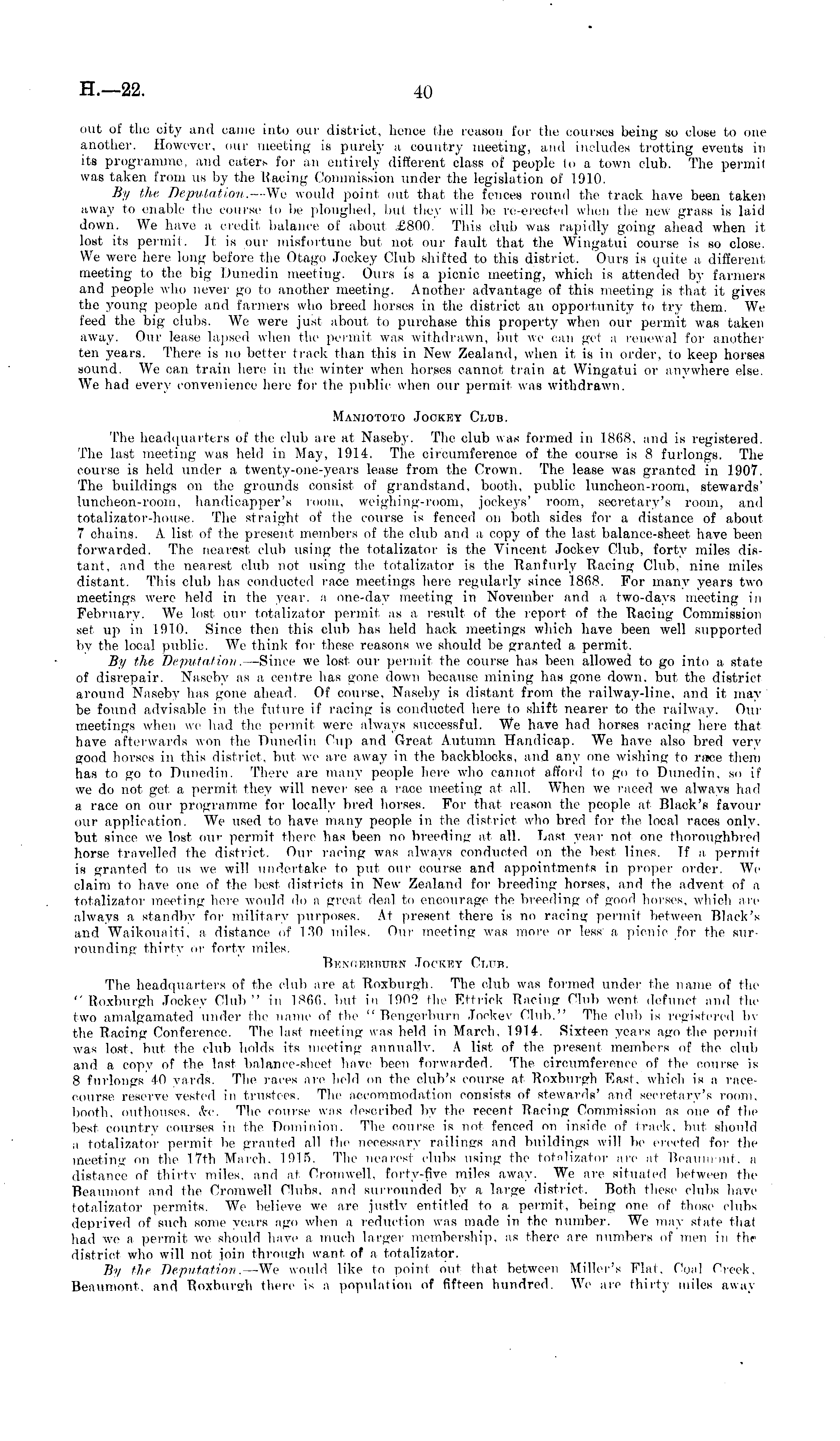 out of the city and came into our district, hence the reason for the courses being so close to one another. However, our meeting is purely a country meeting, ami includes trotting events in its programme, and caters for an entirely different class of people to a town club. The permit was taken from us by the Racing Commission under the legislation of 1910. By the Deputation. —We would point out that the fences round the track have been taken away to enable the course to he ploughed, but they will lie re-erected when the new grass is laid down. We have a, credit balance of about £800. This club was rapidly going ahead when if lost its permit. It is our misfortune but not our fault that the Wingatui course is so close. We were here long before the Otago Jockey Club shifted to this district. Ours is quite a, different meeting to the big Dunedin meeting. Ours is a picnic meeting, which is attended by farmers and people who never go to another meeting. Another advantage of this meeting is that it gives the young people and farmers who breed horses in the district an opportunity to try them. We feed the big clubs. We were just about to purchase this property when our permit was taken away. Our lease lapsed when the permit was withdrawn, but we can gel a renewal for another ten years. There is no better track than this in New Zealand, when it, is in order, to keep horses sound. We can train here in the winter when horses cannot train at Wingatui or anywhere else. We had every convenience here for the public when our permit was withdrawn. Maniototo Jockey Club. The headquarters of the club are at Naseby. The club was formed in 1868. and is registered. The last meeting was held in May, 1914. The circumference of the course is 8 furlongs. The course is held under a twenty-one-years lease from the Crown. The lease was granted in 1907. The buildings on the grounds consist of grandstand, booth, public luncheon-room, stewards' luncheon-room, handicapper's room, weighing-room, jockeys' room, secretary's room, and totalizator-house. The straight of Ihe course is fenced on both sides for a distance of about 7 chains. A list of the present members of the club and a copy of the last balance-sheet have been forwarded. The nearest dub using the totalizator is the Vincent Jockey Club, forty miles distant, and the nearest club not using the totalizator is the Ranfurly Racing Club, nine miles distant. This club has conducted race meetings here regularly since 1868. For many years two meetings were held in the year, a one-day' meeting in November and a two-days meeting in February. We lost our totalizator permit, as a result of the report of the Racing Commission set up in 1910. Since then this club has held hack meetings which have been well supported by the local public. We think for these reasons we should be granted a permit. By the Deputation. —Since we lost our permit the course has been allowed to go into a state of disrepair. Naseby as a centre has gone down because mining has gone down, but the district around Nasebv has gone ahead. Of course, Naseby is distant from the railway-line, and it may be found advisable in the future if racing is conducted here to shift nearer to the railway. Our meetings when we had the permit were always successful. We have had horses racing here that have afterwards won the Dunedin Cup and Great Autumn Handicap. We have also bred very good horses in this district, but we are away in the backblocks, and any one wishing to raoe them has to go to Dunedin. There are many people here who cannot afford to go to Dunedin. so if we do not get a permit they will never see a race meeting at all. When we raced we always hail a race on our programme for locally bred horses. For that reason the people at Black's favour our application. We used to have many people in the district who bred for the local races only, but since we lost our permit there has been no breeding at all. Last year not one thoroughbred horse travelled the district. Our racing was always conducted on the best lines. Tf a permit is granted to us we will undertake to put our course and appointments in proper order. We claim to have one of the best districts in New Zealand for breeding horses, and the advent of a totalizator meeting hero would do a groat deal to encourage the breeding of good horses, which are always a standby for military purposes. At present there is no racing permit between Black's and Waikouaiti, a distance of 130 miles. Our meeting was more or less a picnic for the surrounding thirty or forty miles. Bknqhebuen Jockey Club. The headquarters of the club are at Roxburgh. The club was formed under the name of the ''Roxburgh Jockey Club" in 1866. but in 1902 Ihe Ett rick Racing Club went defunel and the two amalgamated under the name of the " Bengerburn Jockey Club." The club is registered by the Racing Conference. The last meeting was held in March. 1914. Sixteen years ago the permit was lost, but the club holds its meeting annually. A list of the present members of the club and a copy of the last balance-sheet have been forwarded. The circumference of the course is 8 furlongs 40 yards. The races are held on (lie club's course at Roxburgh East, which is a racecourse reserve vested in trustees. The accommodation consists of stewards' and secretary's room. booth, outhouses, he. The course was described by the recent Racing Commission as one of the best country courses in the Dominion. The course is not fenced on inside of I rack, bul should a totalizator permit be granted all Ihe necessary railings and buildings will be elected for the meeting on the 17th March. 1915. 'Ihe nearesl clubs using Ihe totalizator are al Beaunnnt. a distance of thirty miles, and at Cromwell, forty-five miles away. We are situated between the Beaumont and the Cromwell Clubs, and surrounded by a large district. Both these clubs have totalizator permits. We believe we are justly entitled to a permit, being one of those clubs 