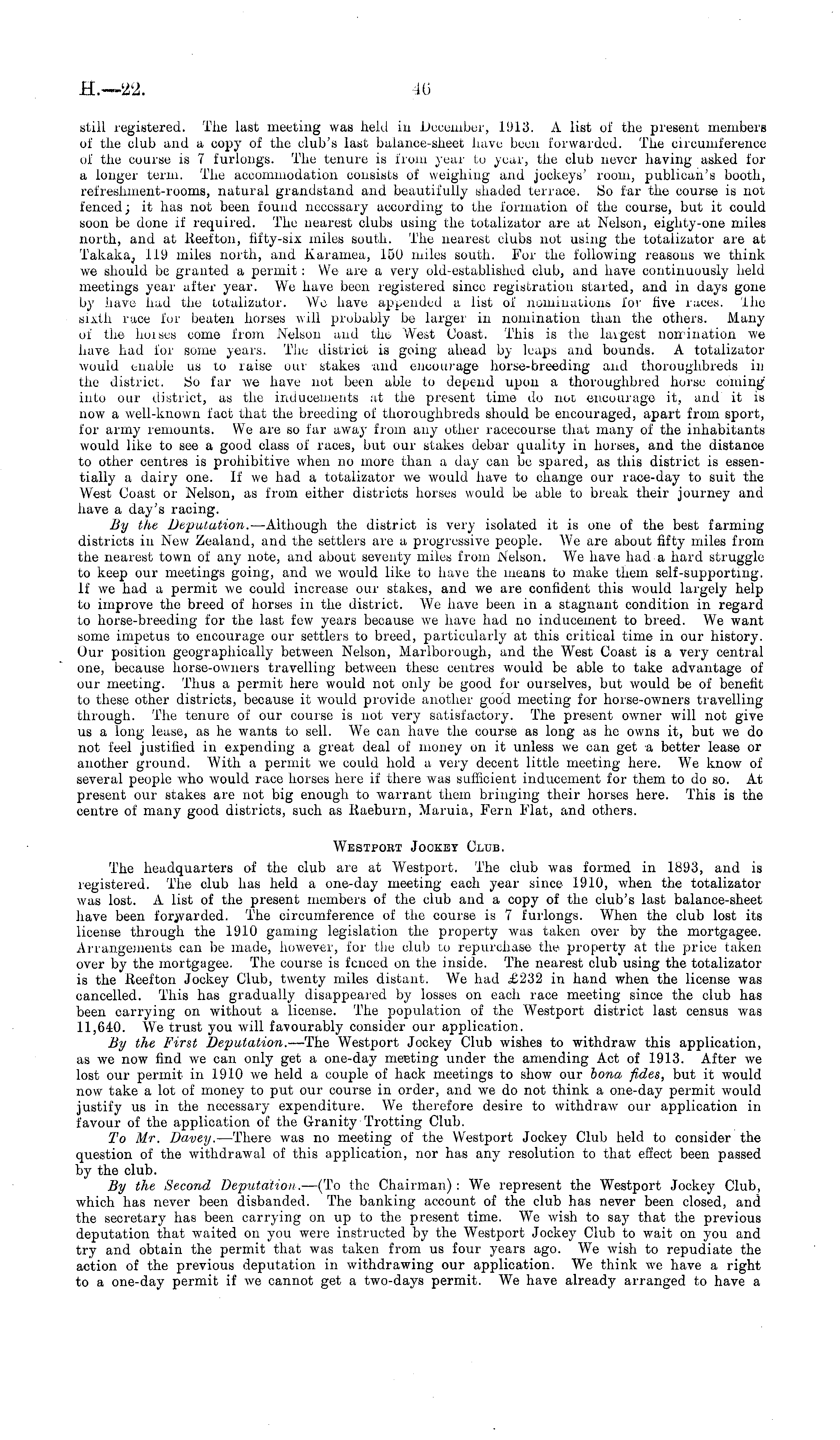 still registered. The last meeting was held in December, 1913. A list of the present members of the club and a copy of the club's last balance-sheet have been forwarded. The circumference of the course is 7 furlongs. The tenure is from year to year, the club never having asked for a longer term. The accommodation consists of weighing and jockeys' room, publican's booth, refreshment-rooms, natural grandstand and beautifully shaded terrace. So far the course is not fenced; it has not been found necessary according to the formation of the course, but it could soon be done if required. The nearest clubs using the totalizator are at Nelson, eighty-one miles north, and at Reefton, fifty-six miles south. The nearest clubs not using the totalizator are at Takaka, 119 miles north, and Karamea, 150 miles south. For the following reasons we think we should be granted a permit : We are a very old-established club, and have continuously held meetings year after year. We have been registered since registration started, and in days gone by have had the totalizator. We have appended a list of nominations for five races. Ihe sixth race for beaten horses will probably be larger in nomination than the others. Many of the hoi ses come from Nelson and the West Coast. This is the lavgest nomination we have had for some years. The district is going ahead by leaps and bounds. A totalizator would enable us to raise our stakes and encourage horse-breeding and thoroughbreds in the district. So far we have not been able to depend upon a thoroughbred horse coming into our district, as the inducements at the present time do not encourage it, and it is now a well-known fact that the breeding of thoroughbreds should be encouraged, apart from sport, for army remounts. We are so far away from any other racecourse that many of the inhabitants would like to see a good class of races, but our stakes debar quality in horses, and the distance to other centres is prohibitive when no more than a day can be spared, as this district is essentially a dairy one. If we had a totalizator we would have to change our race-day to suit the West Coast or Nelson, as from either districts horses would be able to break their journey and have a day's racing. By the Deputation. —Although the district is very isolated it is one of the best farming districts in New Zealand, and the settlers are a progressive people. We are about fifty miles from the nearest town of any note, and about seventy miles from Nelson. We have had a hard struggle to keep our meetings going, and we would like to have the means to make them self-supporting. If we had a permit yve could increase our stakes, and we are confident this would largely help to improve the breed of horses in the district. We have been in a stagnant condition in regard to horse-breeding for the last few years because we have had no inducement to breed. We want some impetus to encourage our settlers to breed, particularly at this critical time in our history. Our position geographically between Nelson, Marlborough, and the West Coast is a very central one, because horse-owners travelling between these centres would be able to take advantage of our meeting. Thus a permit here would not only be good for ourselves, but would be of benefit to these other districts, because it would provide another good meeting for horse-owners travelling through. The tenure of our course is not very satisfactory. The present owner will not give us a long lease, as he wants to sell. We can have the course as long as he owns it, but we do not feel justified in expending a great deal of money on it unless we can get a better lease or another ground. With a permit we could hold a very decent little meeting here. We know of several people who would race horses here if there was sufficient inducement for them to do so. At present our stakes are not big enough to warrant them, bringing their horses here. This is the centre of many good districts, such as Raeburn, Maruia, Fern Flat, and others. Westport Jockey Club. The headquarters of the club arc at Westport. The club was formed in 1893, and is registered. The club has held a one-day meeting each year since 1910, when the totalizator was lost. A list of the present members of the club and a copy of the club's last balance-sheet have been forjvarded. The circumference of the course is 7 furlongs. When the club lost its license through the 1910 gaming legislation the property was taken over by the mortgagee. Arrangements can be made, however, for the club 10 repurchase the property at the price taken over by the mortgagee. The course is fenced on the inside. The nearest club using the totalizator is the Reefton Jockey Club, twenty miles distant. We had £232 in hand when the license was cancelled. This has gradually disappeared by losses on each race meeting since the club has been carrying on without a license. The population of the Westport district last census was 11,640. We trust you will favourably consider our application. By the First Deputation. —The Westport Jockey Club wishes to withdraw this application, as we now find we can only get a one-day meeting under the amending Act of 1913. After we lost our permit in 1910 we held a couple of hack meetings to show our bona fides, but it would now take a lot of money to put our course in order, and we do not think a one-day permit would justify us in the necessary expenditure. We therefore desire to withdraw our application in favour of the application of the Granity Trotting Club. To Mr. Davey. —There was no meeting of the Westport Jockey Club held to consider the question of the withdrawal of this application, nor has any resolution to that effect been passed by the club. By the Second Deputation. —(To the Chairman) : We represent the Westport Jockey Club, which has never been disbanded. The banking account of the club has never been closed, and the secretary has been carrying on up to the present time. We wish to