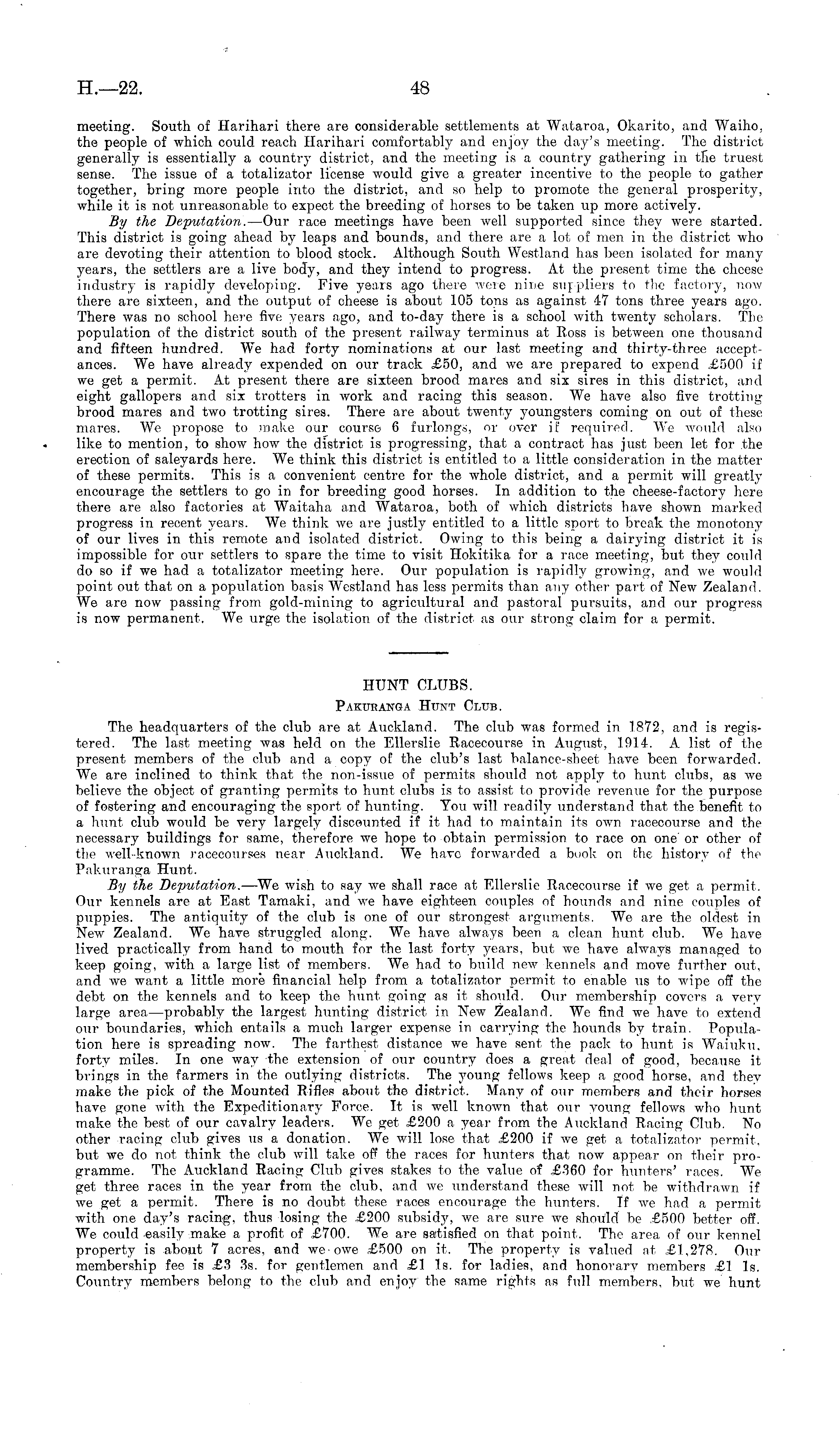 meeting. South of Harihari there are considerable settlements at Wataroa, Okarito, and Waiho, the people of which could reach Harihari comfortably and enjoy the day's meeting. The district generally is essentially a country district, and the meeting is a country gathering in the truest sense. The issue of a totalizator license would give a greater incentive to the people to gather together, bring more people into the district, and so help to promote the general prosperity, while it is not unreasonable to expect the breeding of horses to be taken up more actively. By the Deputation. —Our race meetings have been well supported since they were started. This district is going ahead by leaps and bounds, and there are a lot of men in the district who are devoting their attention to blood stock. Although South Westland has been isolated for many years, the settlers are a live body, and they intend to progress. At the present time the cheese industry is rapidly developing. Five years ago there were nine suppliers to the factory, now there are sixteen, and the output of cheese is about 105 tons as against 47 tons three years ago. There was no school here five years ago, and to-day there is a school with twenty scholars. The population of the district south of the present railway terminus at Ross is between one thousand and fifteen hundred. We had forty nominations at our last meeting and thirty-three acceptances. We have already expended on our track £50, and we are prepared to expend £500 if we get a permit. At present there are sixteen brood mares and six sires in this district, and eight gallopers and six trotters in work and racing this season. We have also five trotting brood mares and two trotting sires. There are about twenty youngsters coming on out of these mares. We propose to make our course 6 furlongs, or over if required. We would also like to mention, to show how the district is progressing, that a contract has just been let for the erection of saleyards here. We think this district is entitled to a little consideration in the matter of these permits. This is a convenient centre for the whole district, and a permit will greatly encourage the settlers to go in for breeding good horses. In addition to the cheese-factory here there are also factories at Waitaha and Wataroa, both of which districts have shown marked progress in recent years. We think we are justly entitled to a little sport to break the monotony of our lives in this remote and isolated district. Owing to this being a dairying district it is impossible for our settlers to spare the time to visit Hokitika for a race meeting, but they could do so if we had a totalizator meeting here. Our population is rapidly growing, and we would point out that on a population basis Westland has less permits than any other part of New Zealand. We are now passing from gold-mining to agricultural and pastoral pursuits, and our progress is now permanent. We urge the isolation of the district as our strong claim for a permit.
